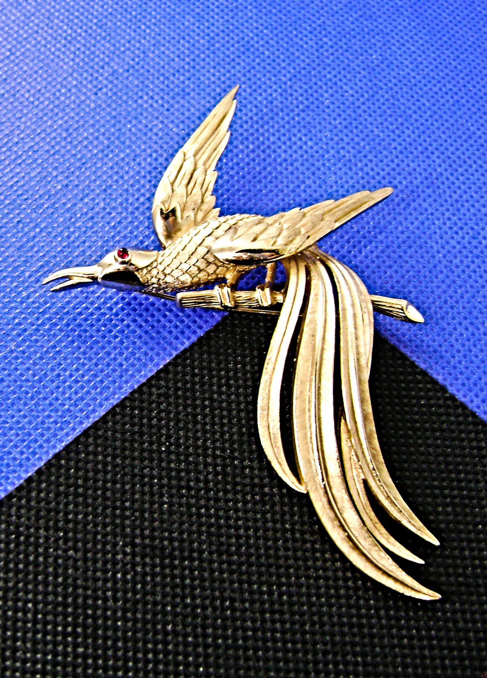 Crown Trifari bird of paradise brooch. From the Tailored Bird series. It was in an advertisement, named Birds of Fashion, which i'll post in the comment section. With a red cabochon eye. 3-1/2" T by 2-1/2" W. Late 1950's