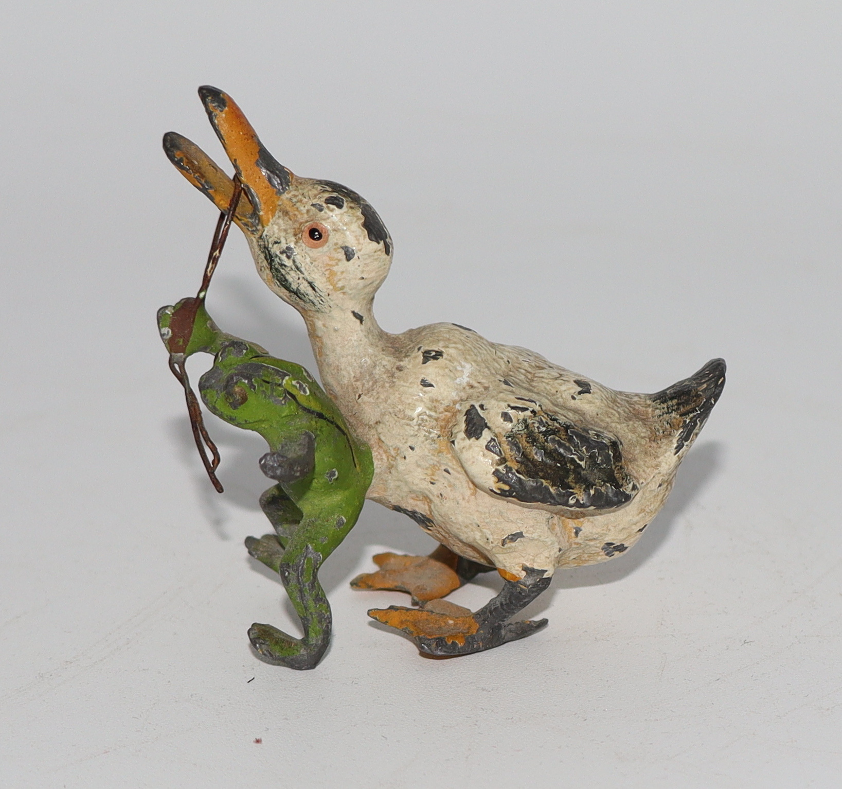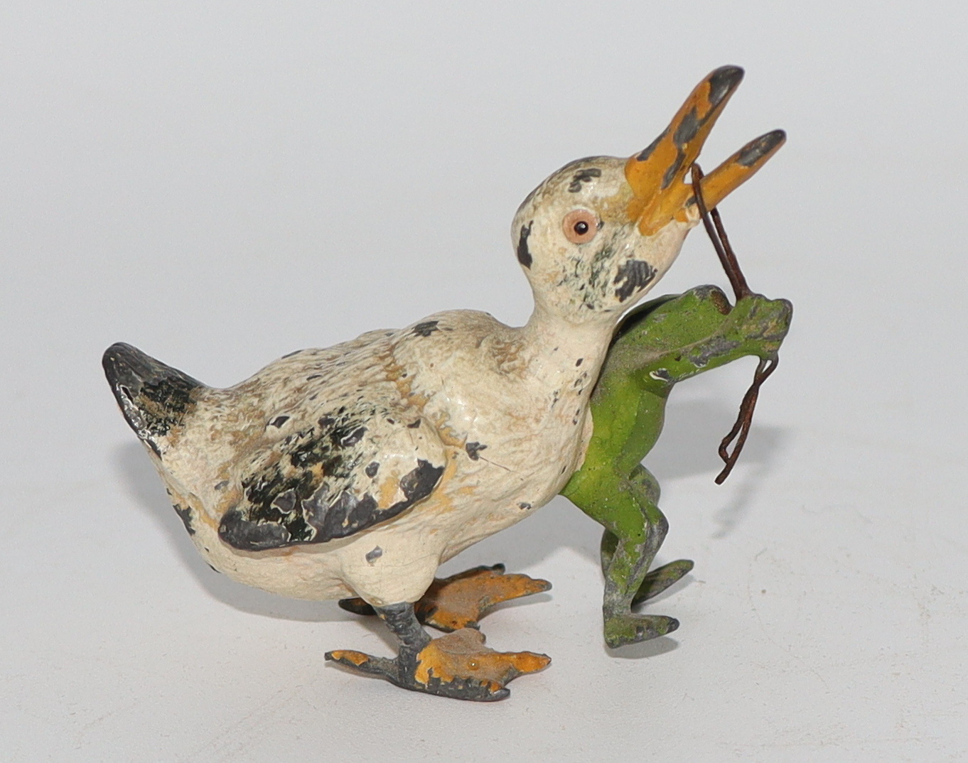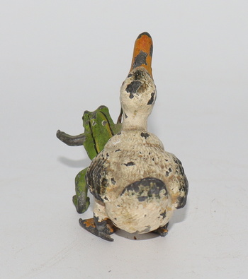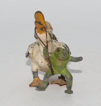 I think we all need something that'll make us smile every now and again. This little frog leading a duck sure makes me smile when I see it. I was digging thru a small trunk and came across this one that I'd forgotten about. Anyway, he's made of lead and probably early to mid 20th century. This was more than likely a party favor back in the days of yore. It's a rather small piece and measures only 1 3/4" tall and 2 1/4" long. I hope it puts a smile on your face like it does mine!