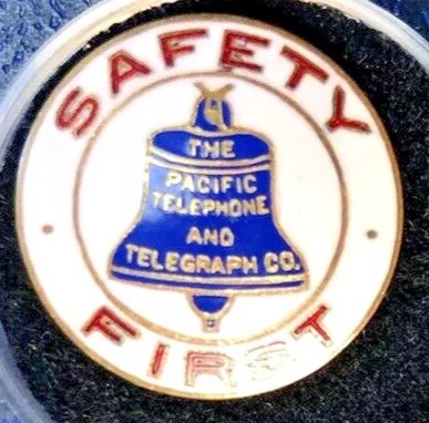 A rare and unique SAFETY FIRST pin awarded by The Pacific Telephone and Telegraph Co.