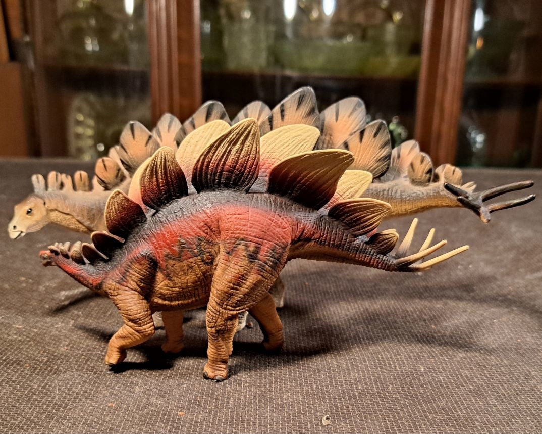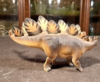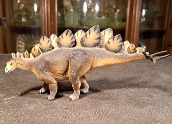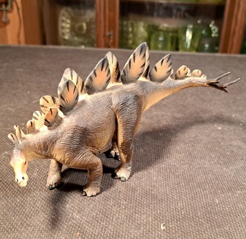 This is the latest version of Stegosaurus by Safari Ltd. It has much more horizontal backside than earlier versions. Also it is a bit larger at over 8 inches. The earlier classic version has the head close to the ground with a high arched back and the tail and thagomizer close to the ground. In photo 4 I have one of the older versions in front of it for comparison.