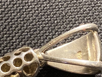 I’ve just rediscovered this lovely massive pendant, I guess CZ but I don’t know anything about it, had it close to 10 years, but only seen it 3/4 times. I found that this has what looks like a full set of marks on the jump ring, very tiny tho so can’t see them
