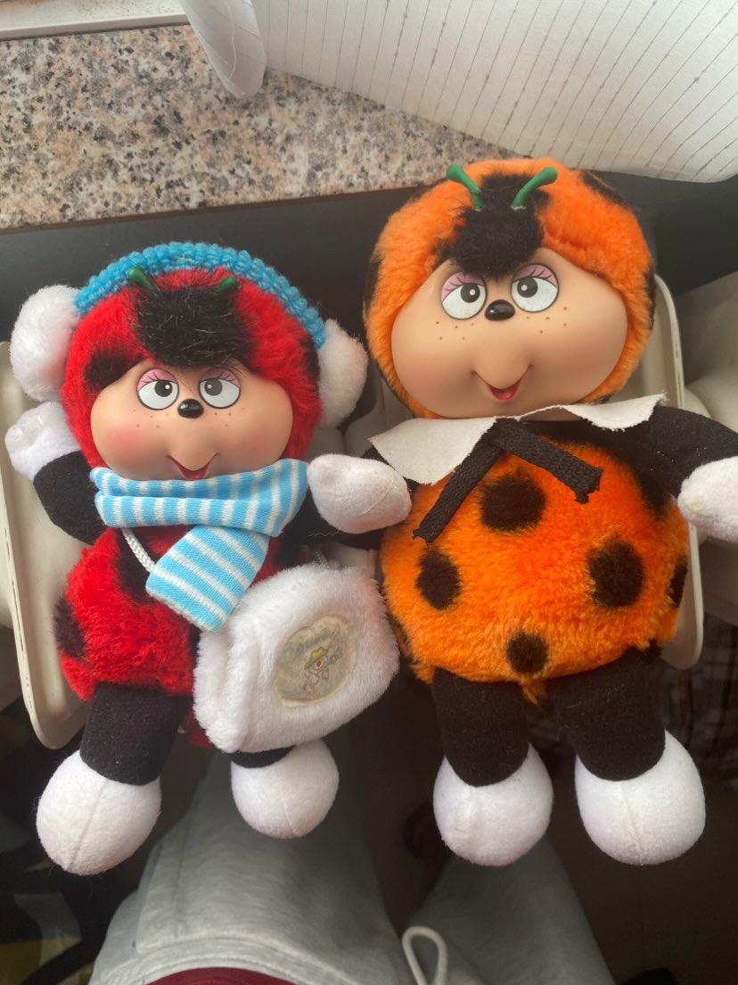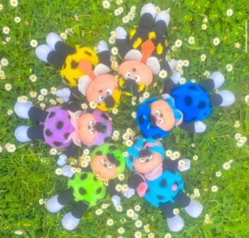 She is a red carmen colored female ladybug with green antennae, she wears a white lace collar on her neck with a green bow as well. When she is not using her magic clover she normally wears it on the right side of her belly, although like what happens with the position of her sister Babicinel's magic heart she sometimes wears it on her chest. She is the only one along with the bee Levallois to wear eye shadow, she has it in a pastel pink color.