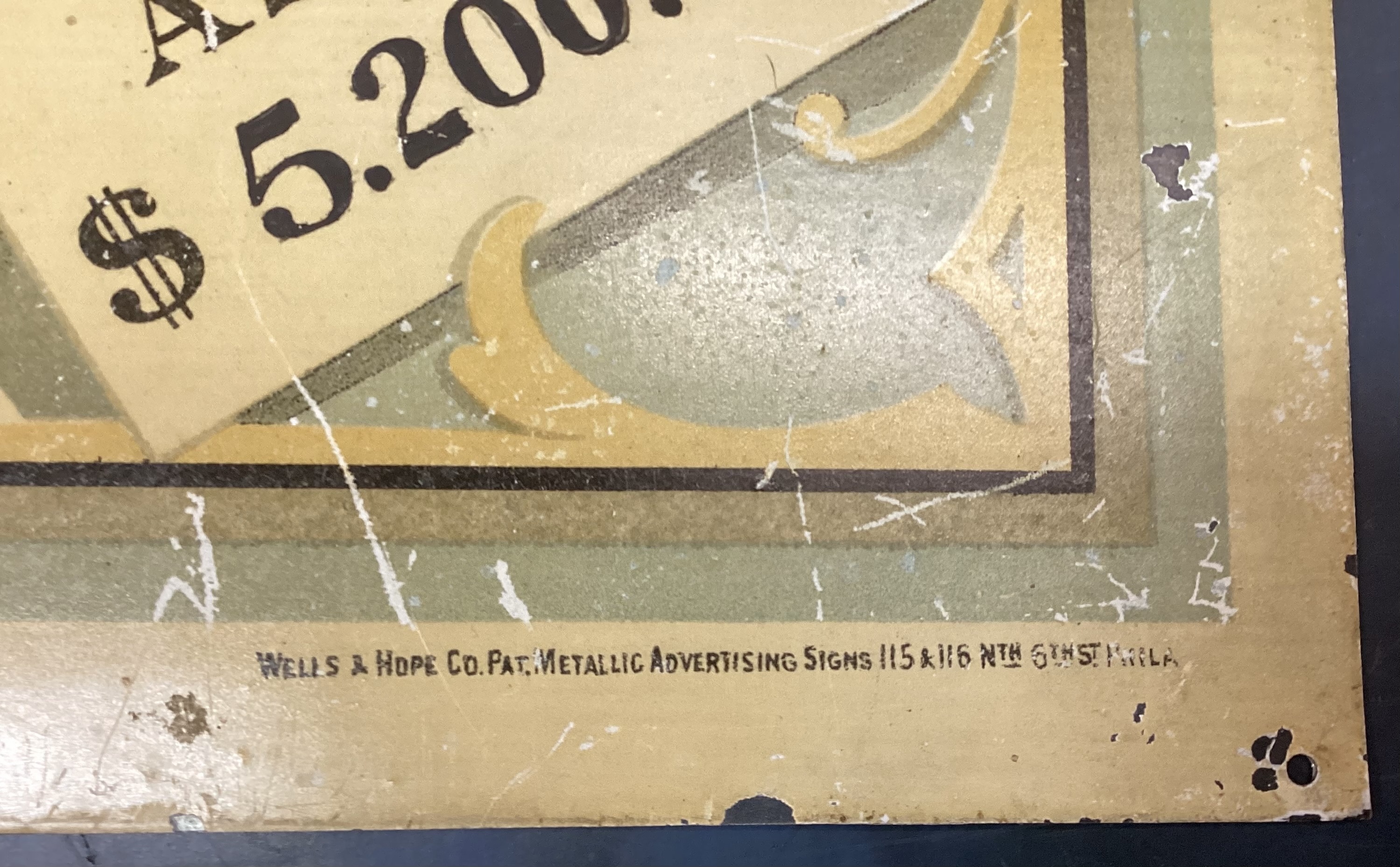 Wells & Hope was established at 115-116 N 6th St in 1872 and moved to Vine St in 1875, dating this one as an early in the company's history. Wells & Hope is well known for their brewery signs, but the central image on this one ranks it right up there with them.