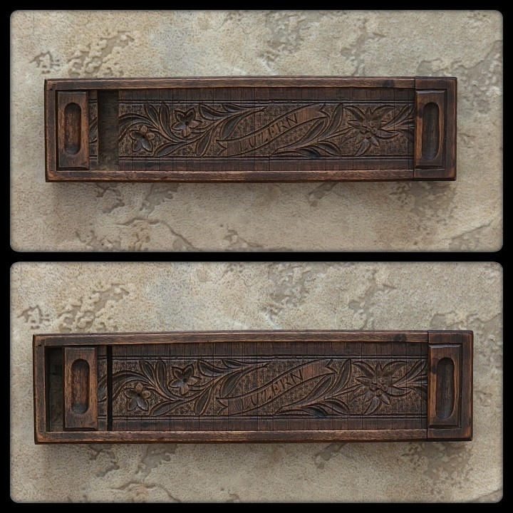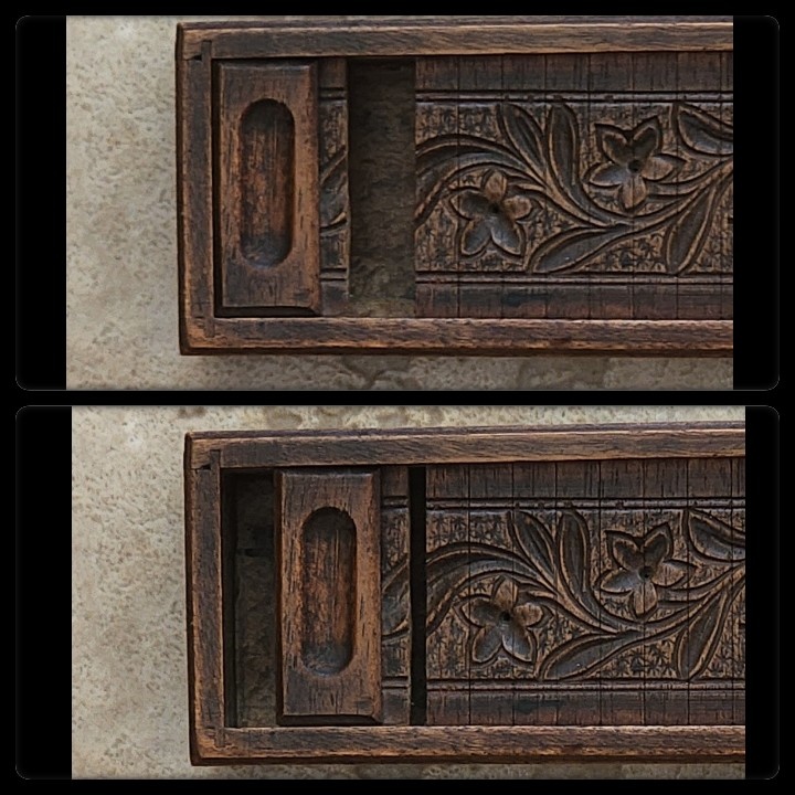 I have a vintage wooden carved box in the shape of a pencil box. However, its top left side has a small section that moves. There is no other access to the box.