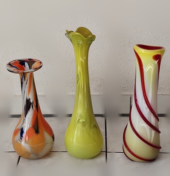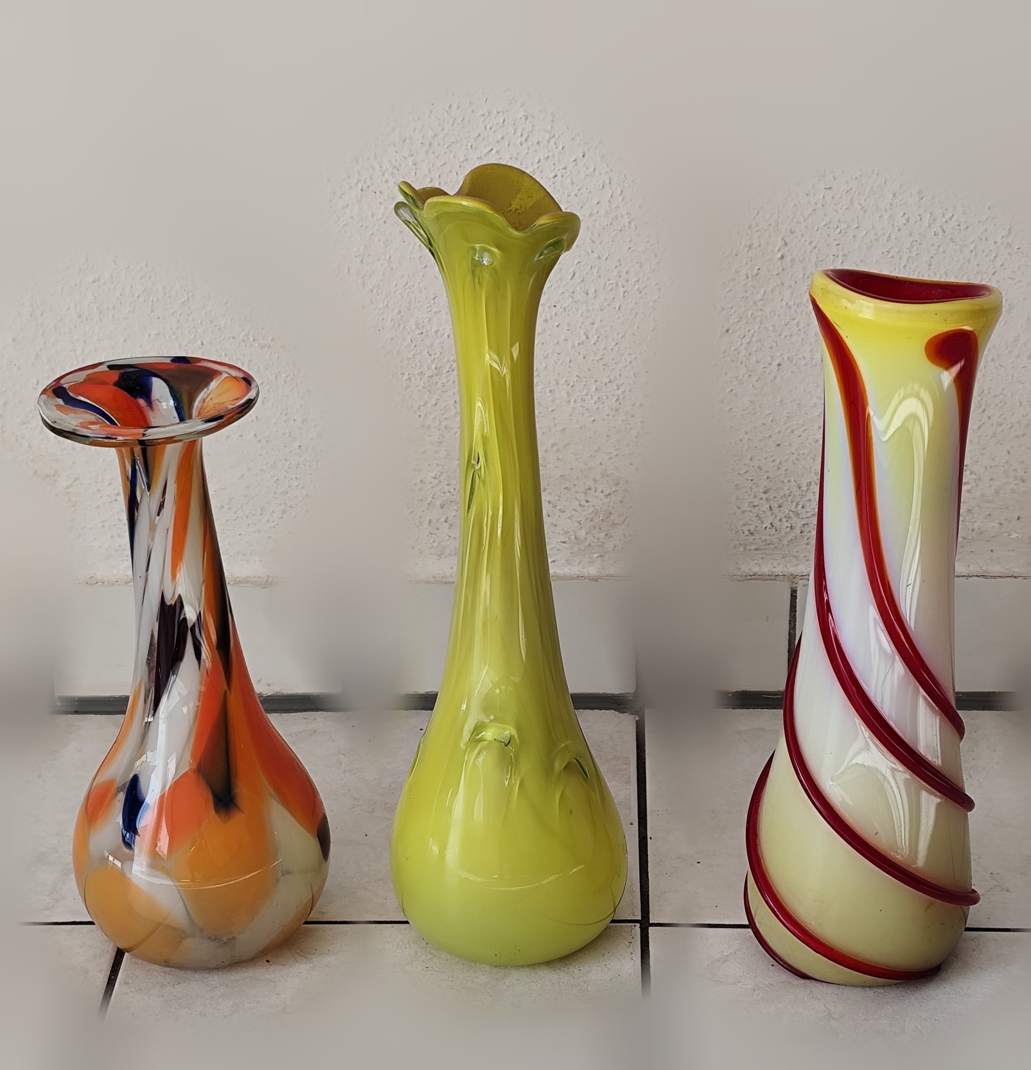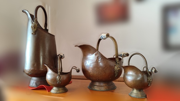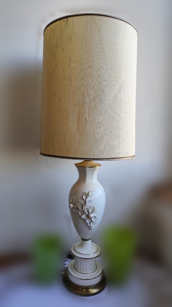 Porcelanowa lampa sto?owa. Wys - 95cm z kloszem. Szk?o (wazony) kolorowe. Komplet starych miedzianych i mosi??nych pojemników na w?giel z uchwytem