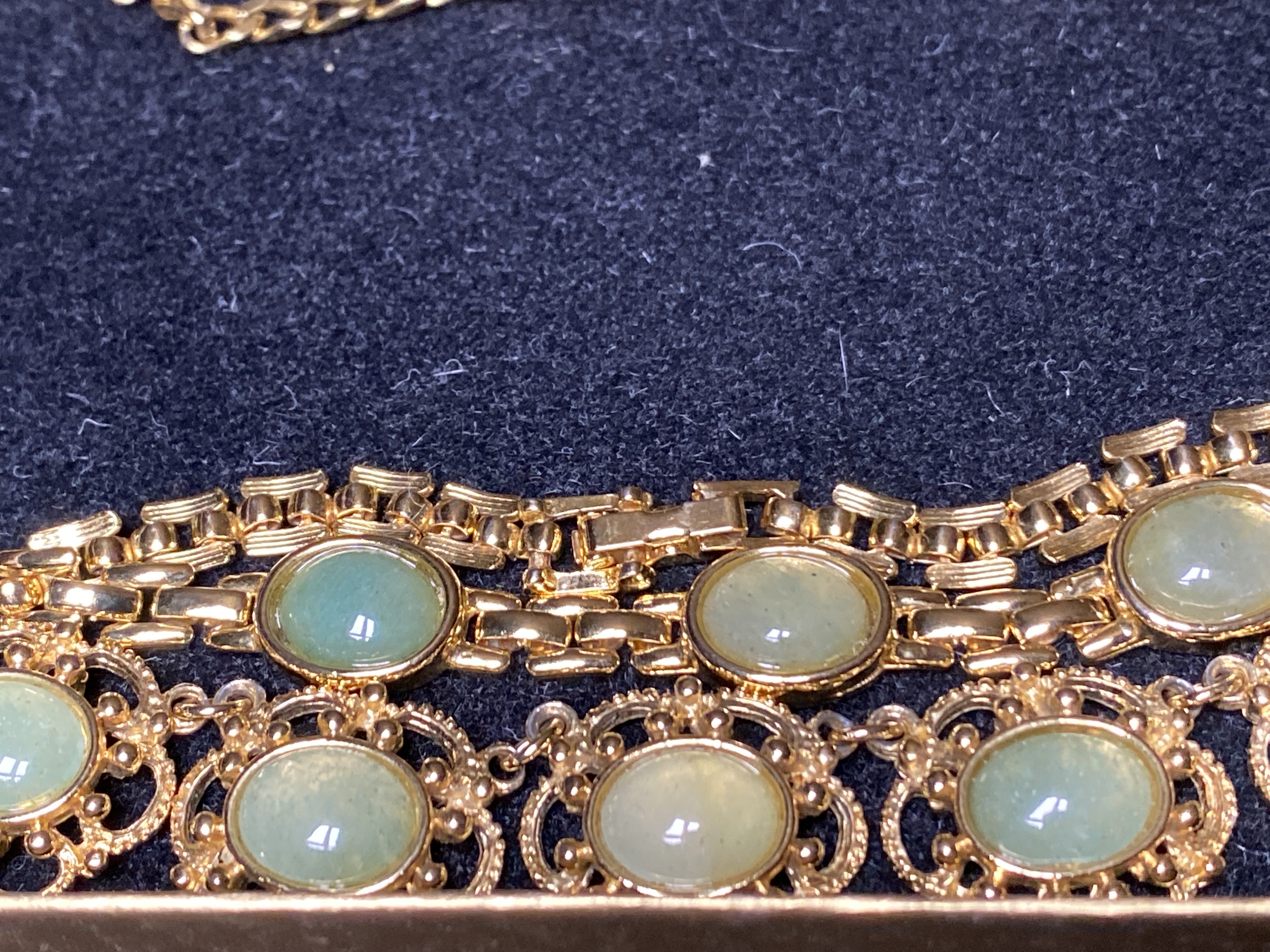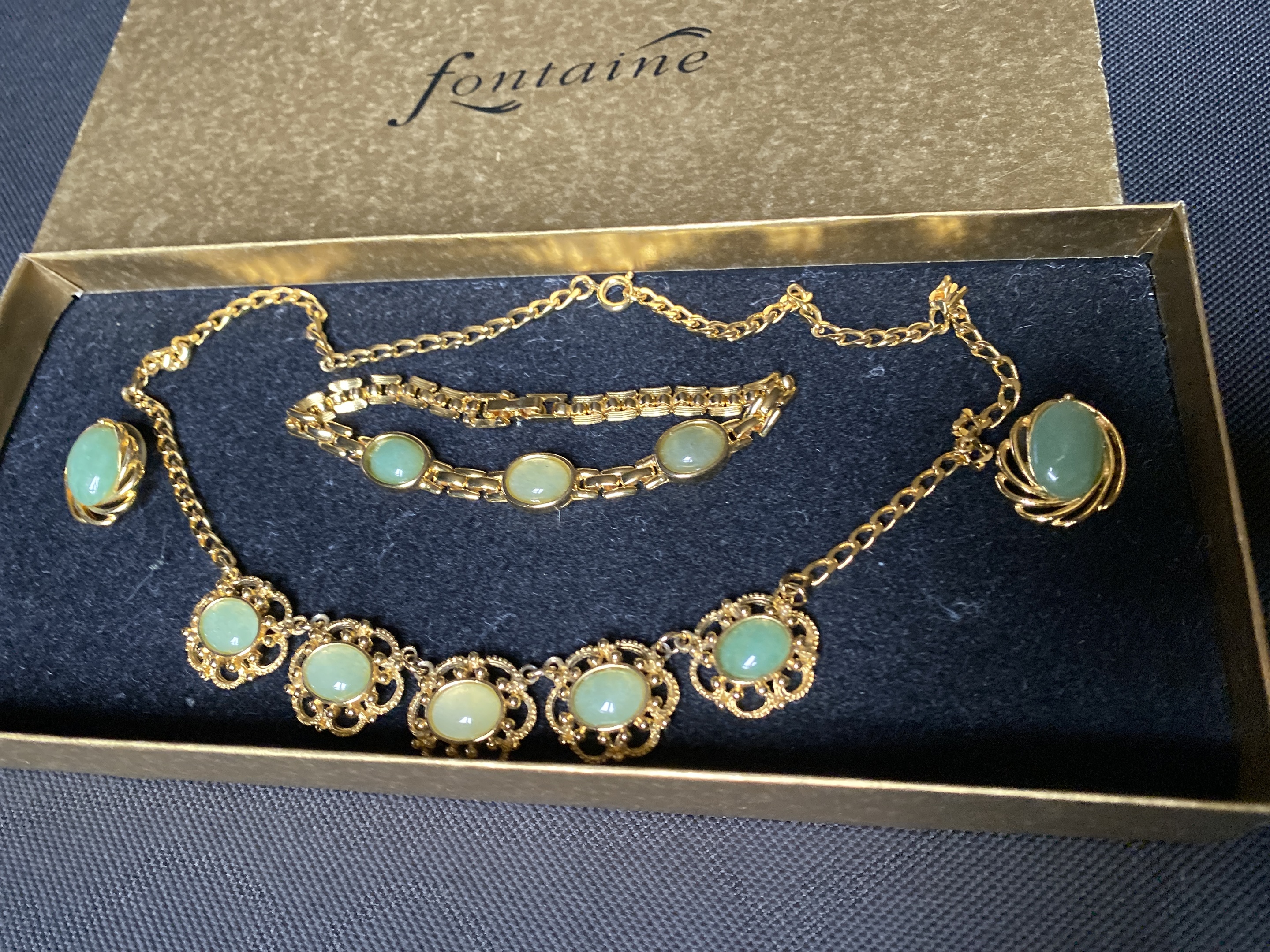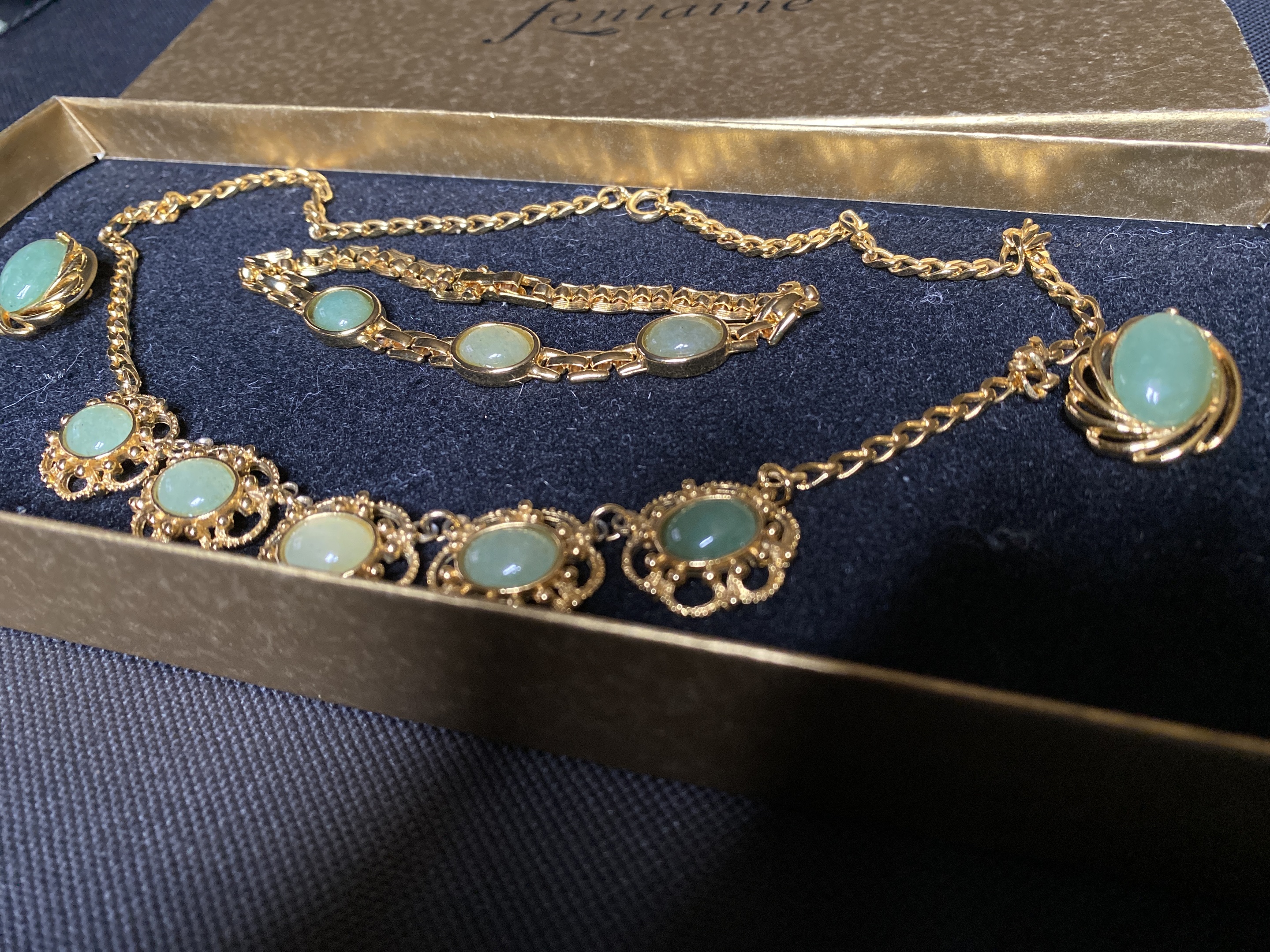 Hello I’ve just rediscovered this lovely set of jewellery, it’s quality costume jewellery I think, not sure of the maker as it has no markings I can see.I have no idea how old it is but looks new still I don’t think it’s been worn before.