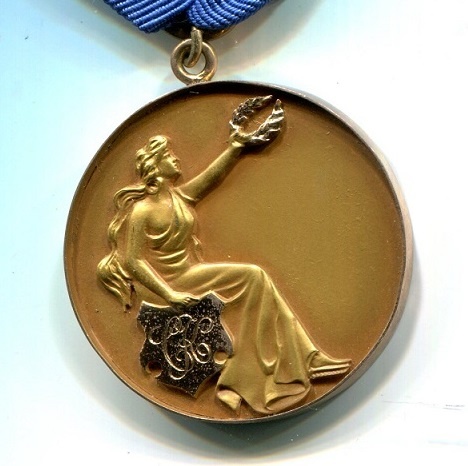 The medal is suspended from a gold broach engraved “ HEROISM” and marked solid gold on the back. The medal is 34.45 mm and is a cast (?) planchet with an applied gold strip edge to which the suspension loop is attached. Total weight is 15.2 grams with a matt finish. The design is a cut out and applied allegorical woman holding a wreath in her extended left hand and a polished shield with the monogram CK at her right side. The reverse has the nine line inscription