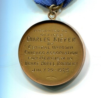 “PRESENTED TO OFFICER CHARLES KIEFER BY CENTRAL UPTOWN CHICAGO ASSOCIATION FOR HEROISM IN DRAKE HOTEL ROBBERY JULY 29,1925 “ above the smaller Spies Bros. Chi.