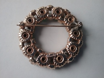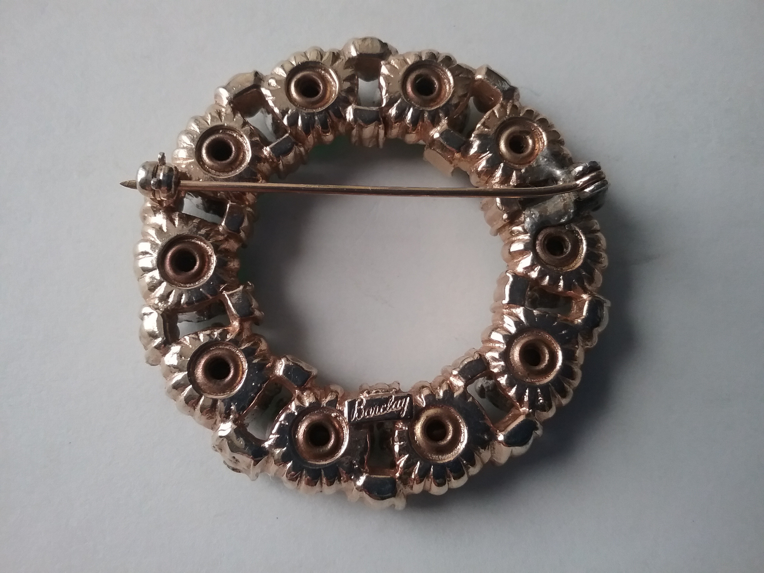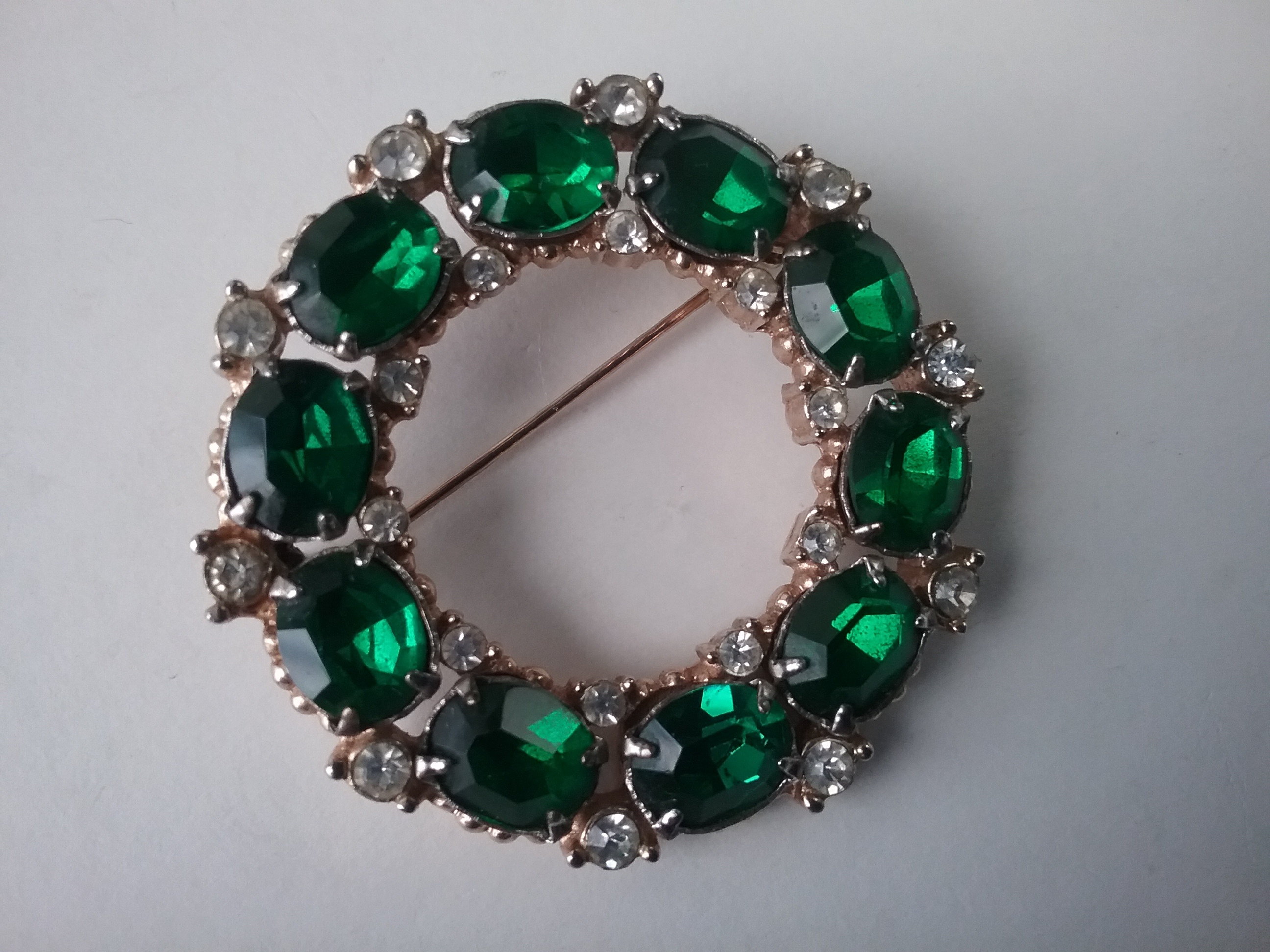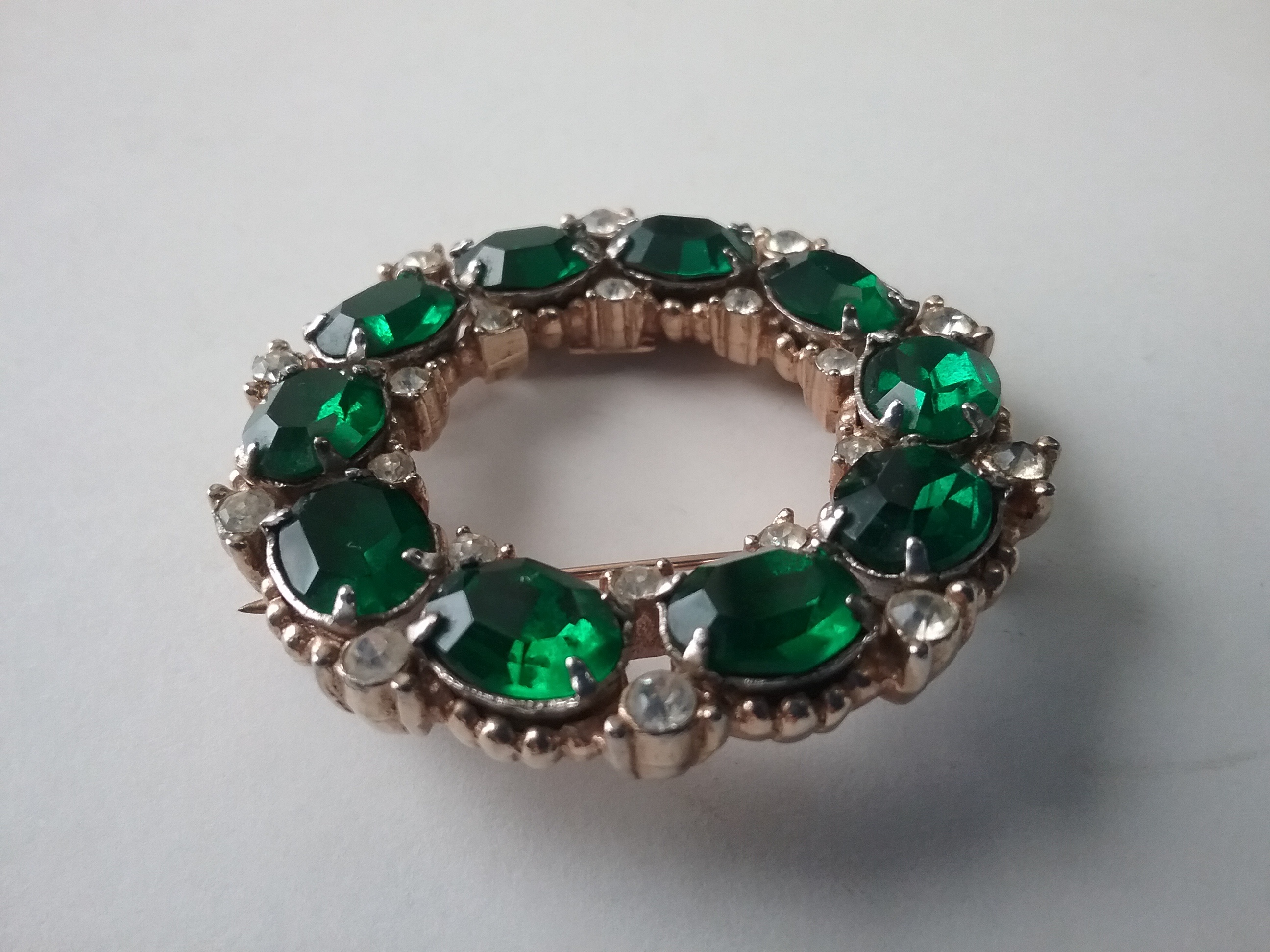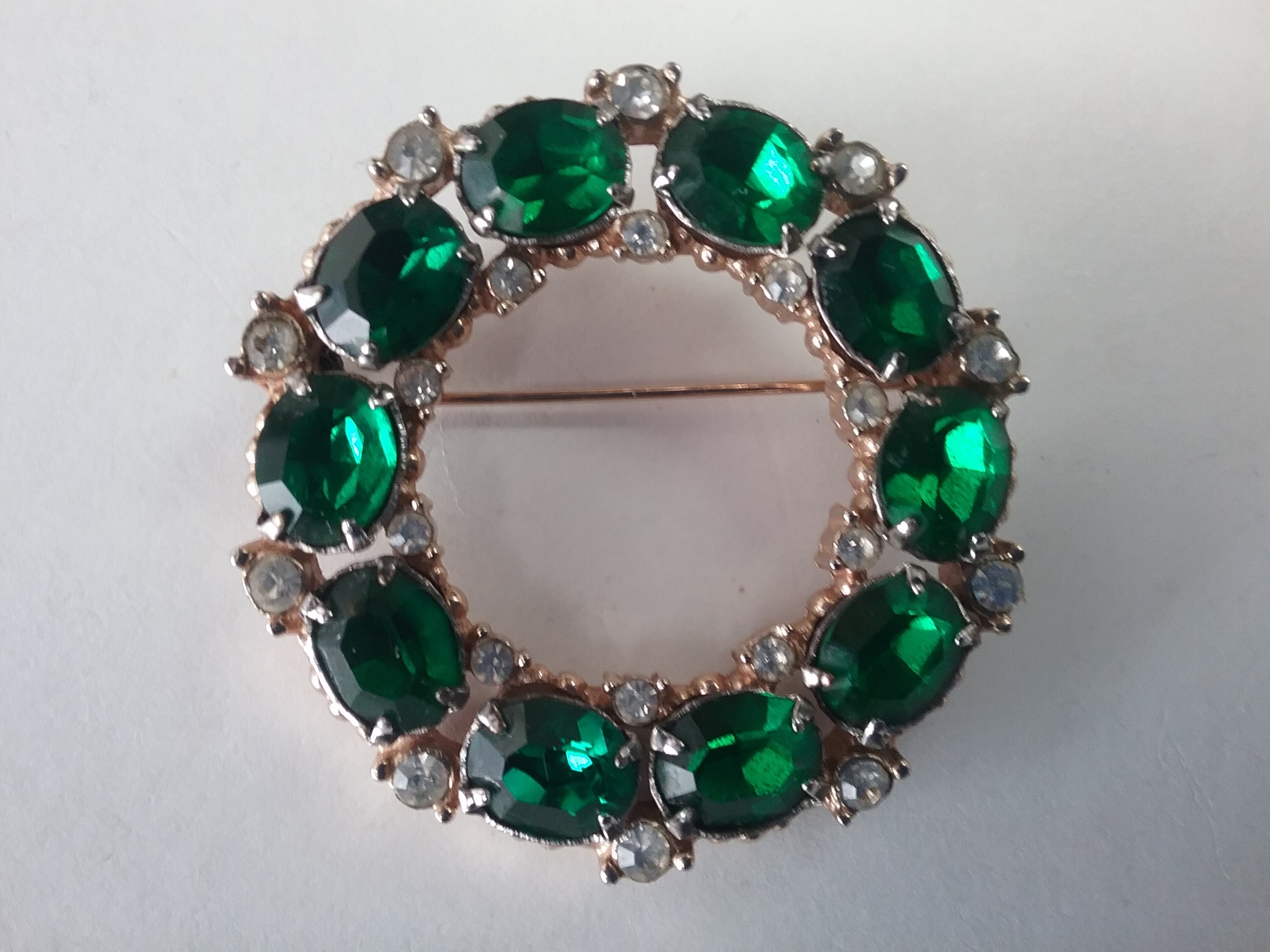 This 2" goldtone circle brooch has emerald green oval rhinestones & small white accent stones. By Barclay from the 1950s