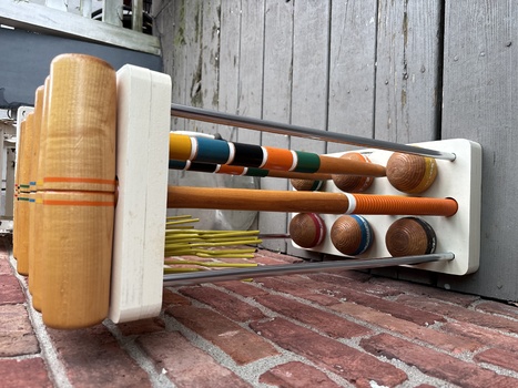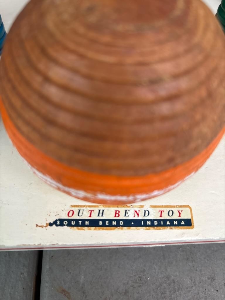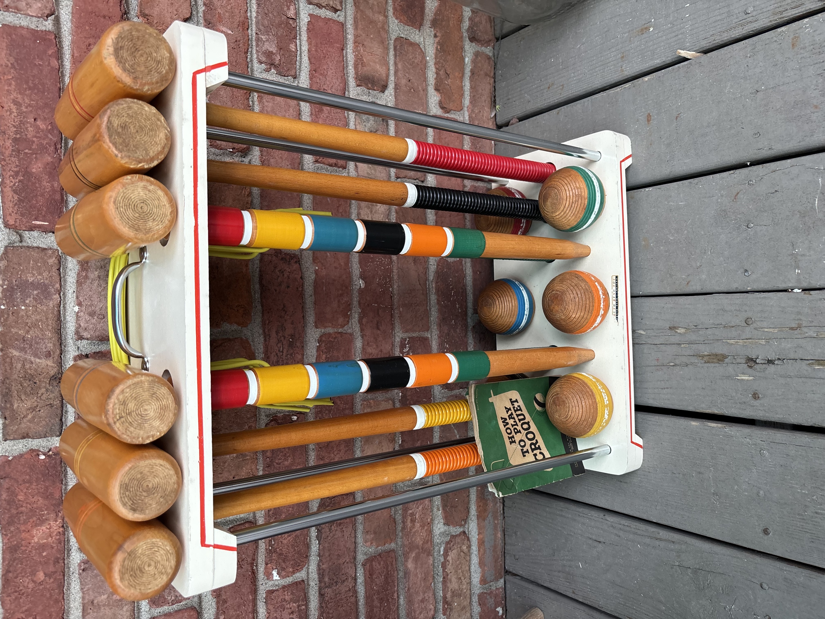Vintage wooden South Bend croquet set. Still in the original shipped box. Been in storage for many years. Unsure the value. I think it was made 19 50–19 60. In great shape for it years.