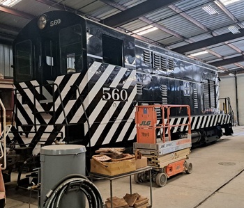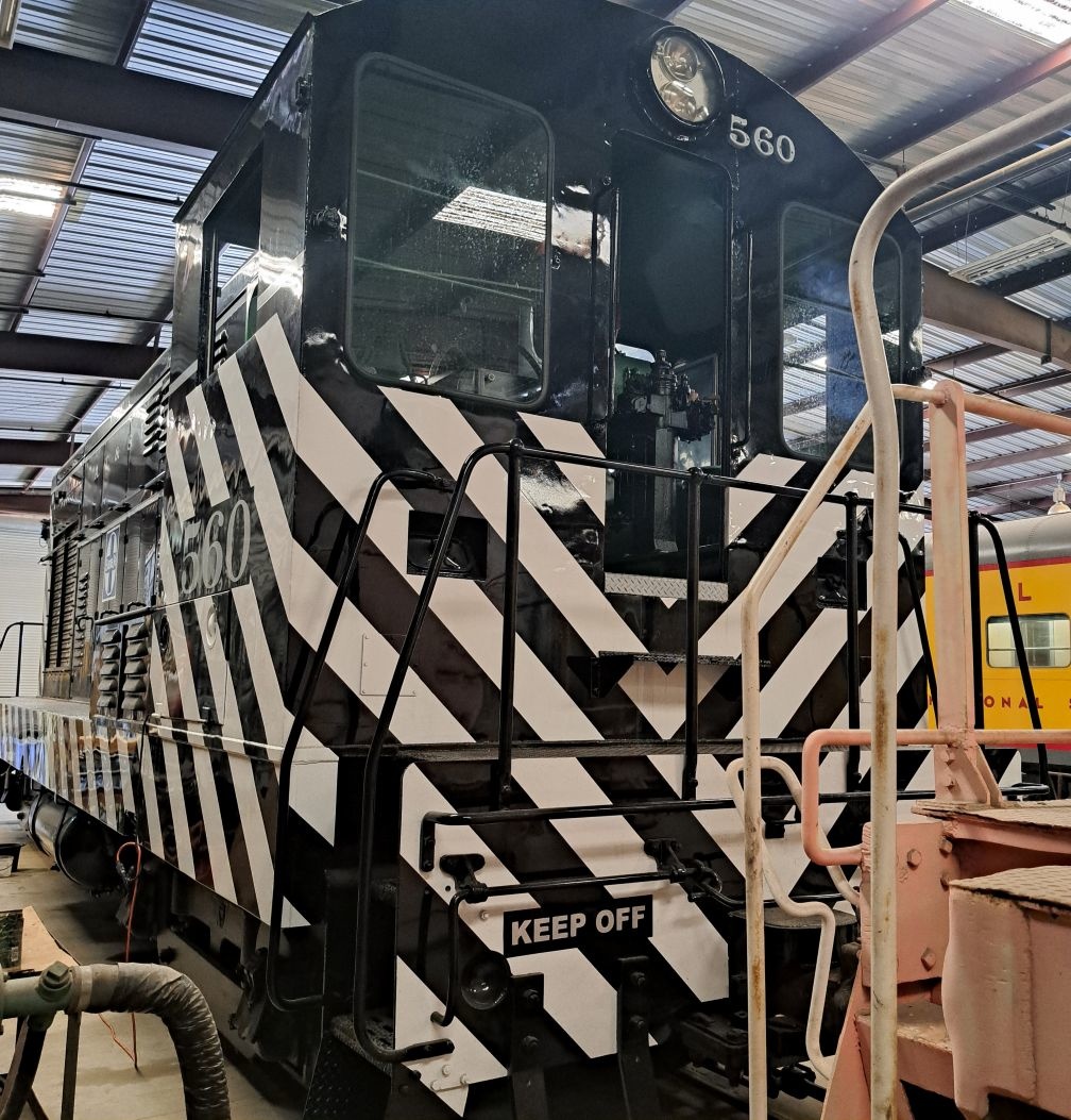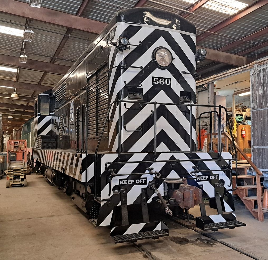 This locomotive has been newly restored with a lovely zebra stripe paint scheme. . It was built in 1957 by Fairbanks-Morse aka FM. It is a switch engine so it has that typical cab designed with rear visibility. FM locomotives are fairly rare and one in runing condition like this one even more rare. This one may be the prettiest of all. Probably has a couple hundred pounds of wax on it.