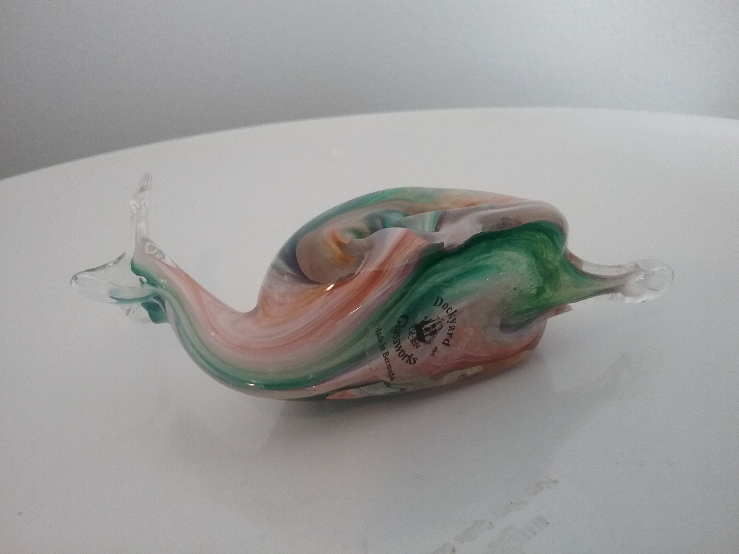 Here is a 4 1-4""W multi color swirl on clear glass snail from Dockyard Glassworks of Bermuda, with orig clear & black label on the bottom