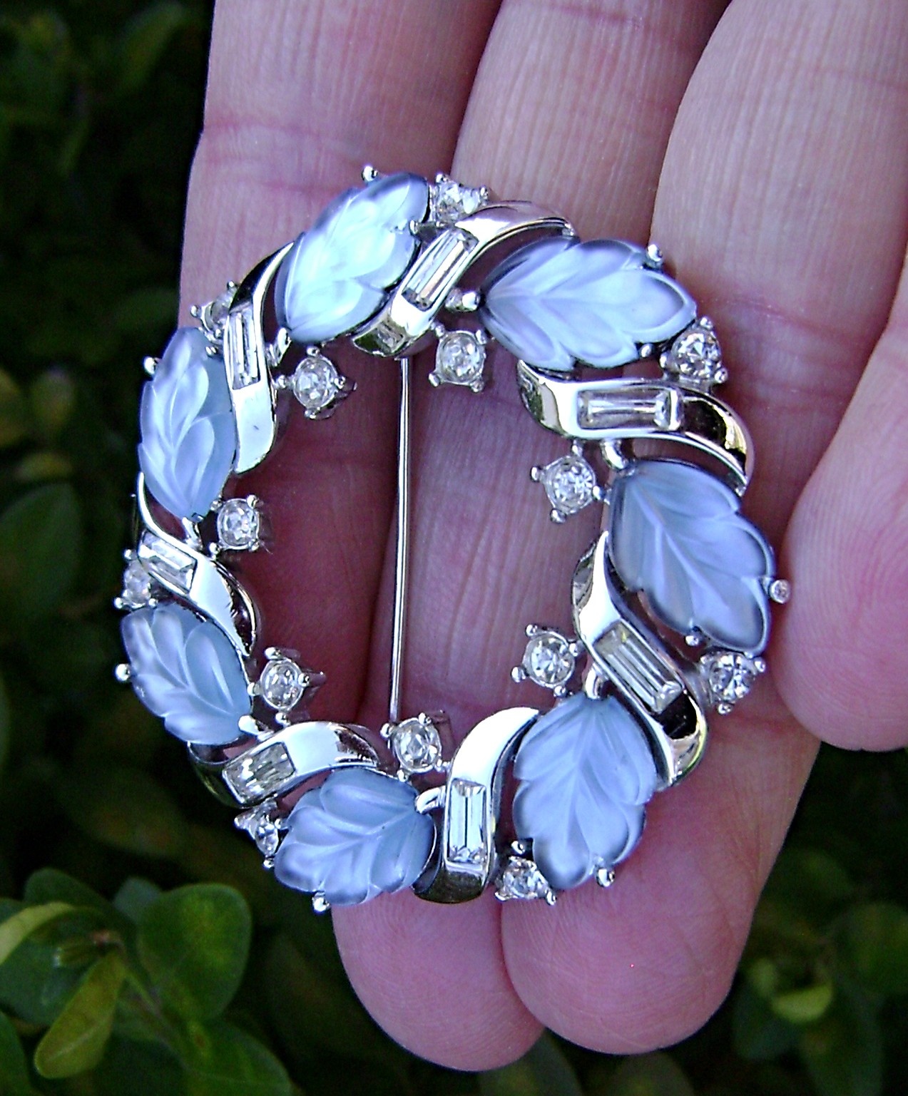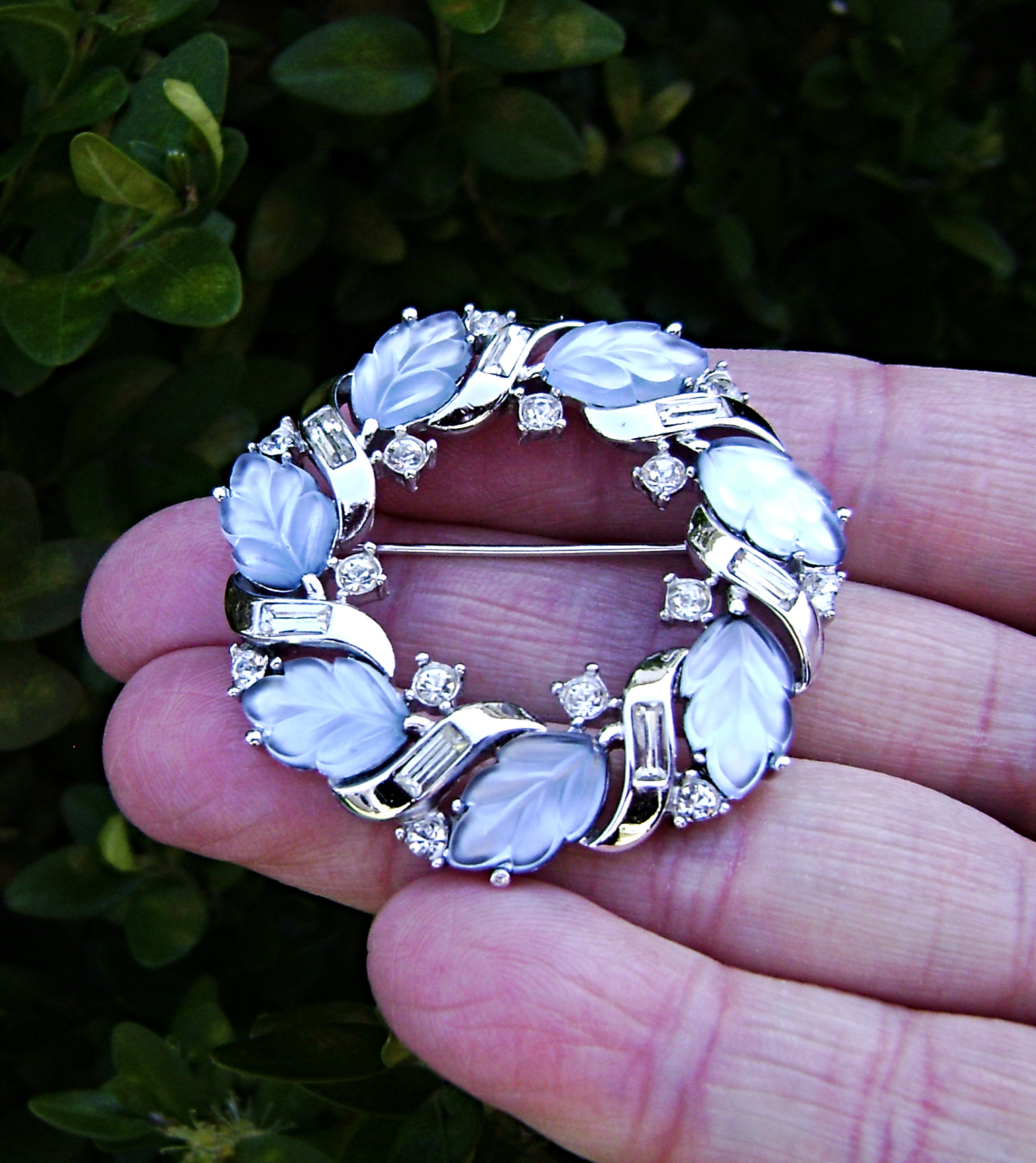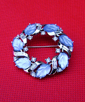 Crown Trifari brooch. With charming frosted leaves that fade from dark to light blue under different lighting. Clear baguettes and bezel set rhinestones in a polished rhodium finish. Allure series. From 1957.