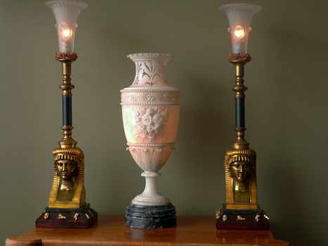 I bought this vase sight unseen from an auction in England (Cotswolds). There were no unsightly chips and it was so white and beautiful. At the very top is some carving that goes right through and that was what dated it so precisely. That is an Egyptian Revival design that came about right after Tutankhamun was discovered in Egypt. For references you should see some of the videos on Egyptomania with Doctor Robert or Bob Briers in it. The best ones are on your smart T.V. and he is highly knowledgeable and tells it in at times down to Earth and also at times funny. I have revised the exposure to show the lamps with their patina. The bronzes are highly chased and chiseled !~