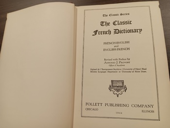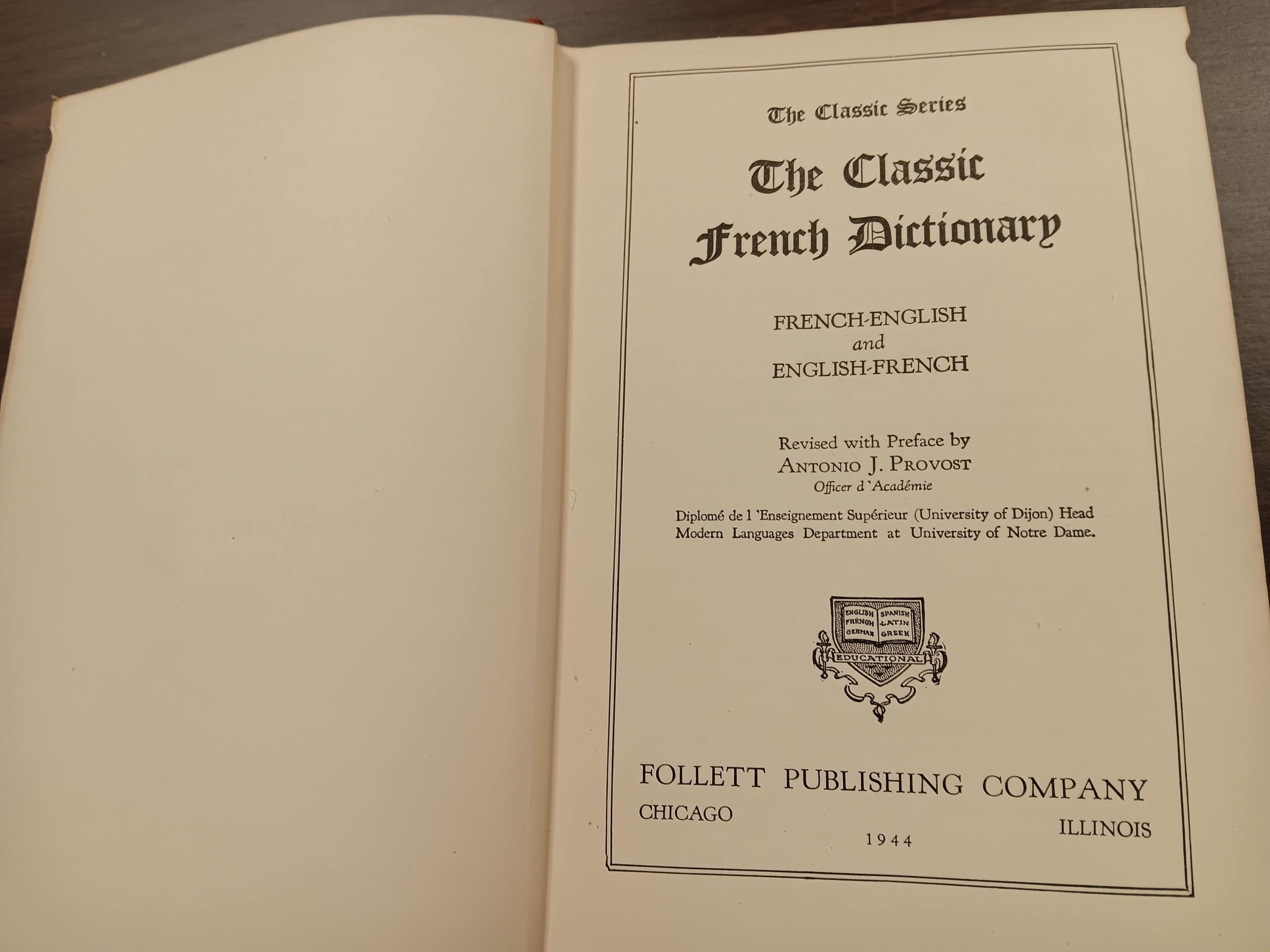 A 1944 PRINTING OF A ENGLISH-FRENCH DICTONARY, TRANSLATING BETWEEN THE TWO LANGUAGES.
