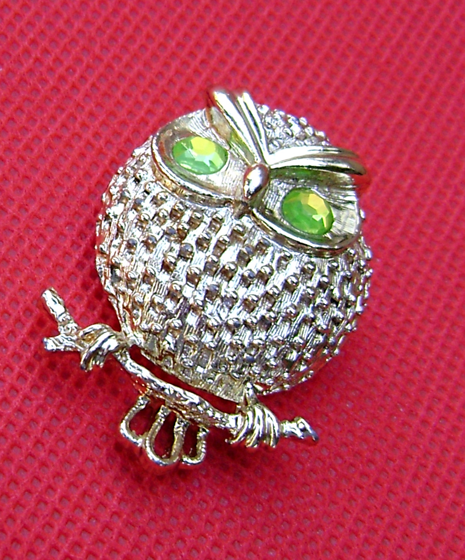 Vintage Sarah Coventry bird brooch. Here he is from the thrift store. With his lime green aurora borealis rhinestone eyes. His name is Hooter 1971. 1-1/2" tall.