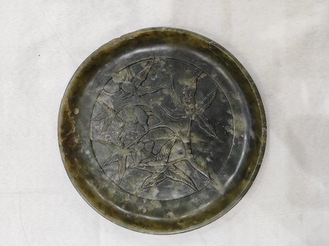 I would greatly appreciate your assistance in identifying and evaluating this decorative plate that has been in my possession for some time. The plate is green in color and weighs approximately 650 grams. It features a detailed floral and leaf design, which I believe may depict lilies. The surface is hard and can be scratched with a needle, leaving a permanent mark.