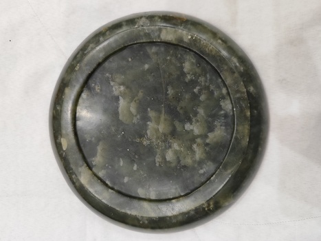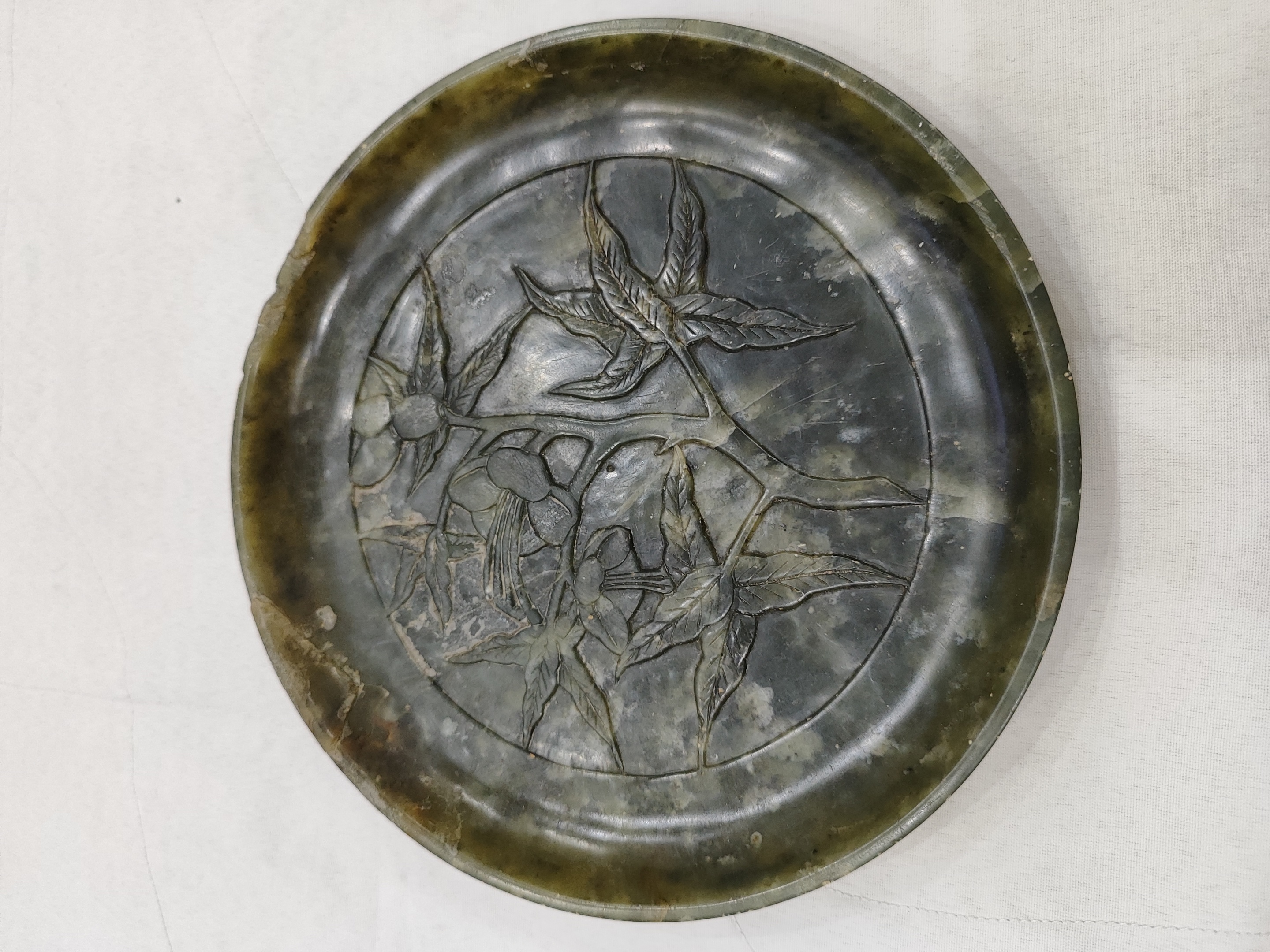 I would greatly appreciate your assistance in identifying and evaluating this decorative plate that has been in my possession for some time. The plate is green in color and weighs approximately 650 grams. It features a detailed floral and leaf design, which I believe may depict lilies. The surface is hard and can be scratched with a needle, leaving a permanent mark.