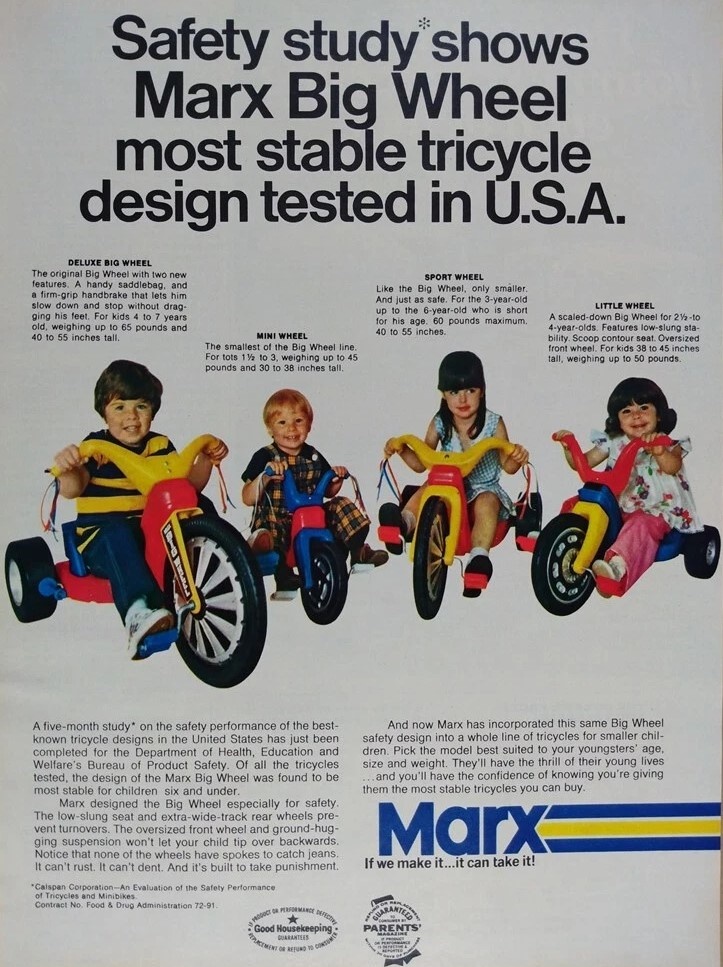 This intriguing article from 1923 describes how children would convert a high riding tricycle into a low riding racer by simply flipping the frame upside down. This design foreshadowed the cheap plastic Big Wheel popularized in the 1970’s by inventor Ray Lohr who was employed by Louis Marx and Company. The article from Illustrated World reveals that Ray was not the first person to come up with the idea. According to the story converting tricycles was a common practice in the 1920s, suggesting that Ray Lohr was simply the first person to successfully mass market the concept commercially.