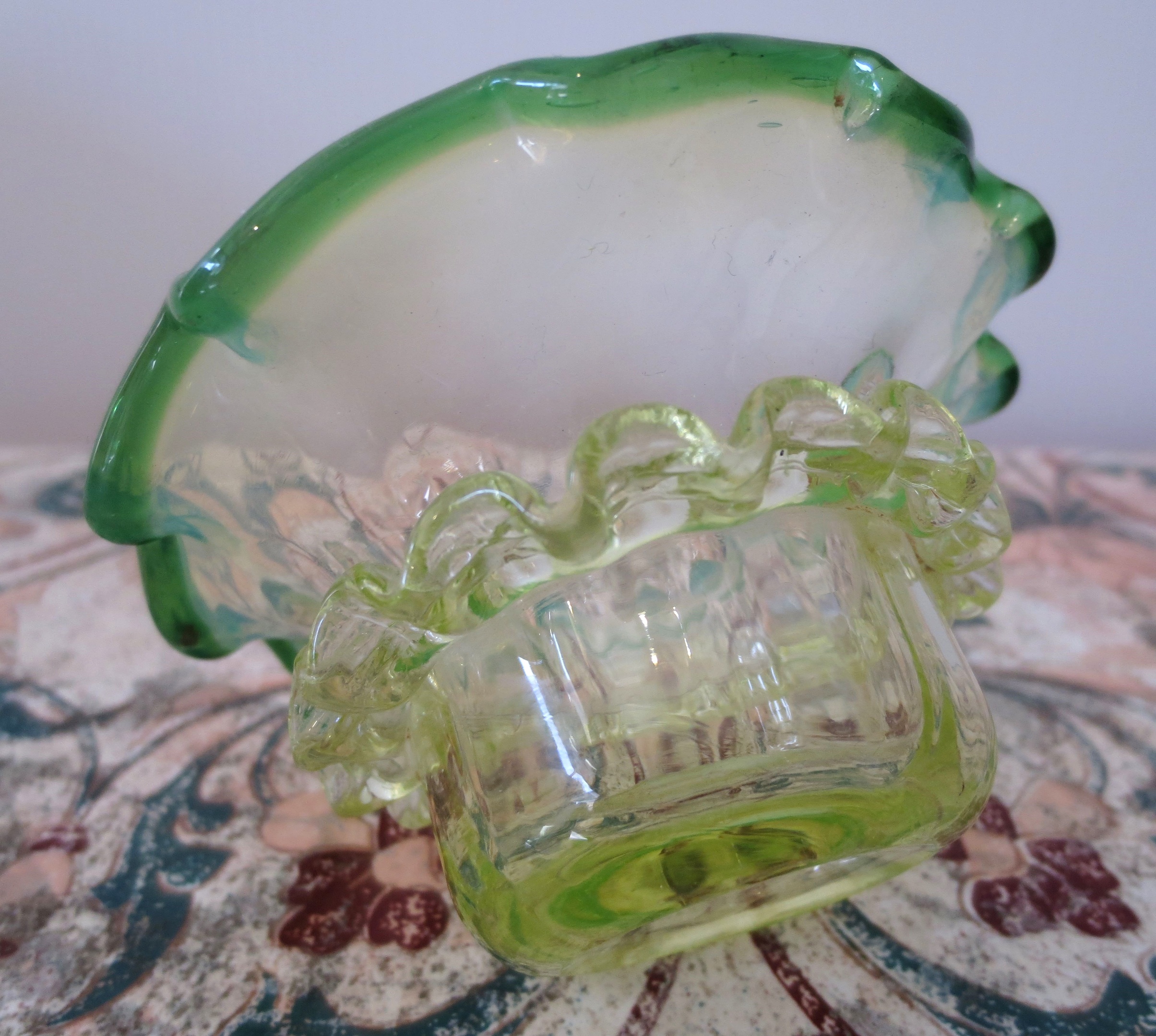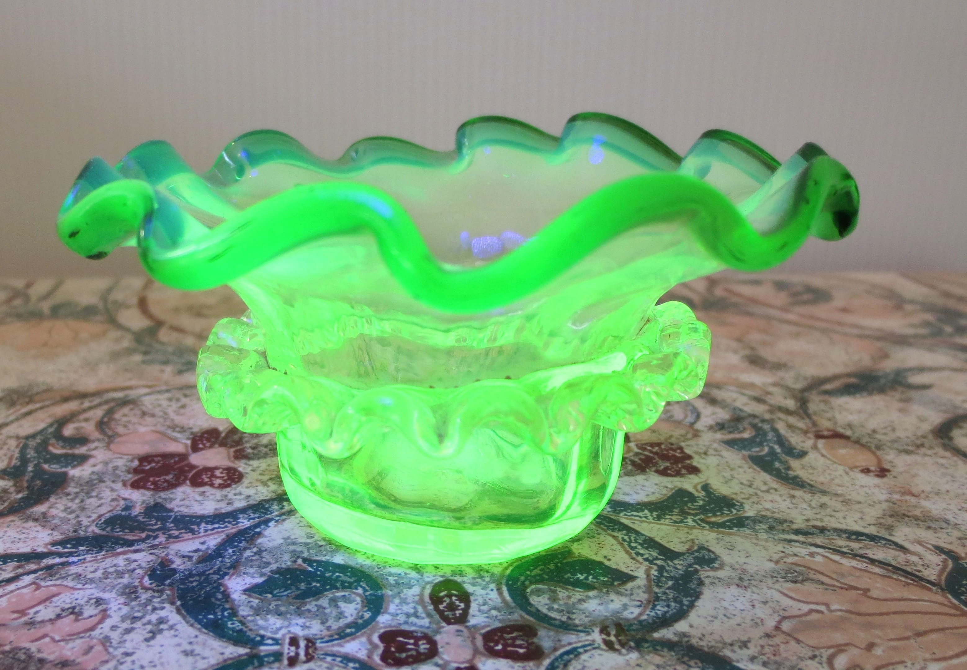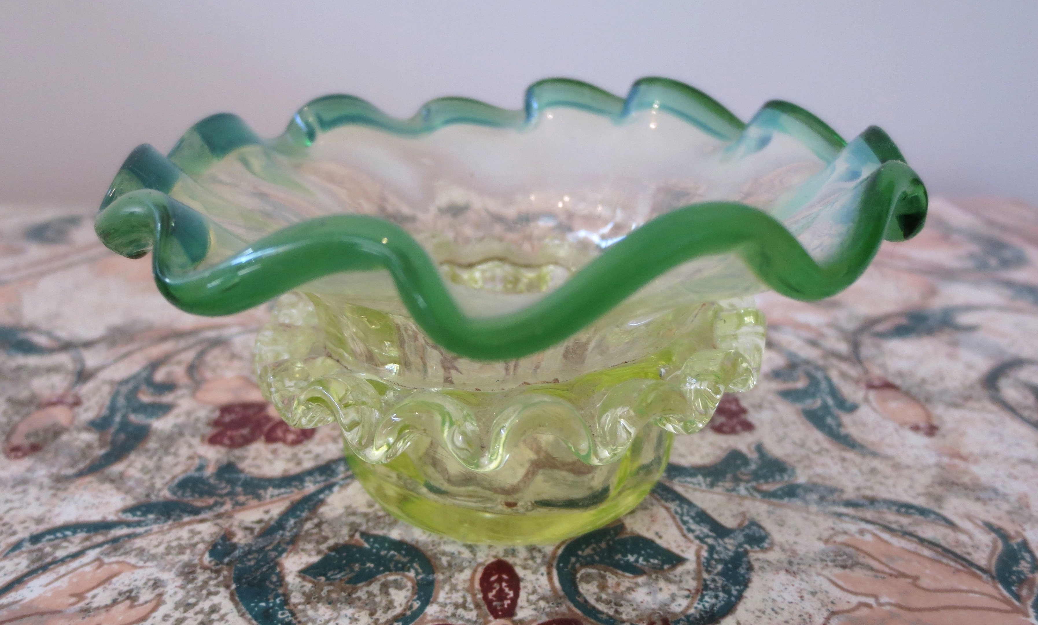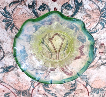 Unfortunately missing it's metal frame but this small dish is very pretty, it looks immaculate but I can feel a small rough corner on the rigaree but pretty amazing for a piece of glass over 100 years of age. And of course it has it's party trick :)