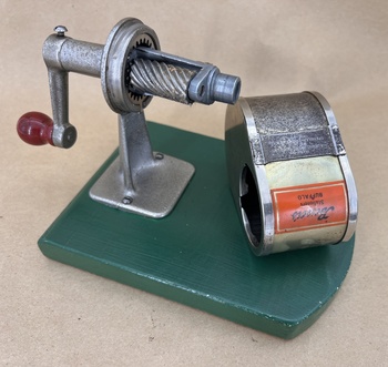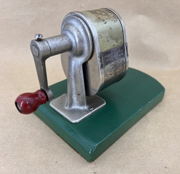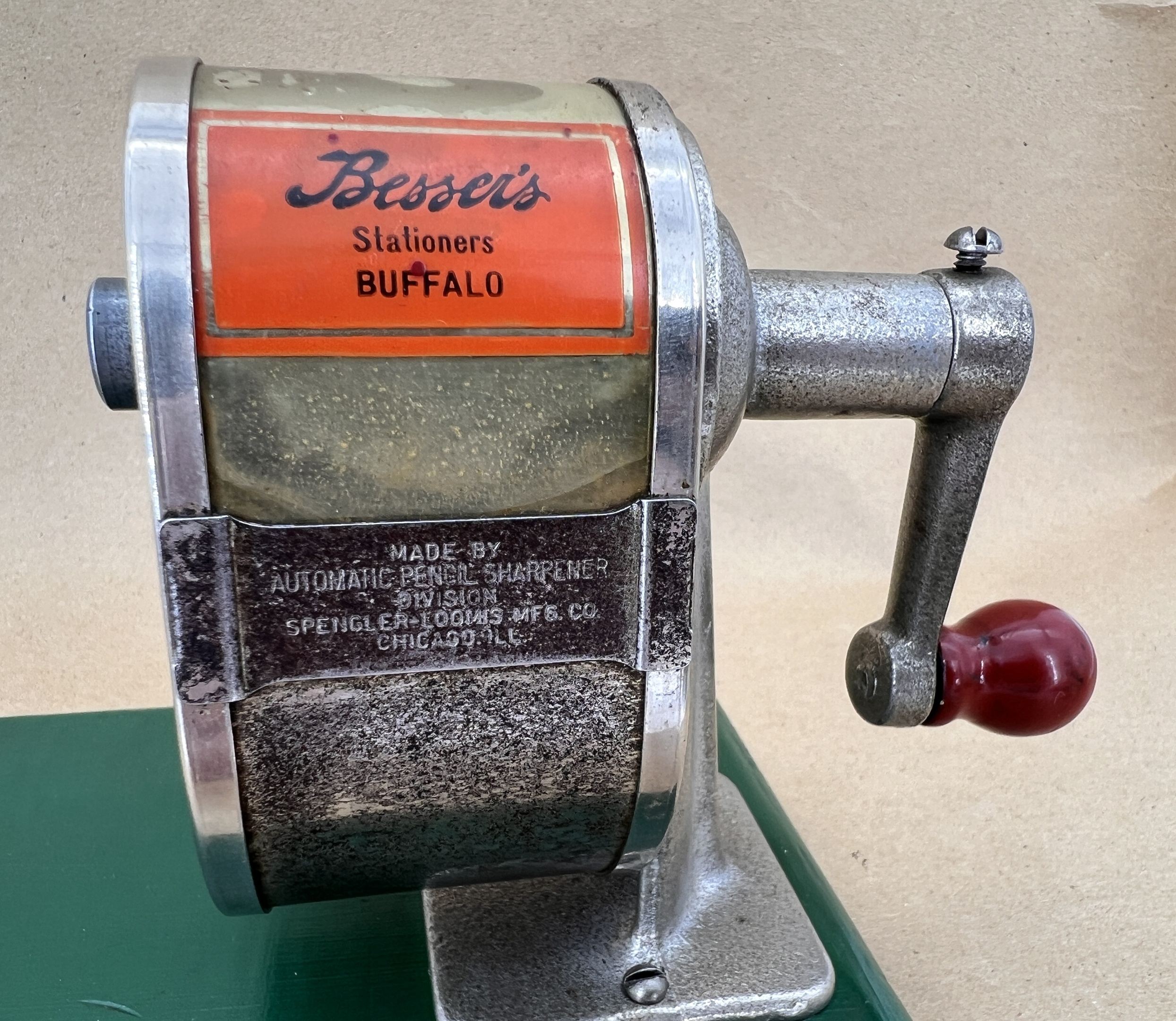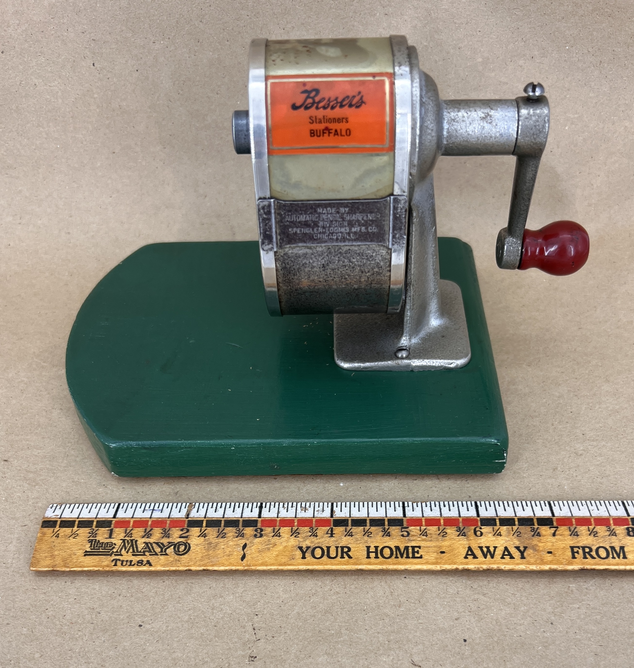 A very nice, clean Besser's Stationers Buffalo (NY) pencil sharpener, made by the Automatic Pencil Sharpener Division of the Spengler-Loomis Manuf. Co. I believe the original owner repainted the crank knob, and certainly made the wood stand on which it's affixed.