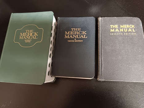 THE SEVENTH, TENTH AND SIXTEENTH EDITIONS OF THE MEDICAL MERK MANUAL. KNOWN WORLDWIDE AS A REFERENCE FOR MEDICAL PERSONNEL, SUCH AS DOCTORS, TO USE AS A GUIDE FOR DIAGNOSIS.