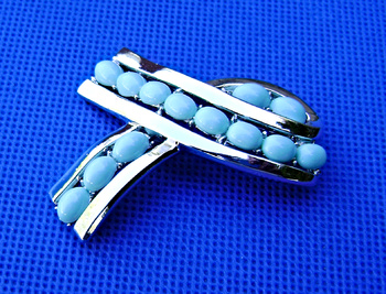 Crown Trifari Ribbon brooch. In a polished rhodium finish, with turquoise cabochons. It's from the Parade series. 1950's, 2-1/4"
