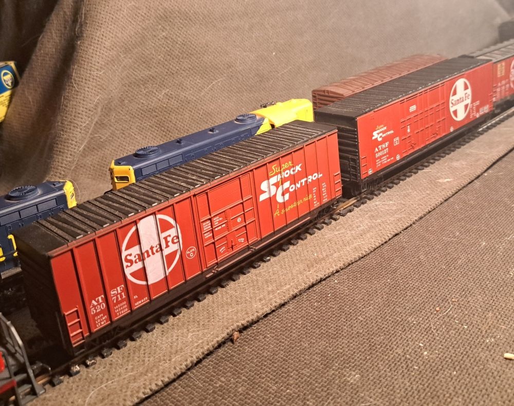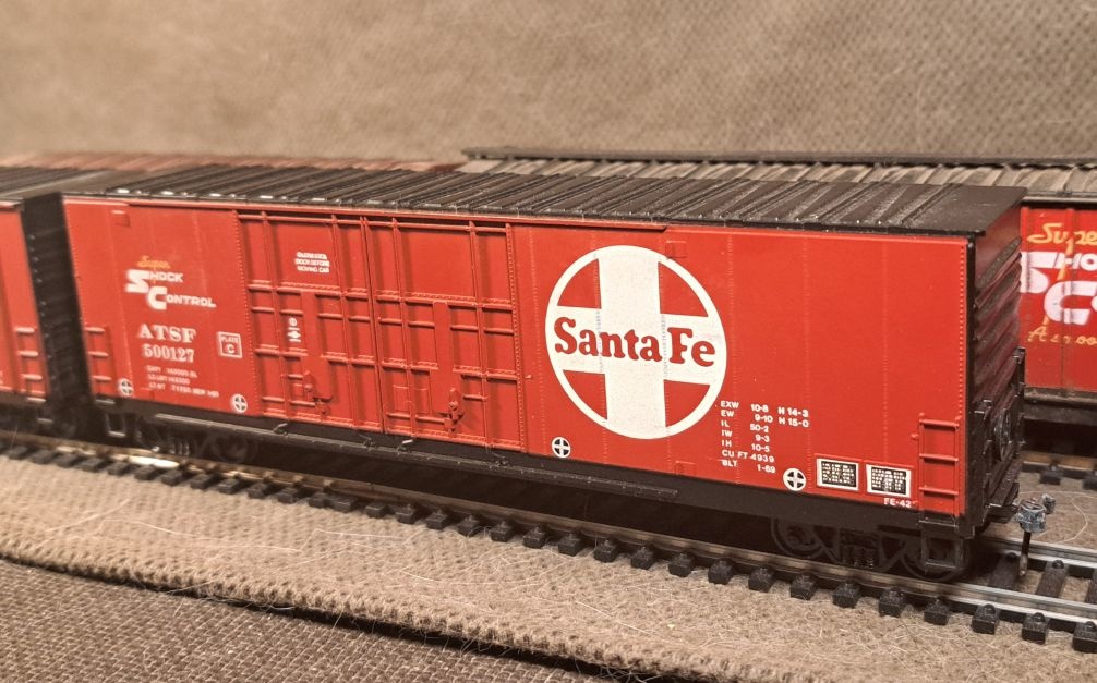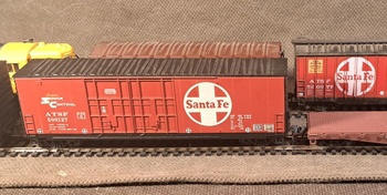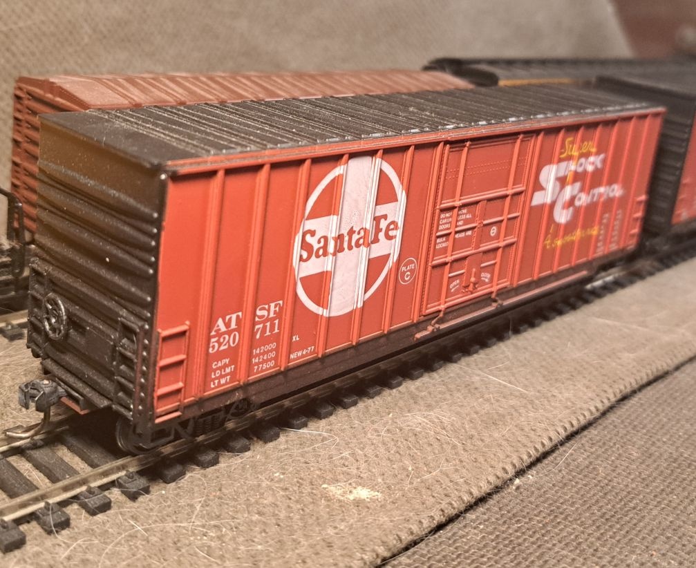These are a bit more modern than my usual box cars as these don't have the runway. The cars are fairly similar. The most glaring difference is that the paint schemes are reversed. Also the molding of the doors is a bit different. There is a third semi-matching box car boxcar in one of the photos that is the older type with the runway on type. In the long ago the brakemen would run along the rooves to set the brakes. They kept the runways even though the cars had airbrakes.