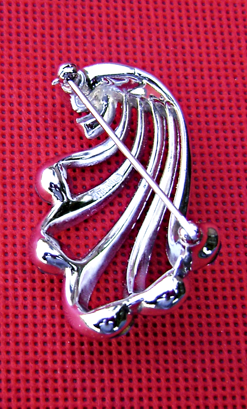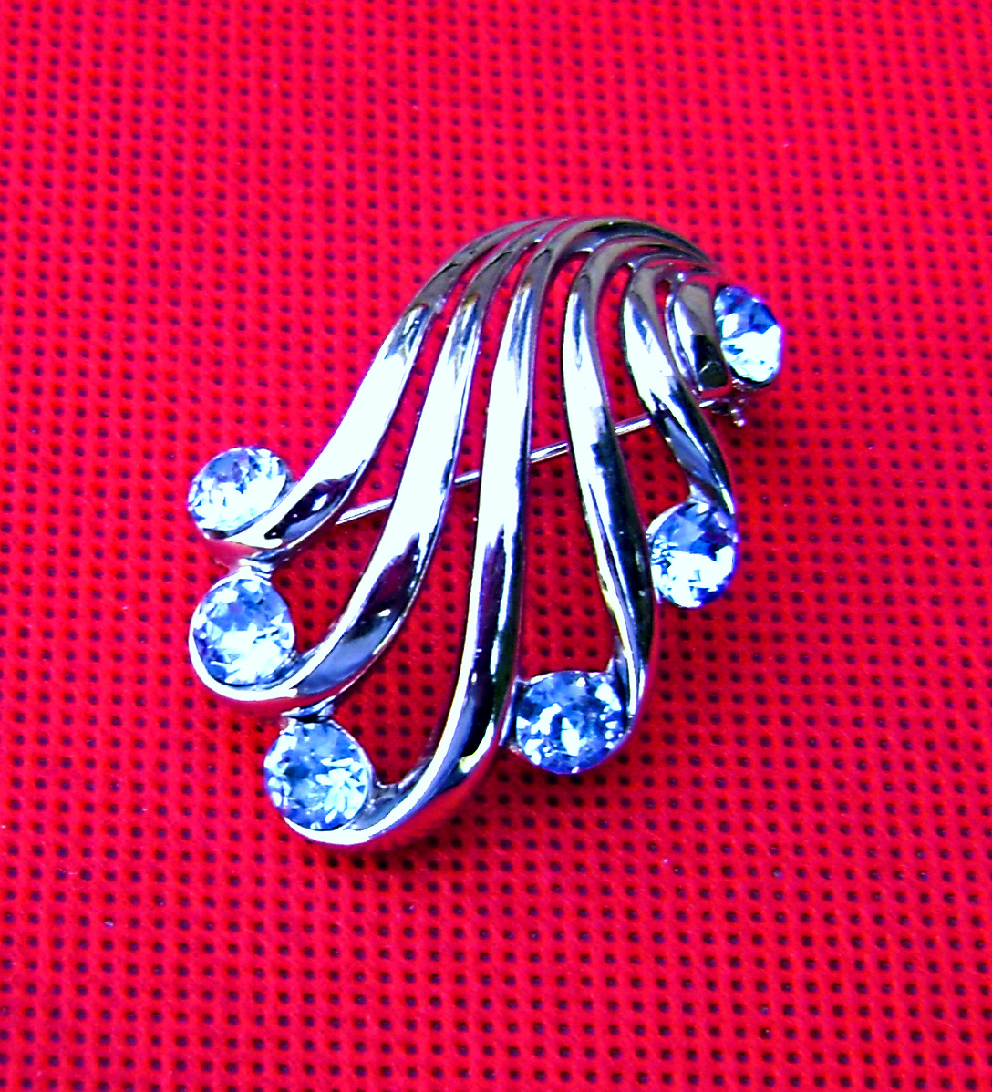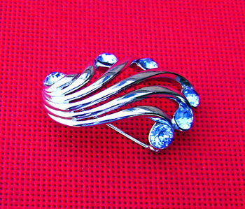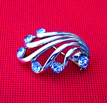 Crown Trifari wave brooch. Rhodium plated with Topaz Blue foil backed round rhinestones. 2" tall. 1950's
