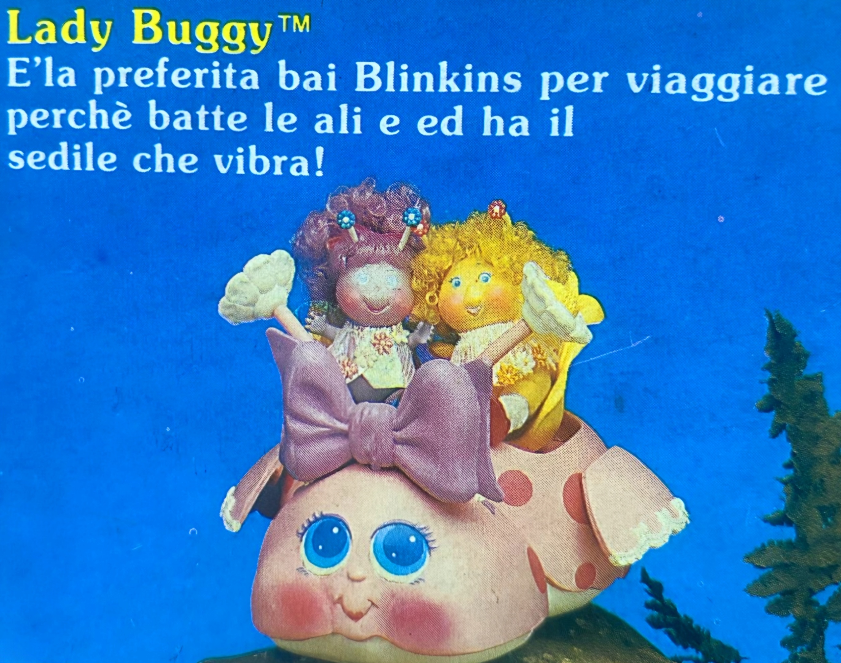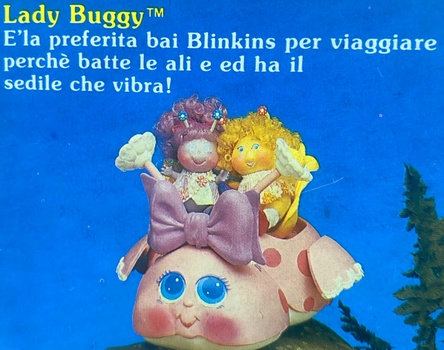 Ladybuggy is one of the Blinkins' means of transportation. In the movie, she is a pink ladybug with yellow bows, but in the toy, she has purple bows. In the prototype, she has fixed painted eyes, but in the final toys, her eyes move when she walks.