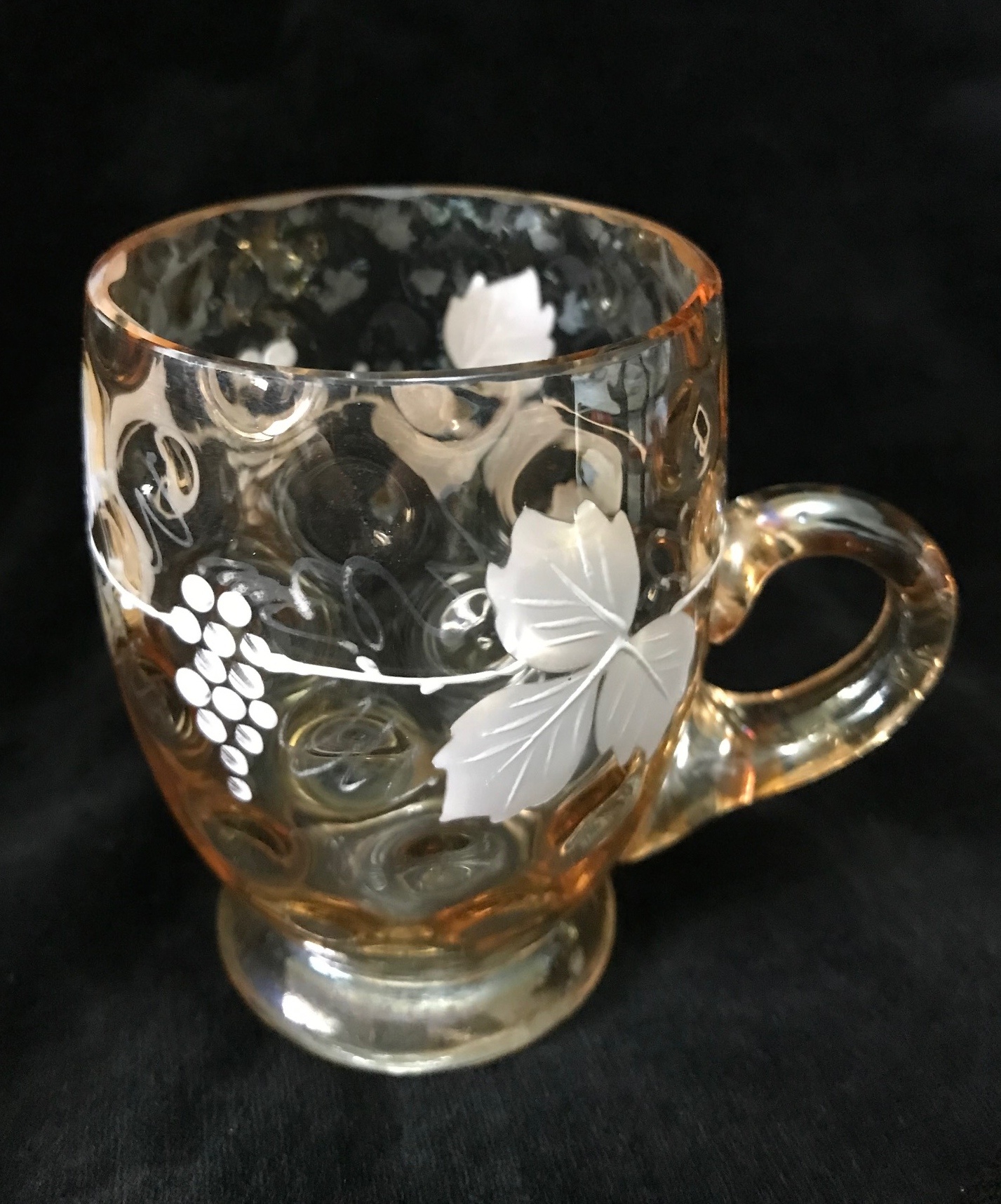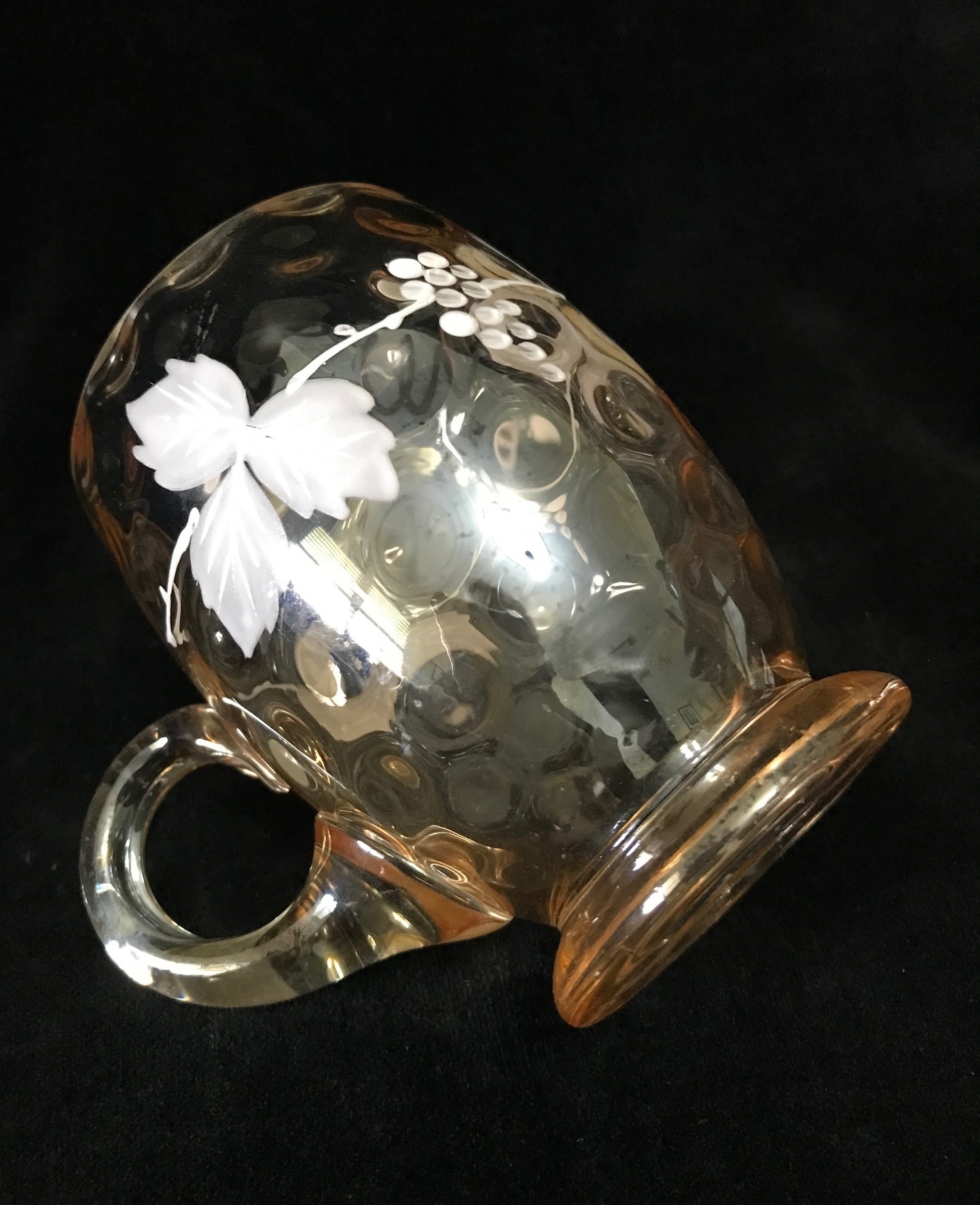 Second find was a cute punch cup or mug. This was hanging around on the shelves of orange things for about a week before I decided to stump up $3 for it. It is made from a very pale peach tinted glass with a slight iridescence (not enough to put it in the carnival glass category, I believe). There is a thumb print pattern & white enamel decoration of grape vines suggesting a use for an alcohol beverage. The applied handle is set low on the side. Could be Bohemian origin, late 19th century..
