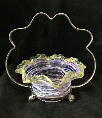 First is a silver plate stand for a Victorian glass jam dish. I have a lot of these dishes & most of them are without their stands, so it was cool to find one at last. The glass dishes, in an abundance of colours & decors, are relatively easy to find, the silver plate stands, very difficult. After polishing it up, I tested it out with several glass dishes (they are all slightly different sizes, with rigarees at differing heights which affects the fit with a stand) & found a perfect fit with this lovely mauve dish with applied trailed decoration & a uranium rigaree. Happy days!