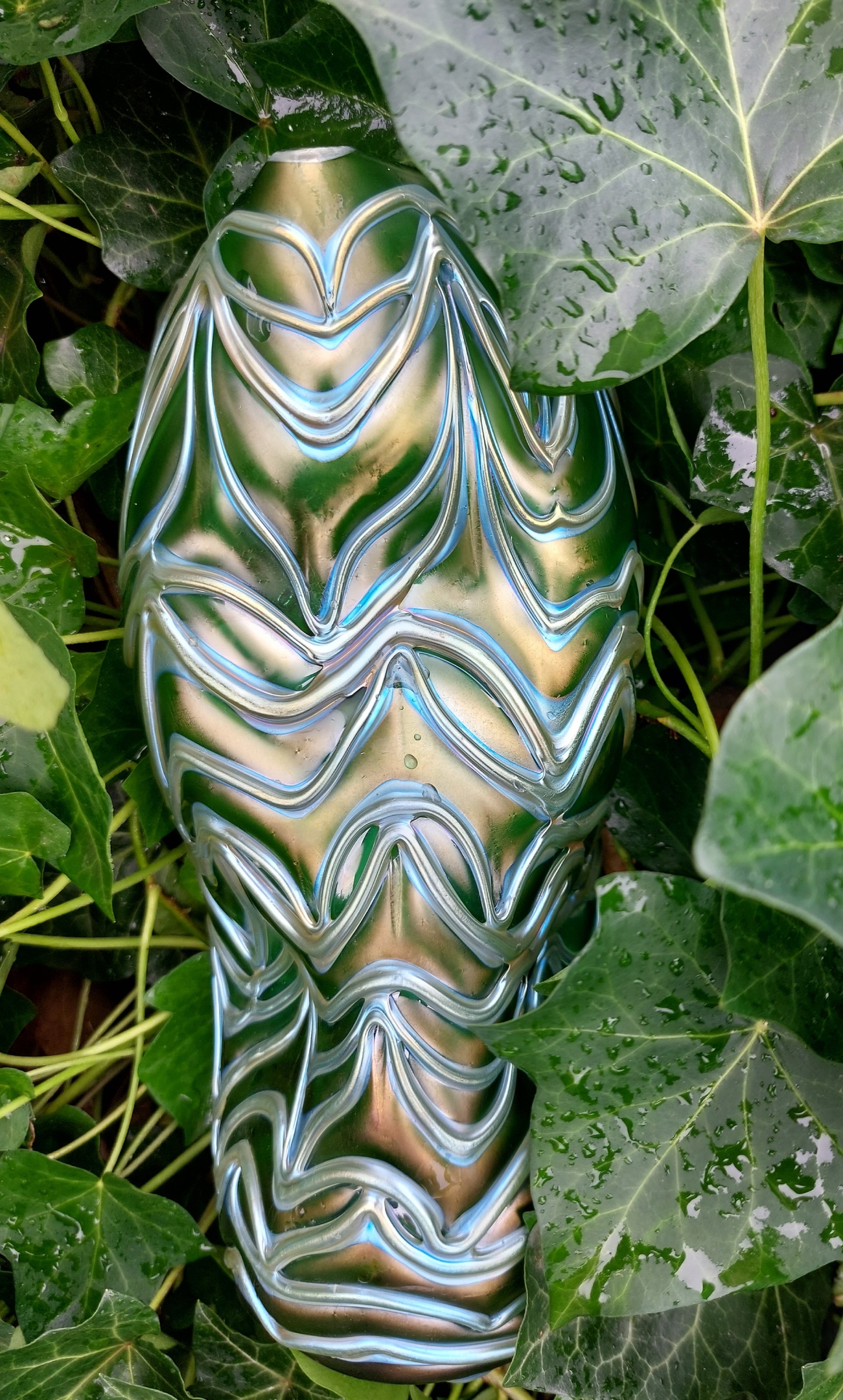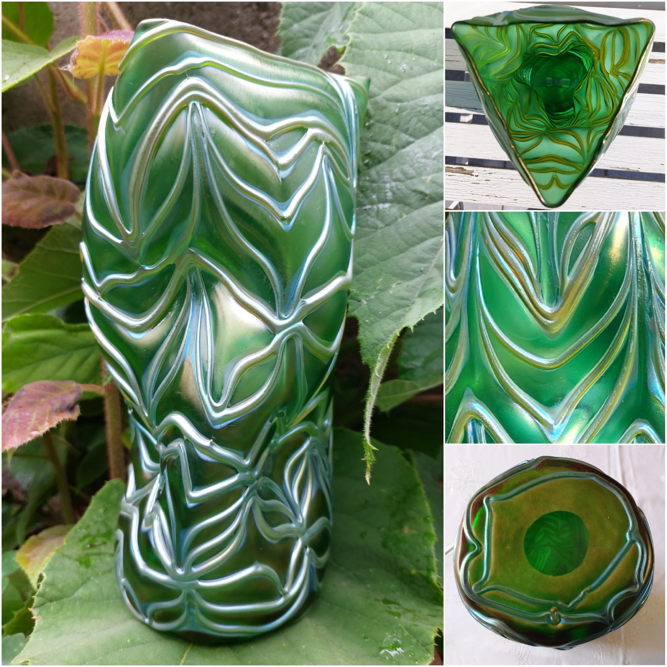 Dekor: Formosa 1902. PN unbekannt (diese Form kenne ich auch in Diaspora Silberiris und in PG 1/475) cretafarbenes Glas mit Silbergelbfäden unregelmäßig umsponnen. Diese wurden anschließend mit dem Haken verzogen. In die Form geblasen und aufgetrieben. Auf rundem Stand, die Mündung zu einem Dreieck geformt und feuerpoliert, danach die Wandung sechsmal versetzt in zwei Reihen eingedrückt. Dadurch entsteht diese amorphe Form, die von allen Seiten ein anderes Erscheinungsbild hat. Anschließend reduziert und blau irisiert. Höhe 24 cm