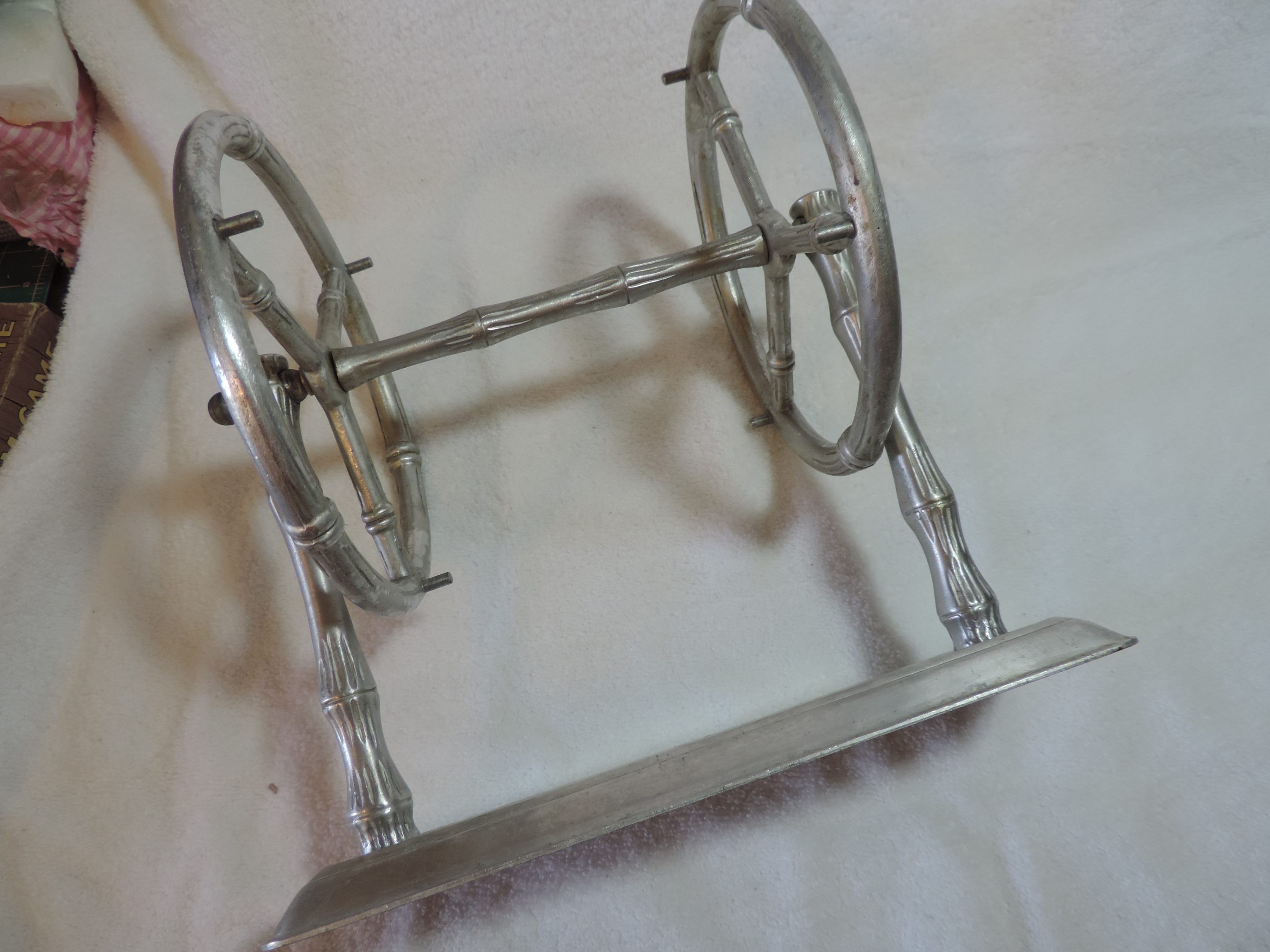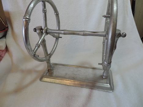 BEEN AWHILE SINCE I HAVE VISITED... NEED SOME HELP IN AN ID OF THIS ITEM.. I HAVE NO CLUE OTHER THAN IT MAYBE A KITCHEN ITEM.. STANDS APROX 11" TALL.. WHEELS ARE ABOUT 7" DIAMETER AND SPIN.. WHEELS CAN ALSO BE REMOVED.. WHEELS ALSO HAVE 3 SPIKES ON THE INNER SIDES..