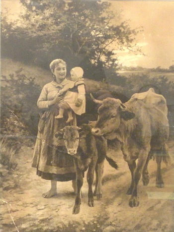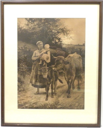 1889 Etching "Motherhood" by Edouard Bernard Debat-Ponsan. My mom brought this home from the church's salvage shop in 1986. It was torn in two places, but her framer did a decent job of piecing it back together. The art is (12 x 16 inches) and the frame is (18 x 22 1/2 inches)