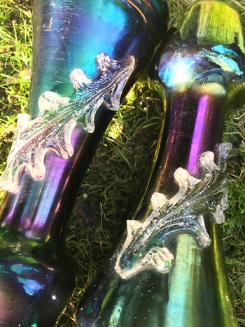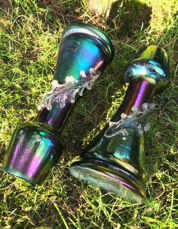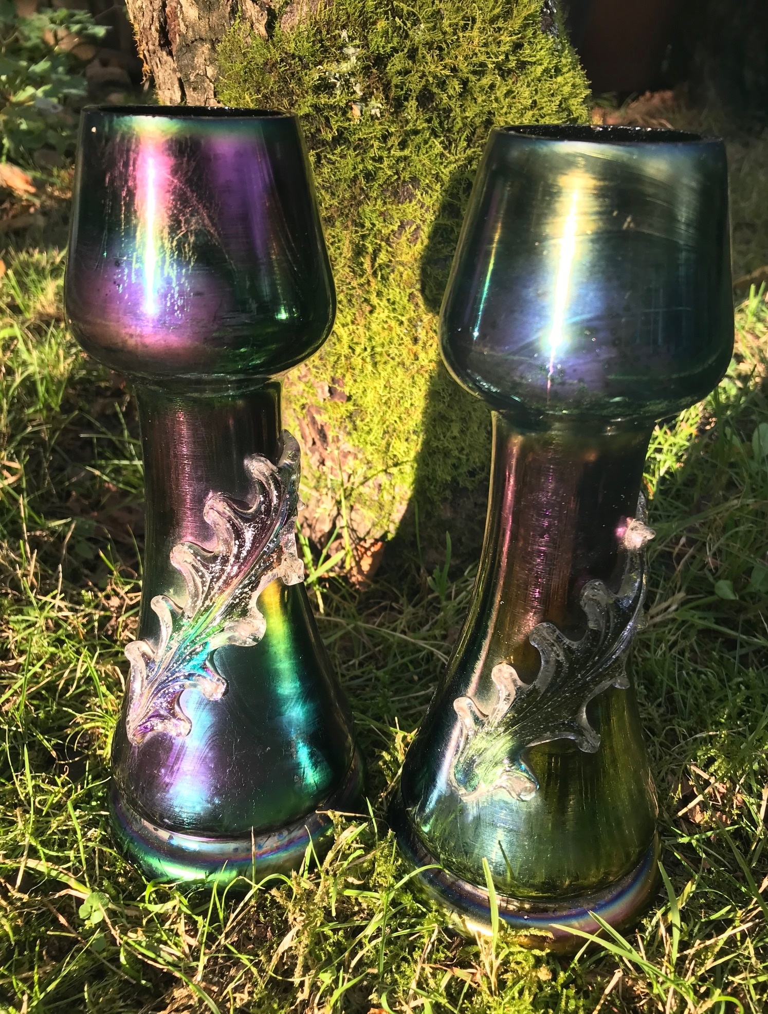 The vases are made from a deep red glass, which has an intense iridescence. They measure 21.5 cm tall, 5 cm across the cupped top rim, & 9 cm across the base, lacking a pontil mark.