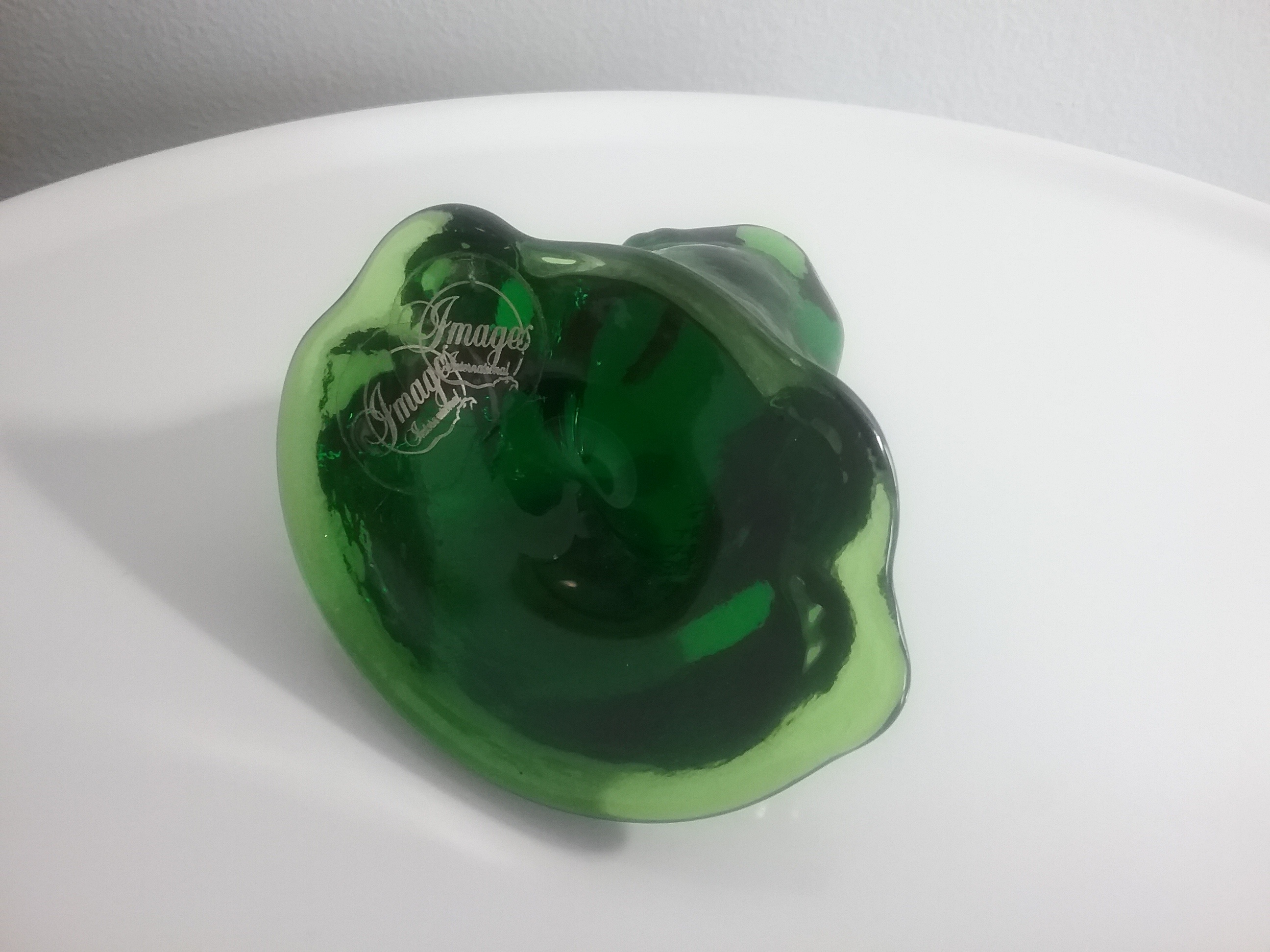 Here is a 3 1-2"H emerald green glass frog sitting on a lily, made by Images International with original clear & white pair of labels