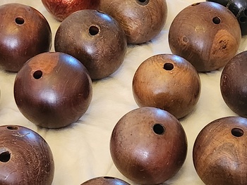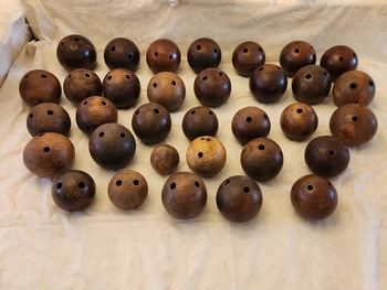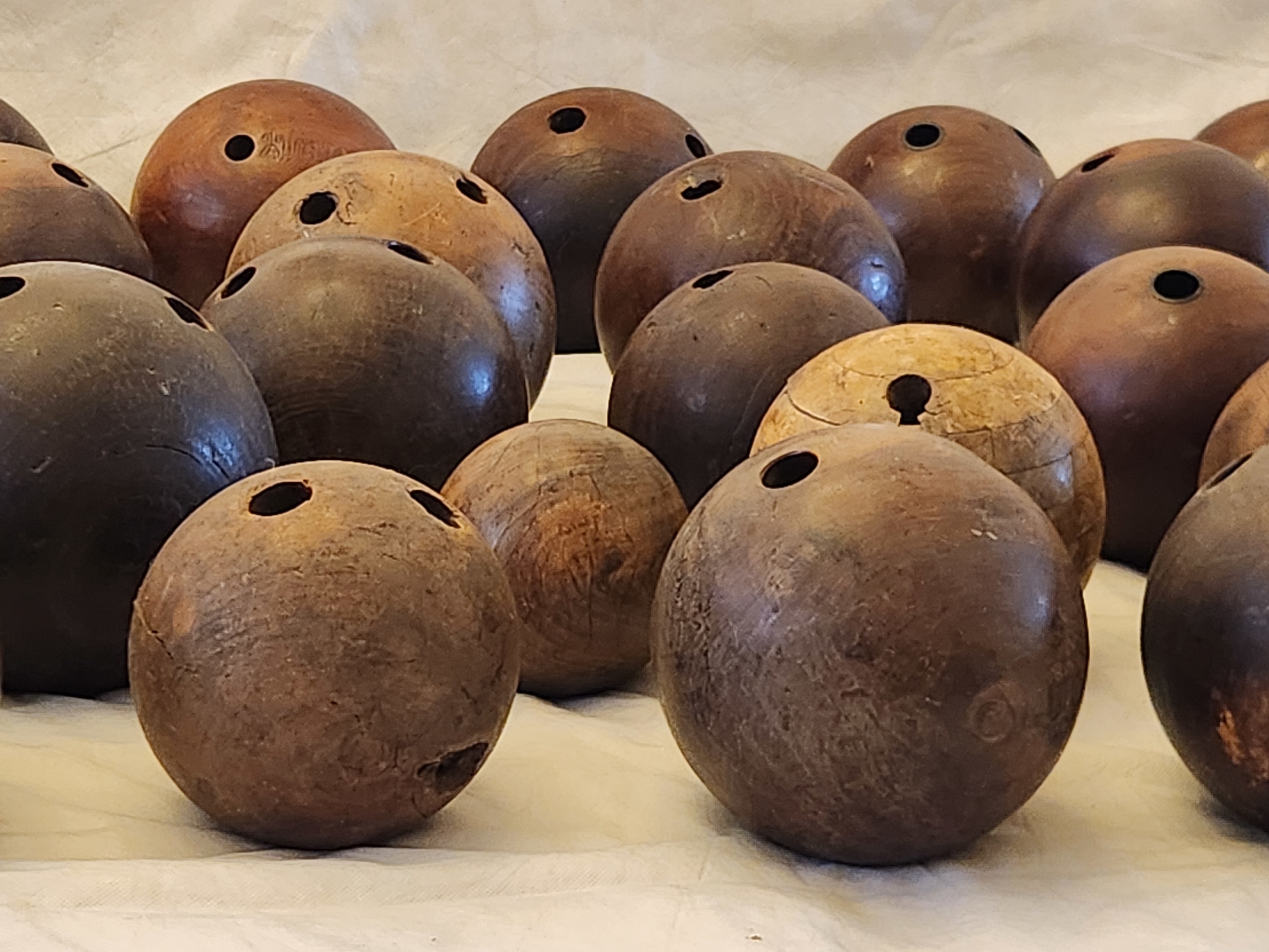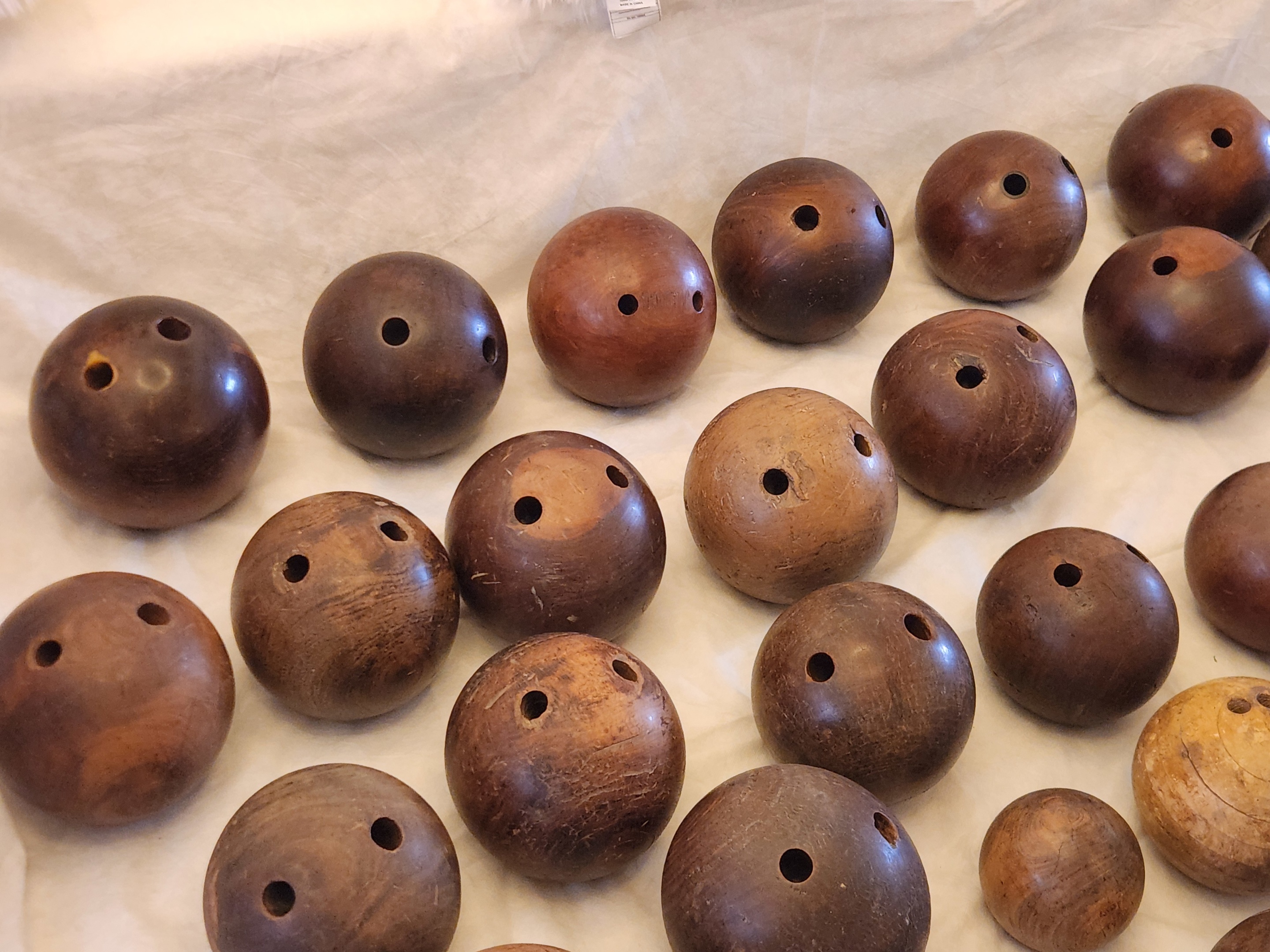 Here is a collection of hardwood turn of the century bowling balls. These are 2 hole and some 3 hole balls. Larger ones were men's. The smaller one's possibly fir the ladies. All showing some lovely