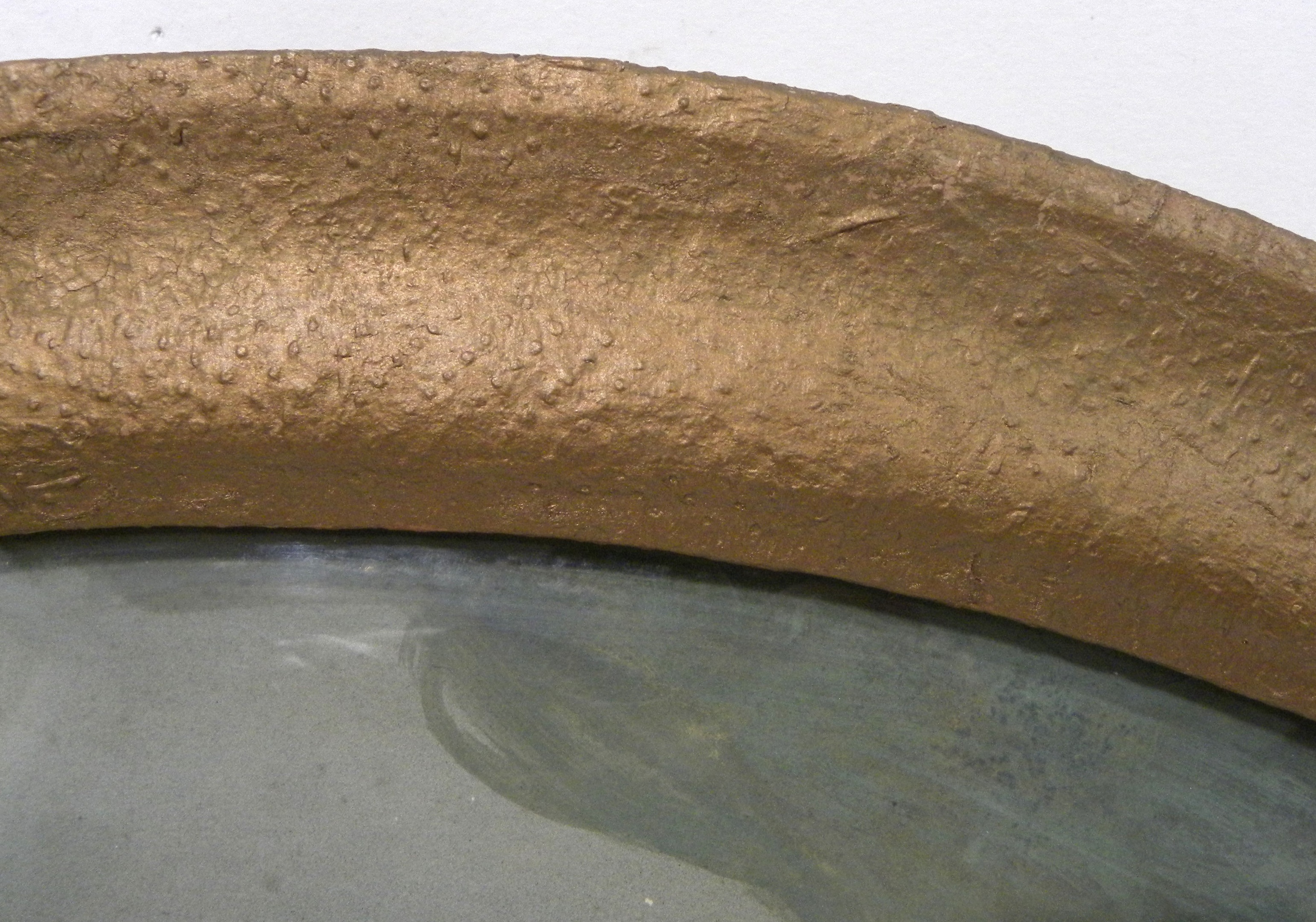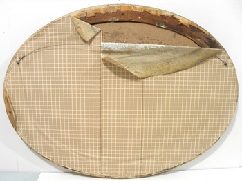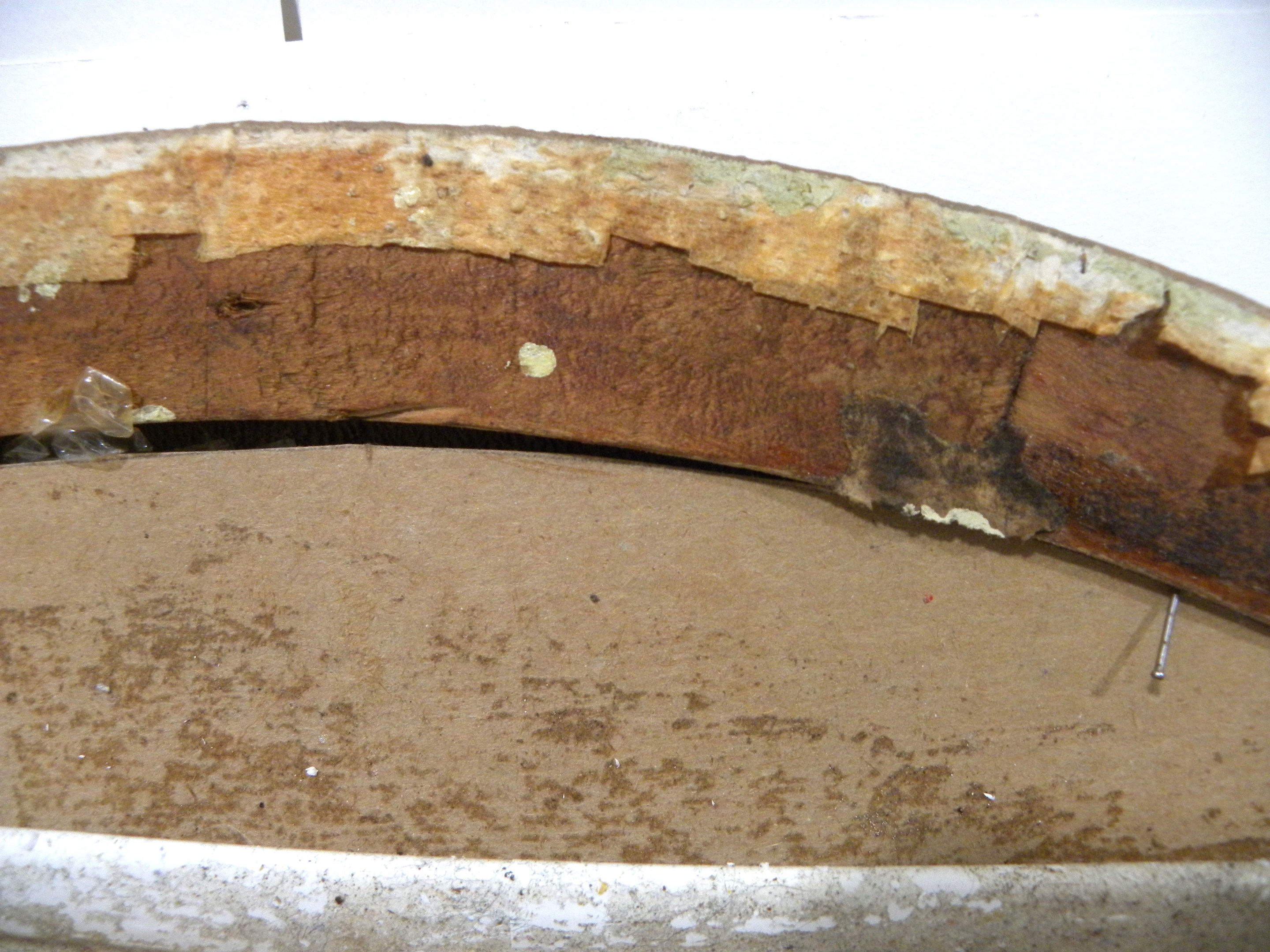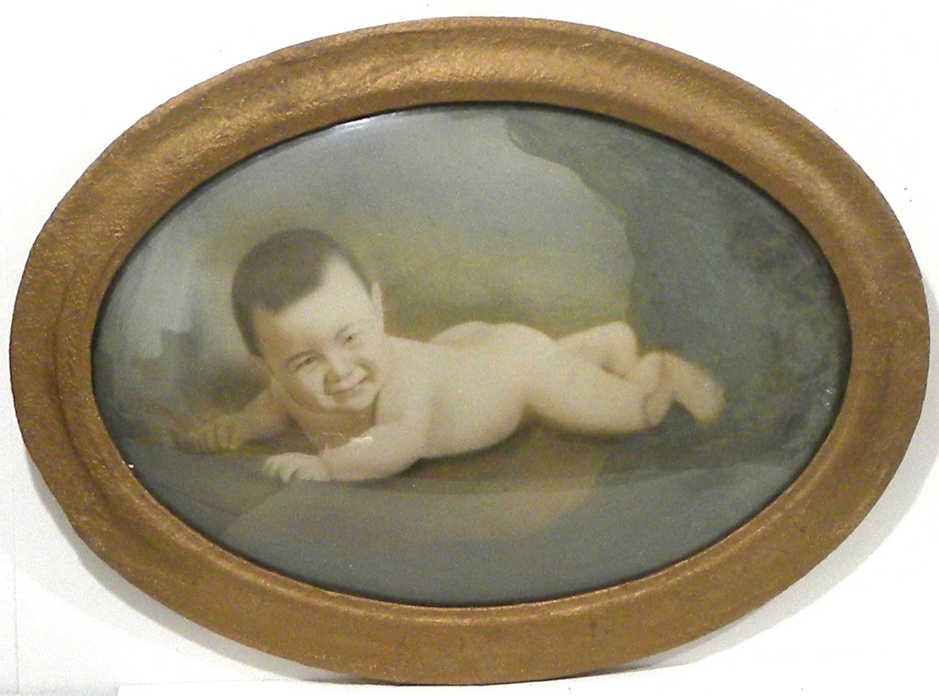 The glass is domed, and the frame has a paper mâché type covering that my mom could have done. The contact paper backing is definitely mom's work, (she covered everything with contact paper!) There's a water stain or something sweeping across the right-side including dad's foot.