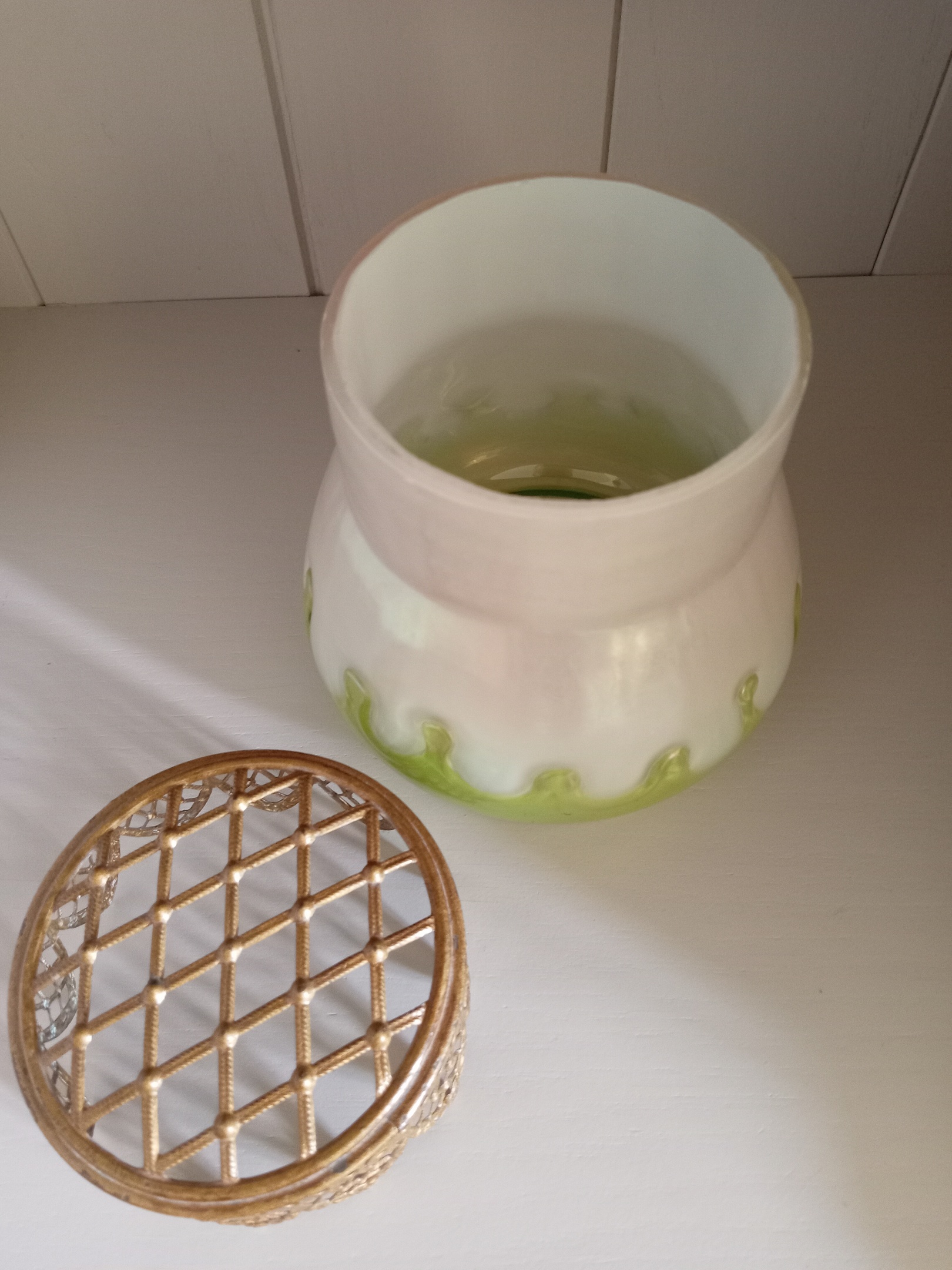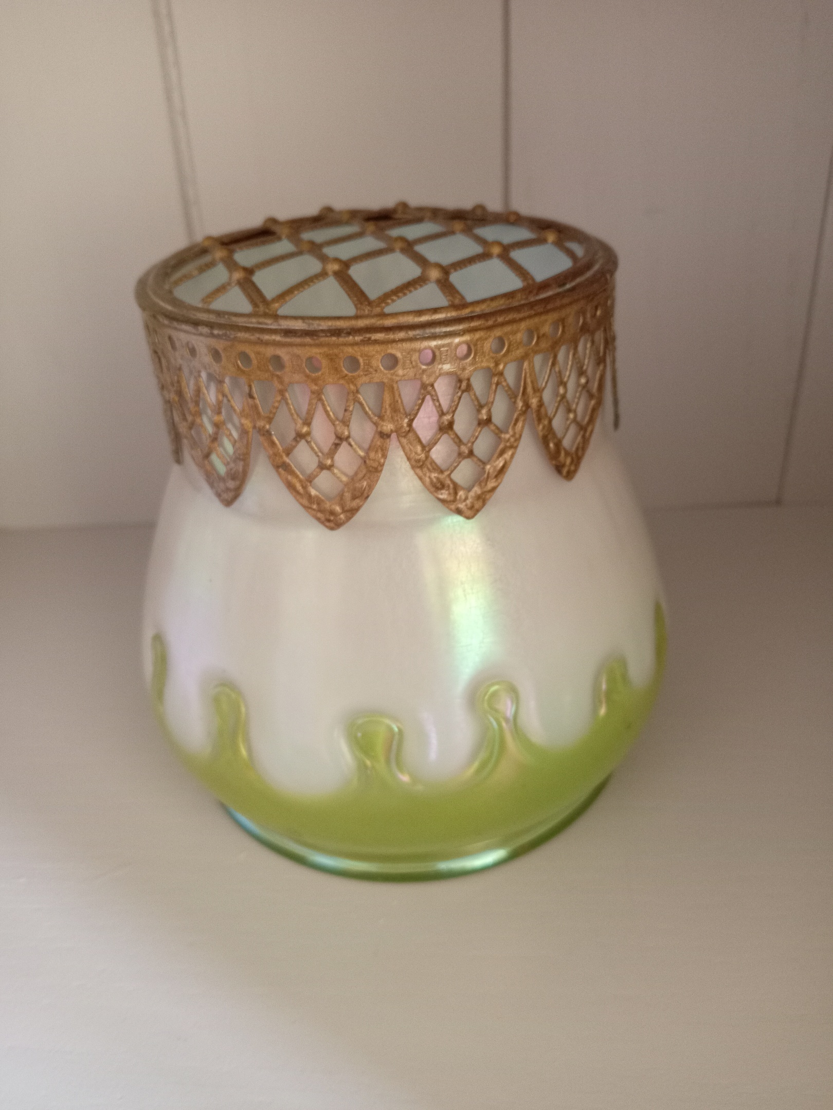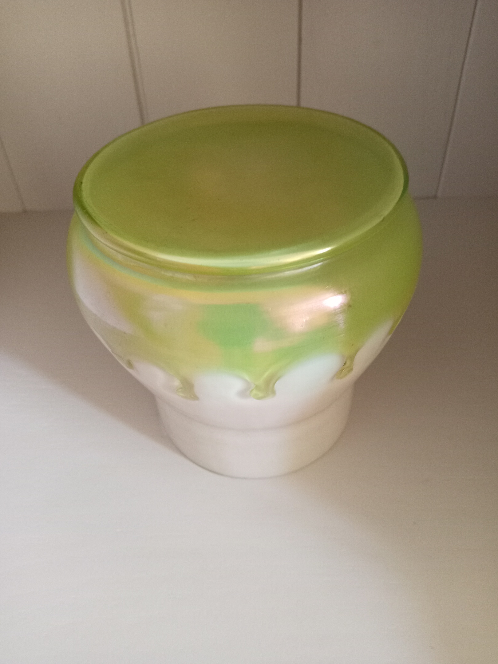 This was listed as being Loetz but I think it is Kralik "Teardrop" decor although I can't find another quite like it. It appears to be clear glass cased on pearl, 5" tall, 5" maximum diameter.
