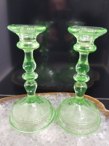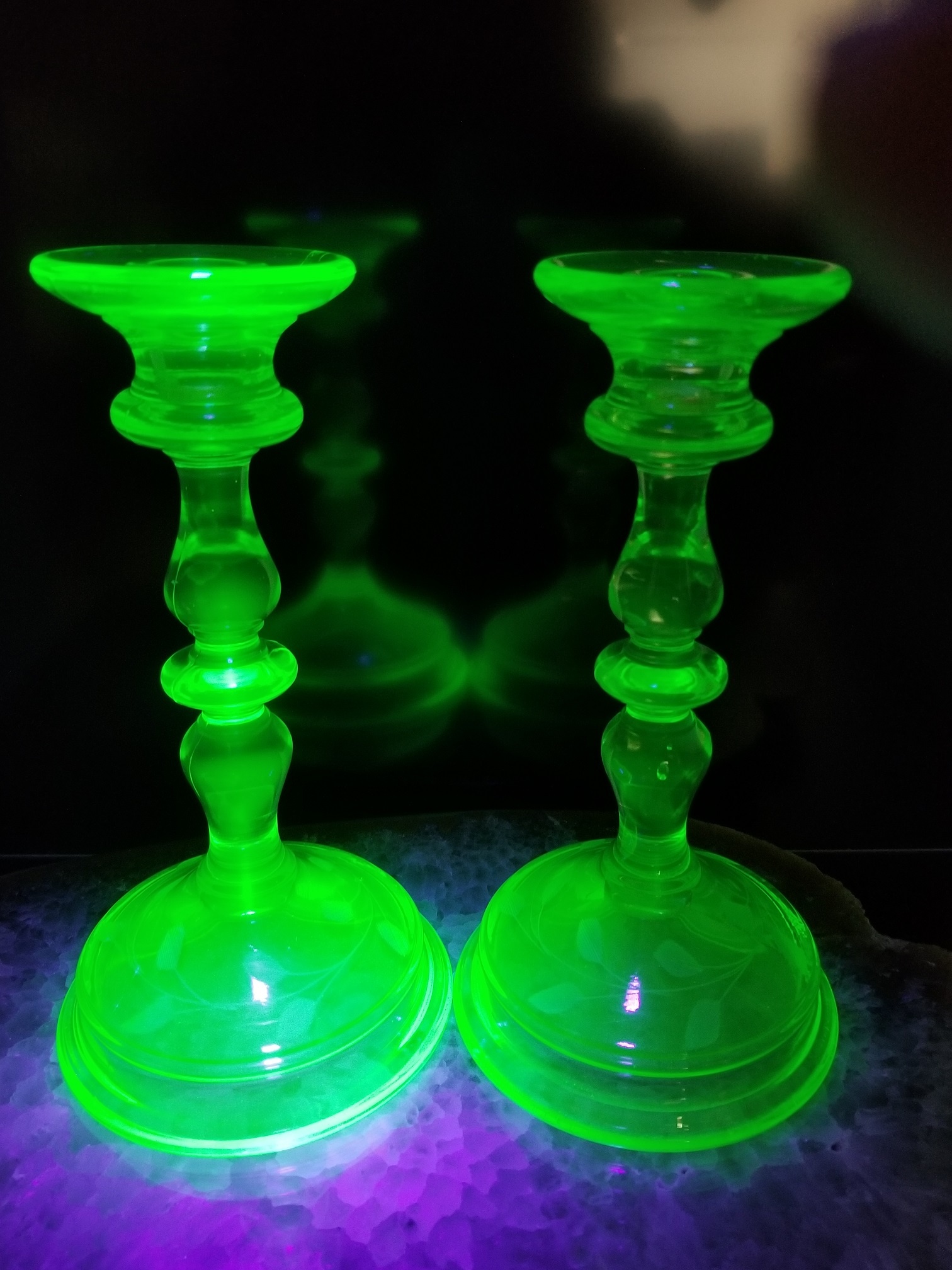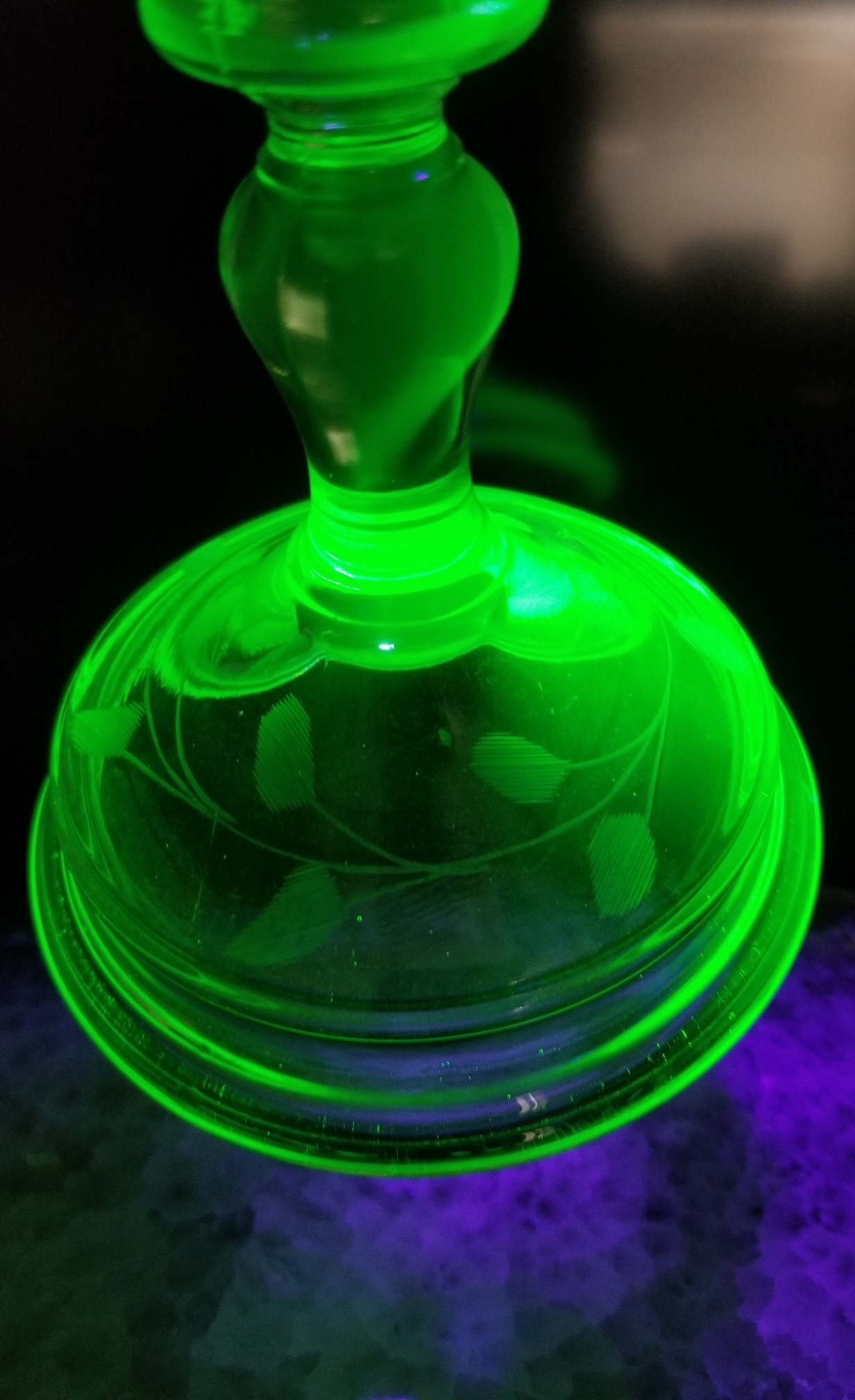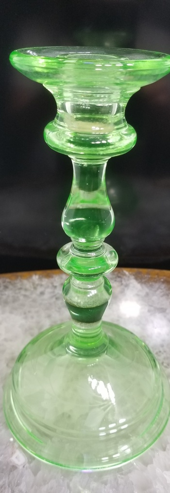 From my mother's estate. It looks like she was holding out on me, I should have had these years ago. The shape of these comes back as U.S. Glass and Paden City Glass as the makers of this particular form. But... they are Uranium Green, which ends up making them U.S. Glass as the maker. They are Wheel cut with a Flower, Vine and Leaves pattern. Without U.V. lighting, they are light green and look a lot like Bottle Glass Green. It doesn't take much U.V. to make them shine bright. I really like this pair, Thanks mom.