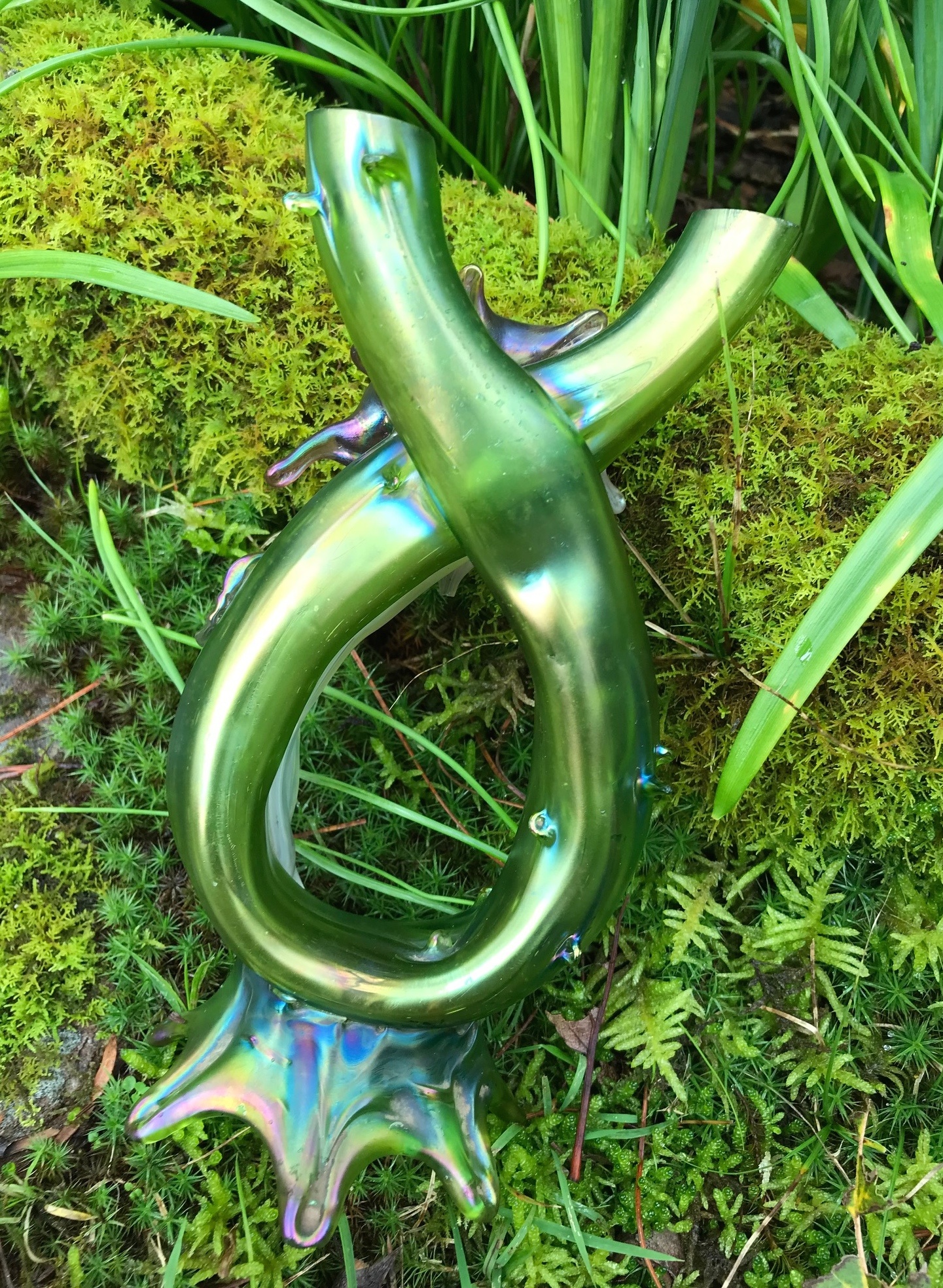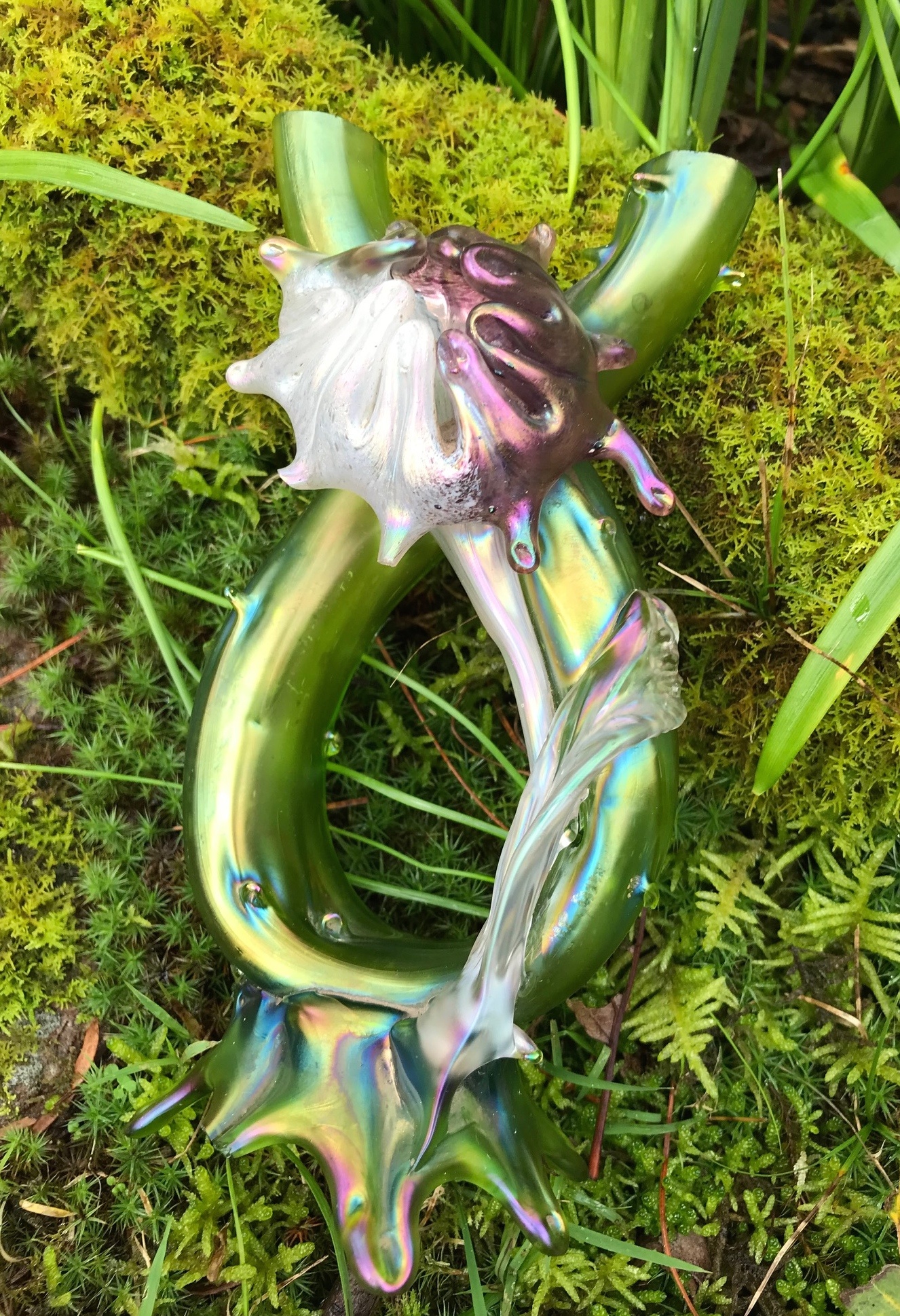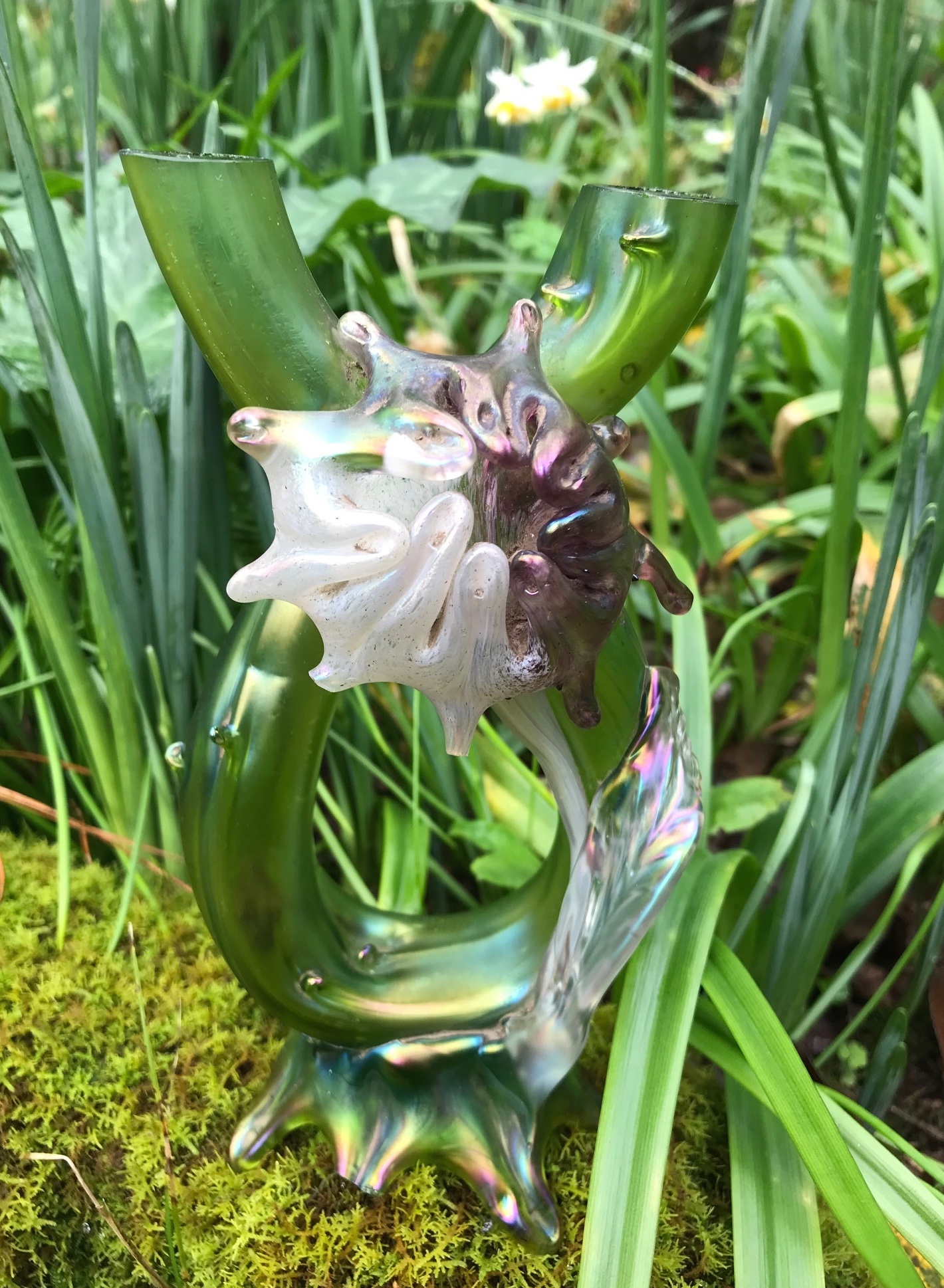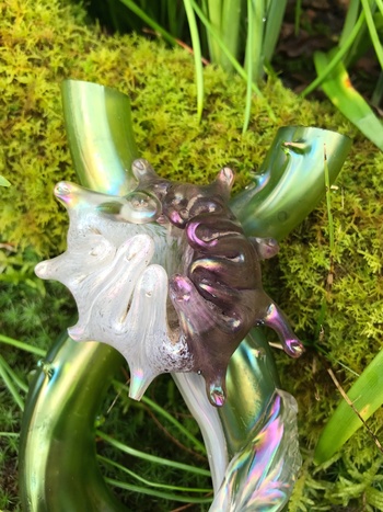 This is a particularly cool double tube thorn vase made from green glass with an intense iridescent finish. There is an applied flower, the likes of which I've never seen before - it has to be based on a carnivorous plant of some sort (or else Kralik was employing alien glass makers).