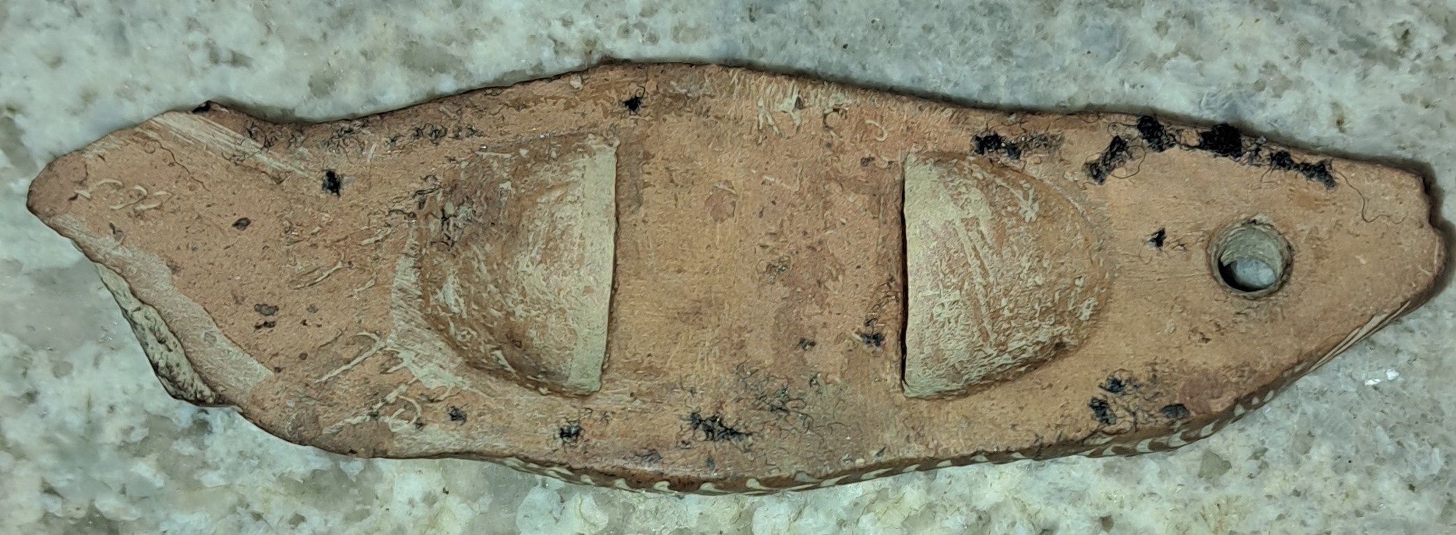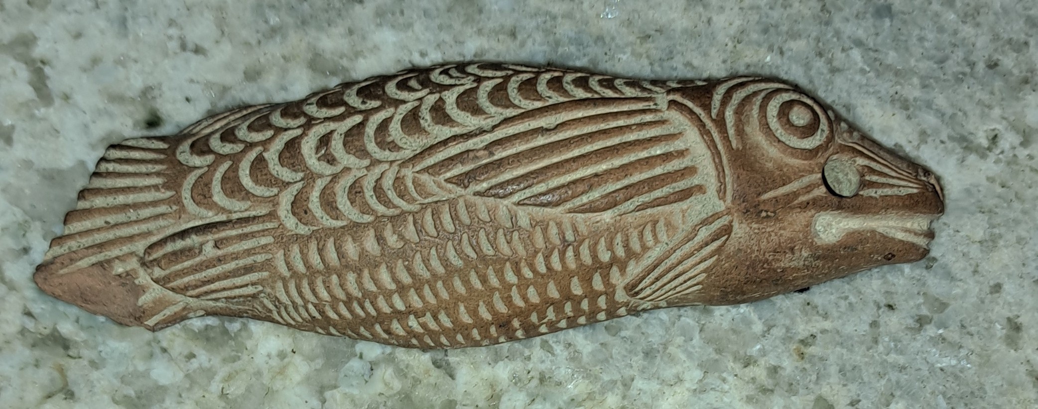 This fish is made out of terracotta I believe. It is about 5 inches long and 1 1/2 inches wide. It has some writing on back but very hard to make out.