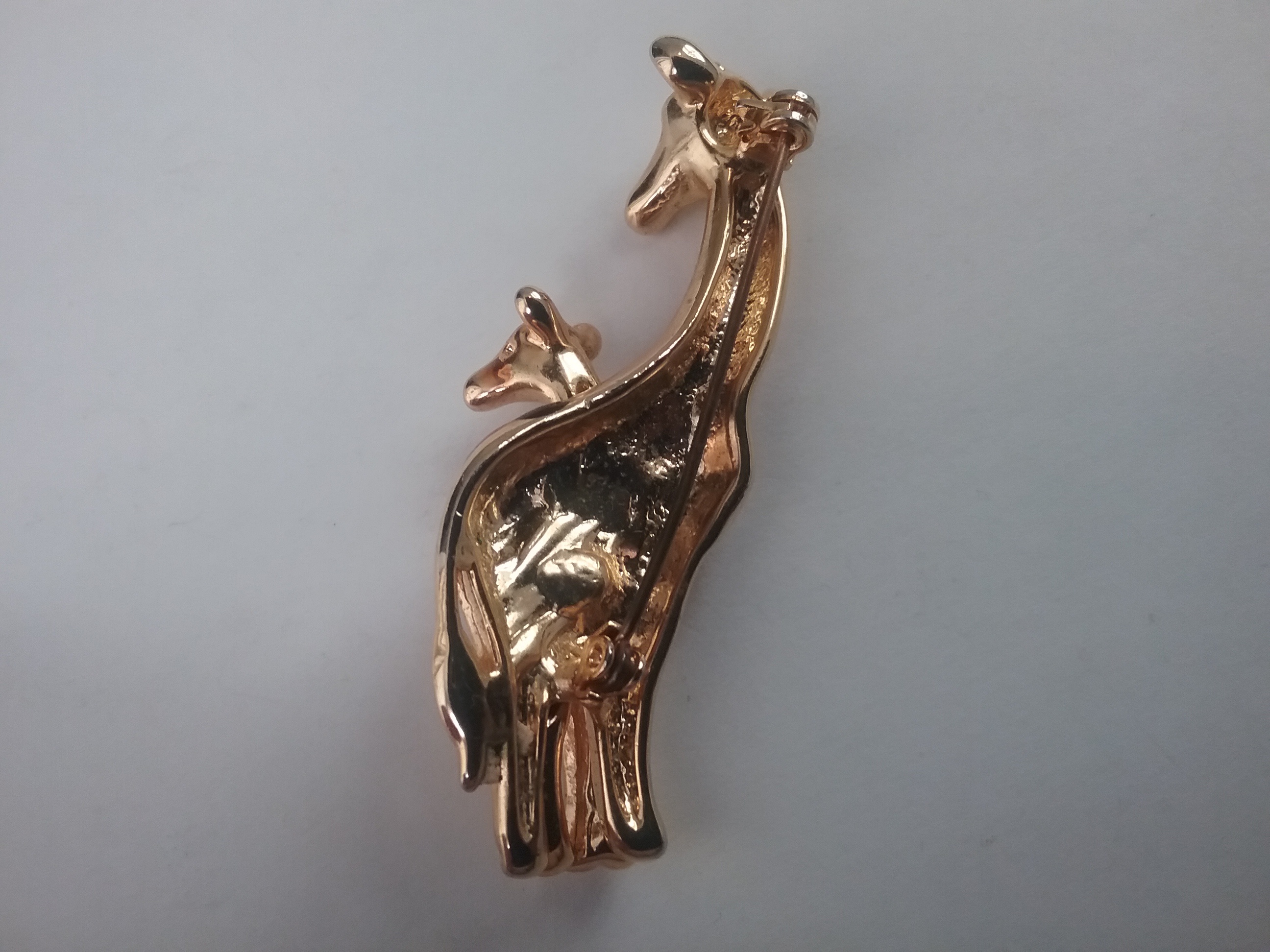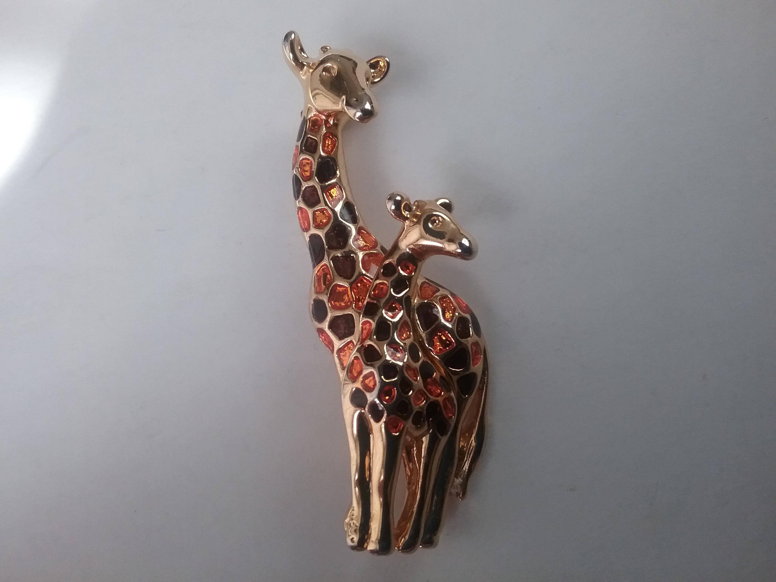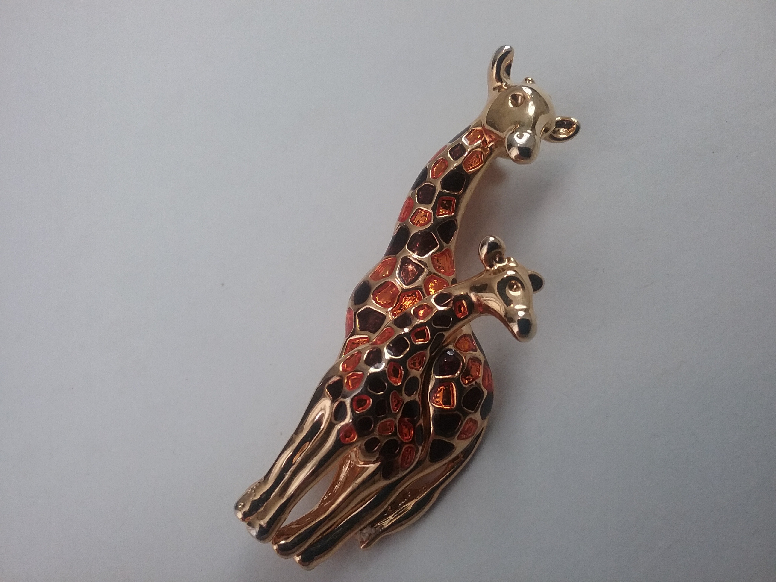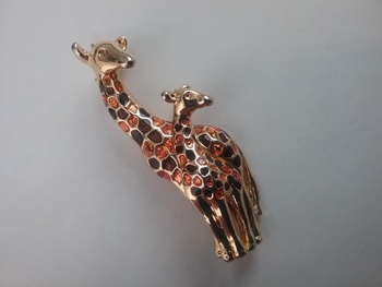 This 2 1-2"L goldtone brooch shows a pair of giraffes with body pattern of pearly orange & brown, and both with tiny rhinestone eyes. By fashion designer Anne Klein ca the 1990s