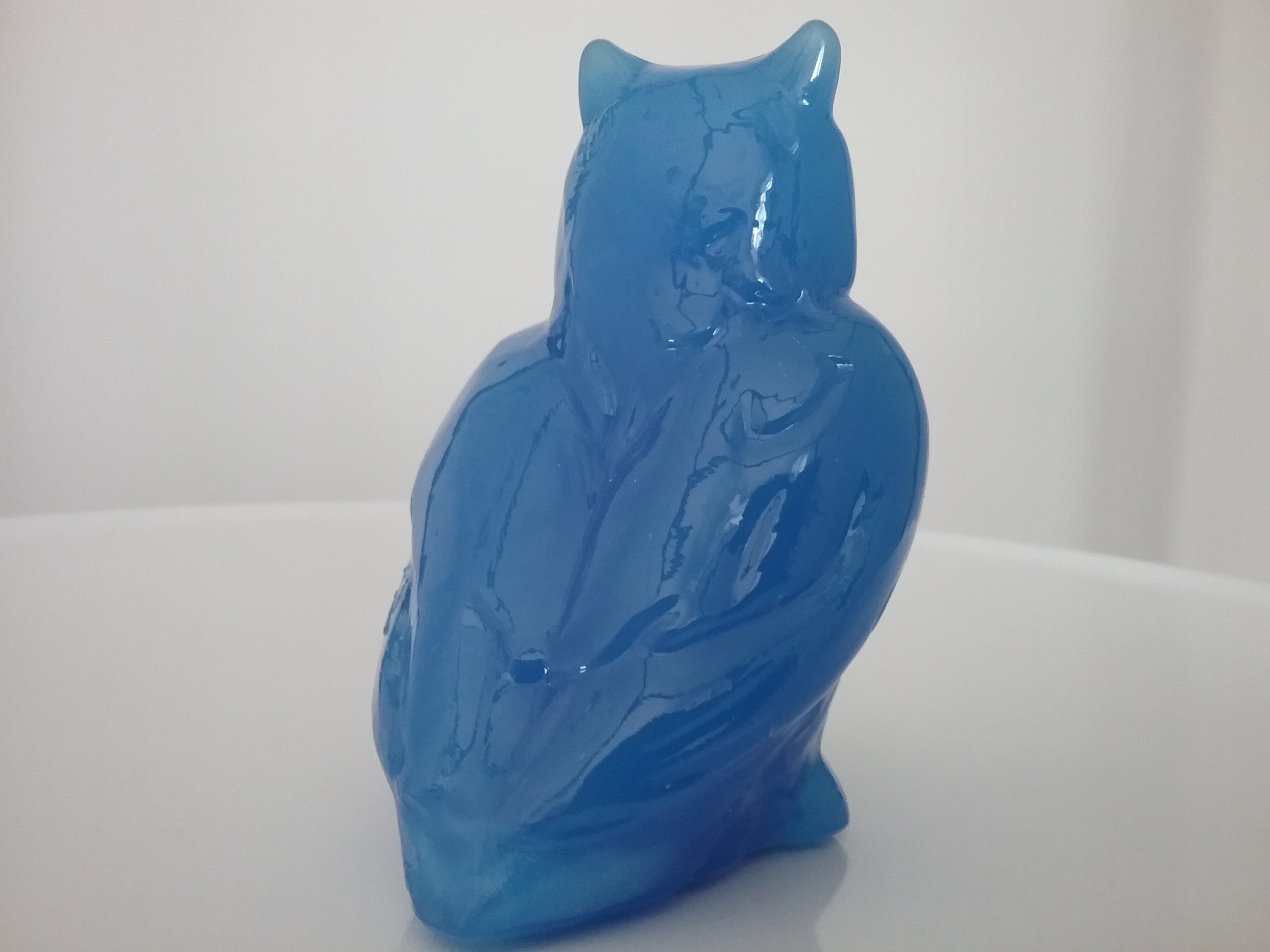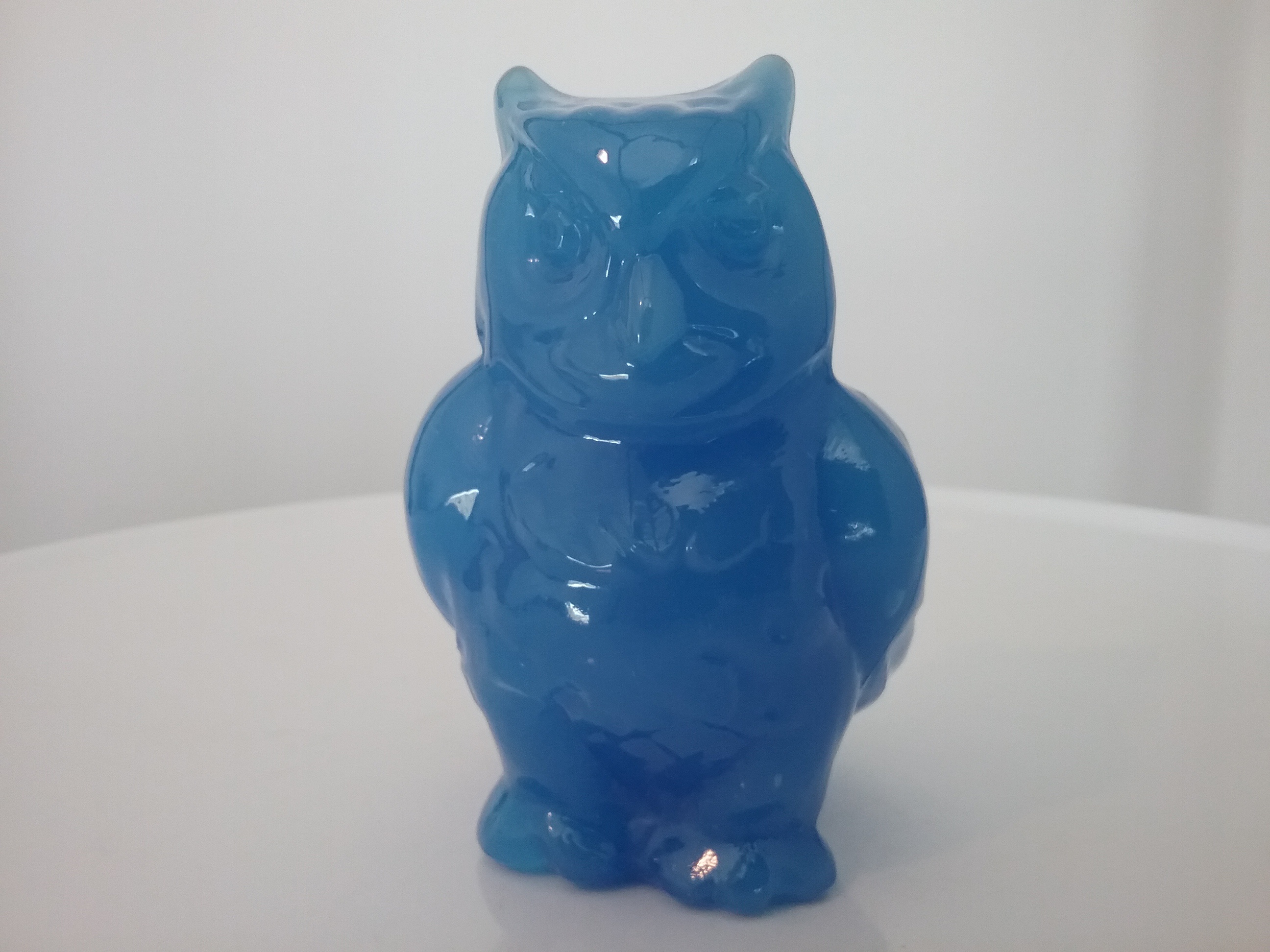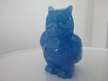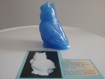 Here is a 4"H opaline blue glass owl that was named the Hoot Less Owl, item #18, by Imperial Glass from the 50s-60s. Reissued in the early 1980s when Arthur Lorch owned Imperial, with raised ALIG imprint on the owl's side feather (as seen in 4th photo, also excerpt from book Glass Animals by Spencer)