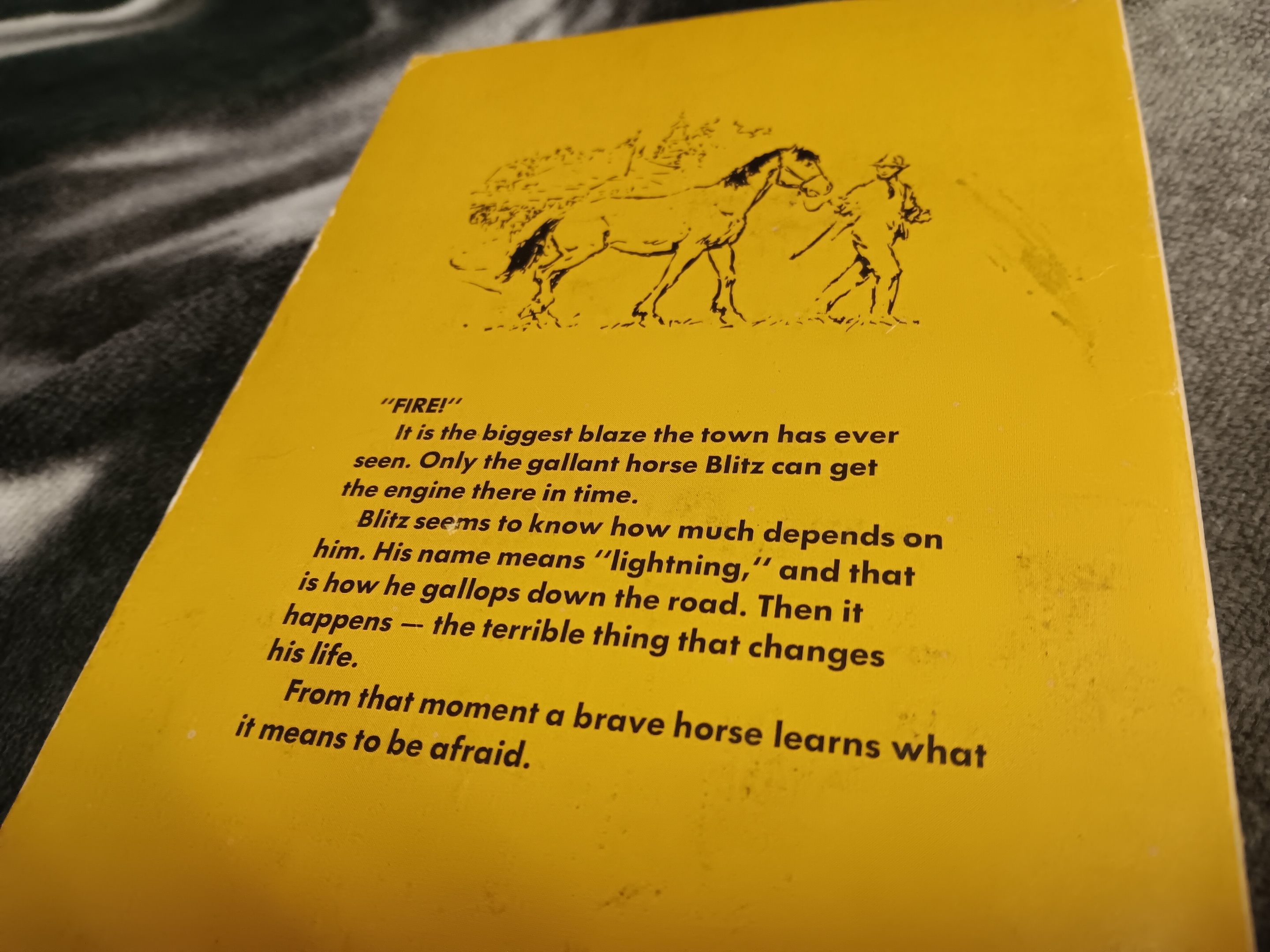 BLITZ IS A STORY ABOUT A HORSE THAT LIVES IN A TOWN CALLED DRUMLIN. HIS MAIN JOB AND PURPOSE WAS TO PULL THE WAGONS FOR THE FIRE BRIGADE TO FIGHT FIRES.