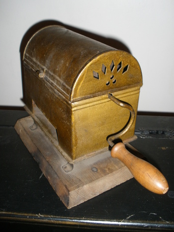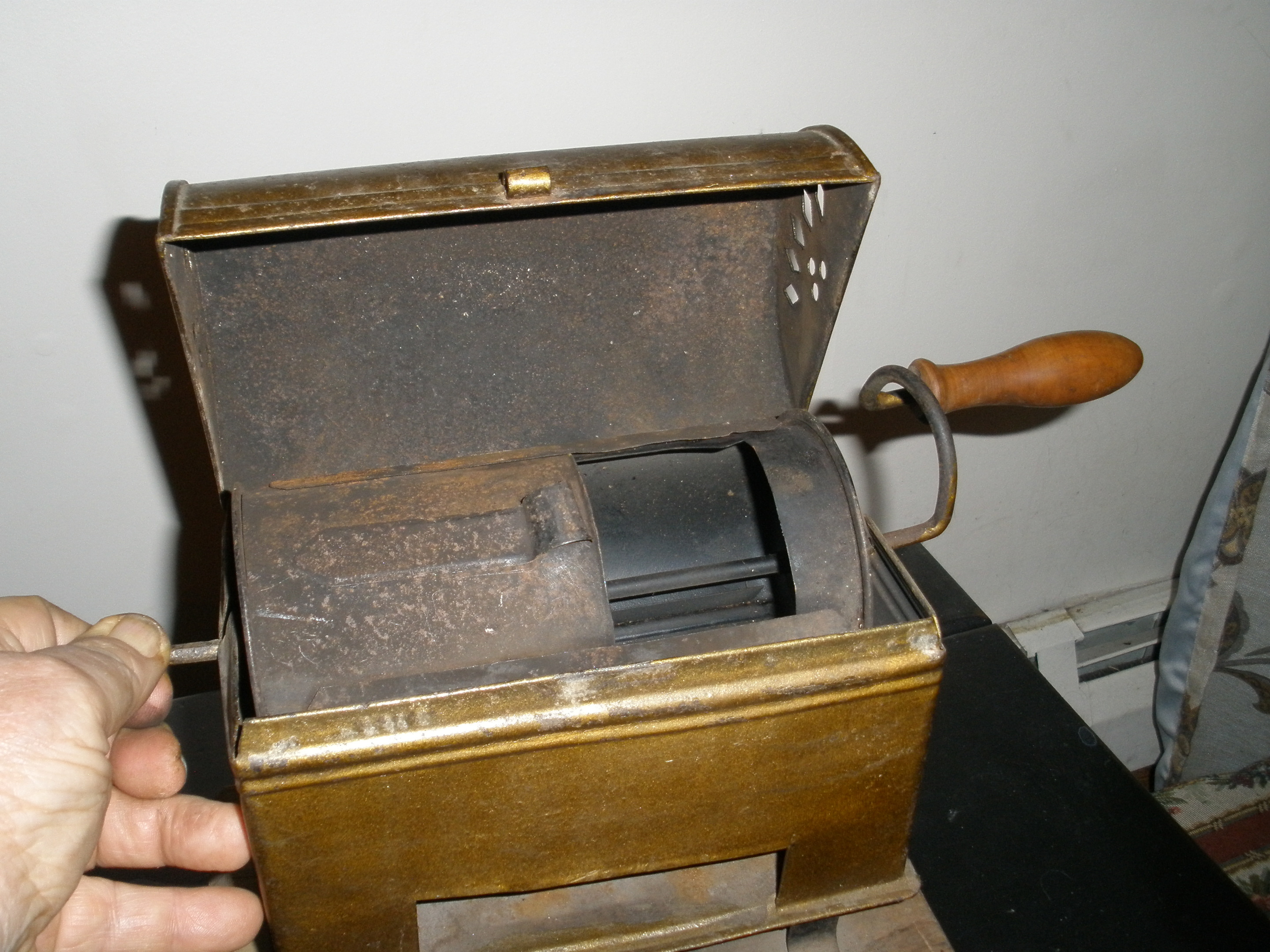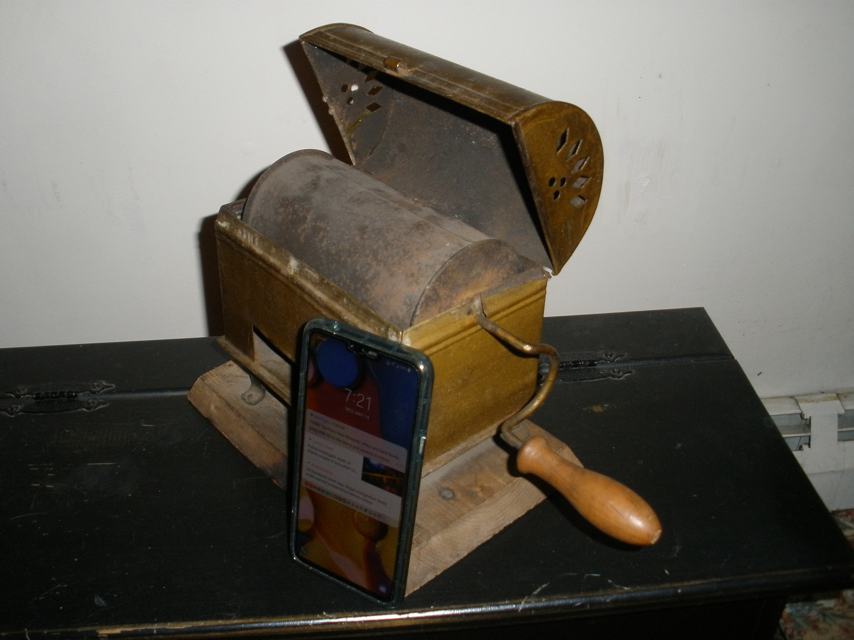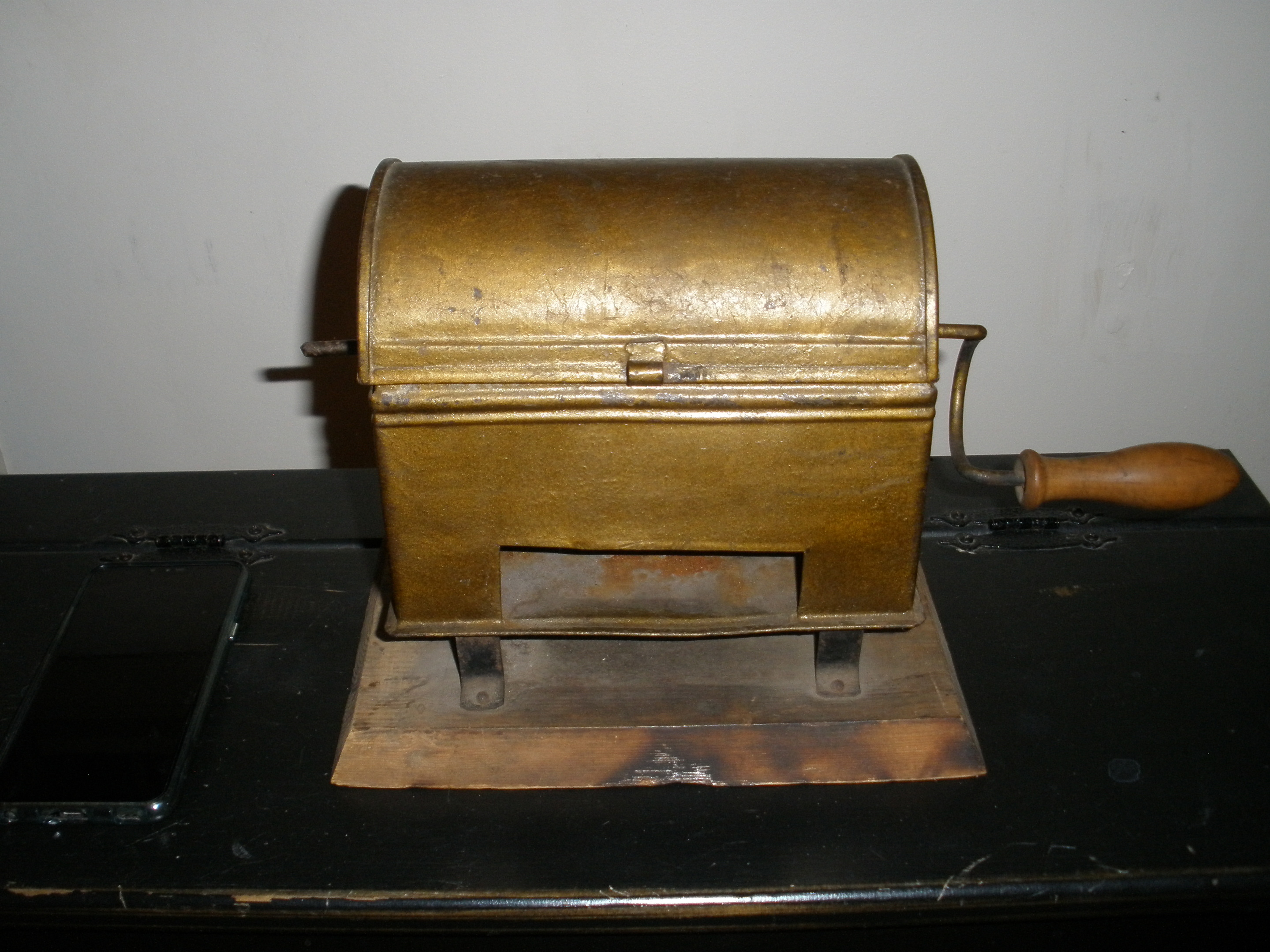 small coffee roaster, about 8" wide by 5" deep by 7" tall. Probably fired with charcoal, but coal embers could also be used. Hand cranked until the coffee is roasted. It looks as though one pound of coffee beans can be roasted at a time. Primitive, but effective. It could have been used by soldiers in the civil war.