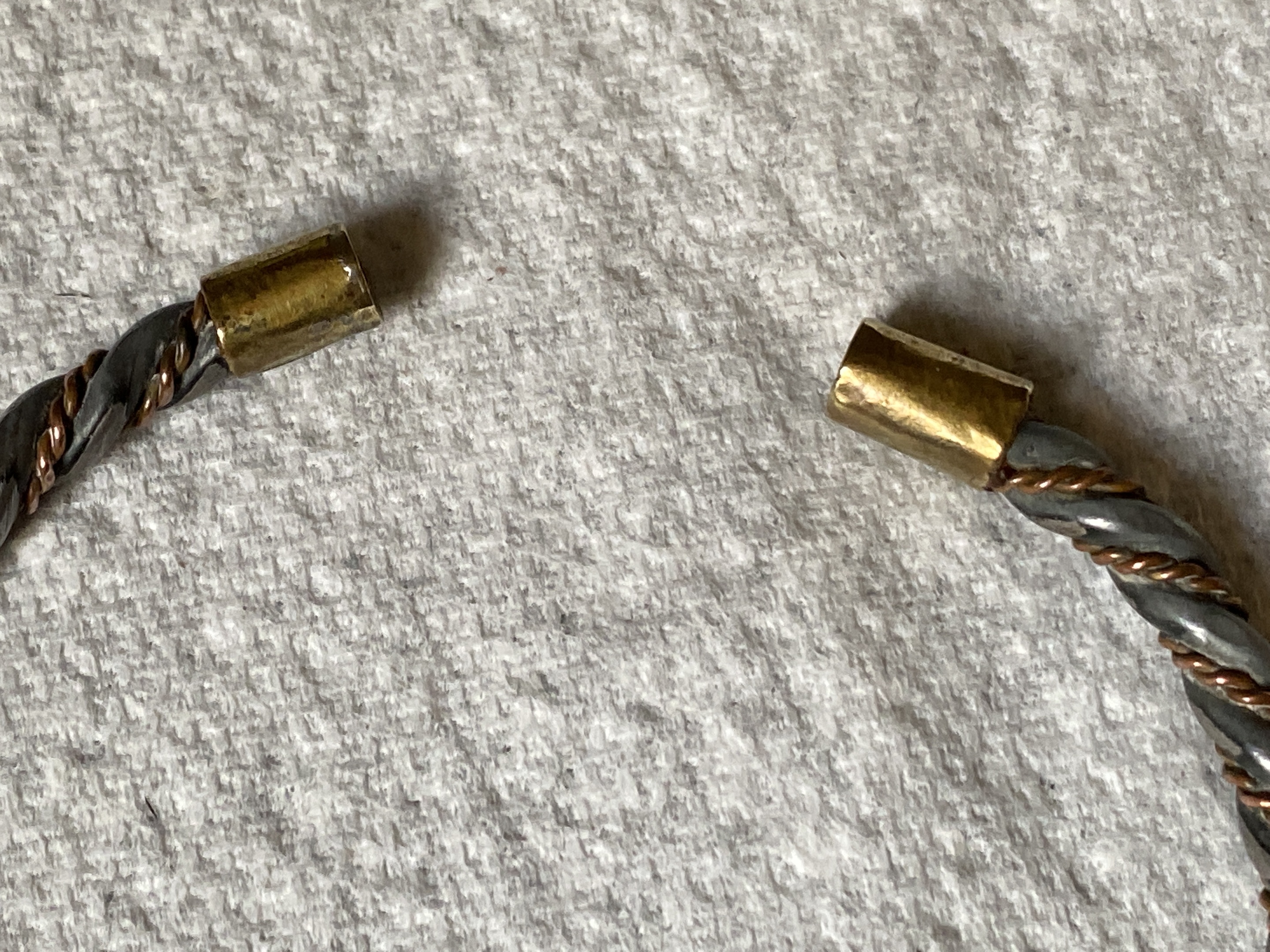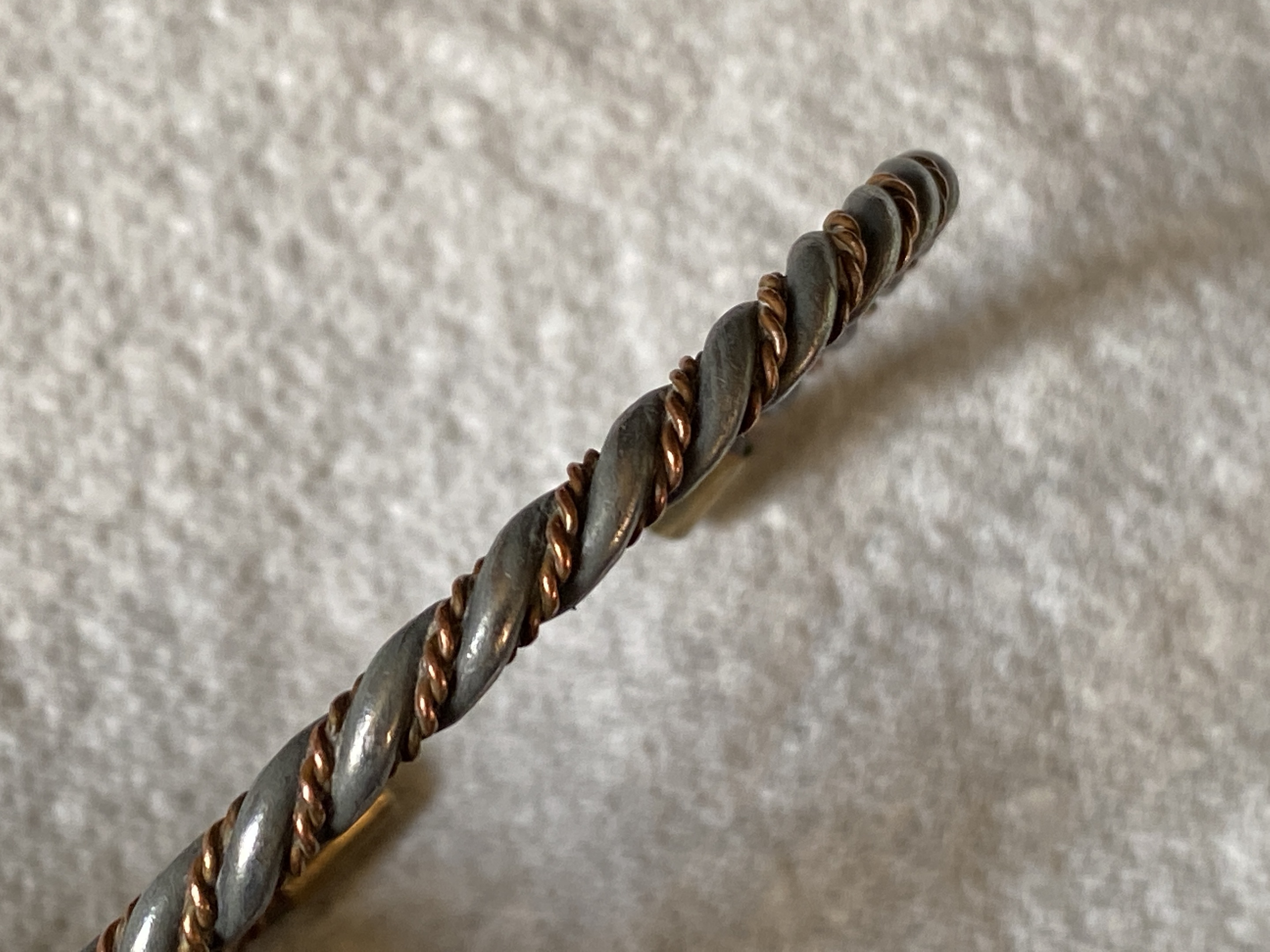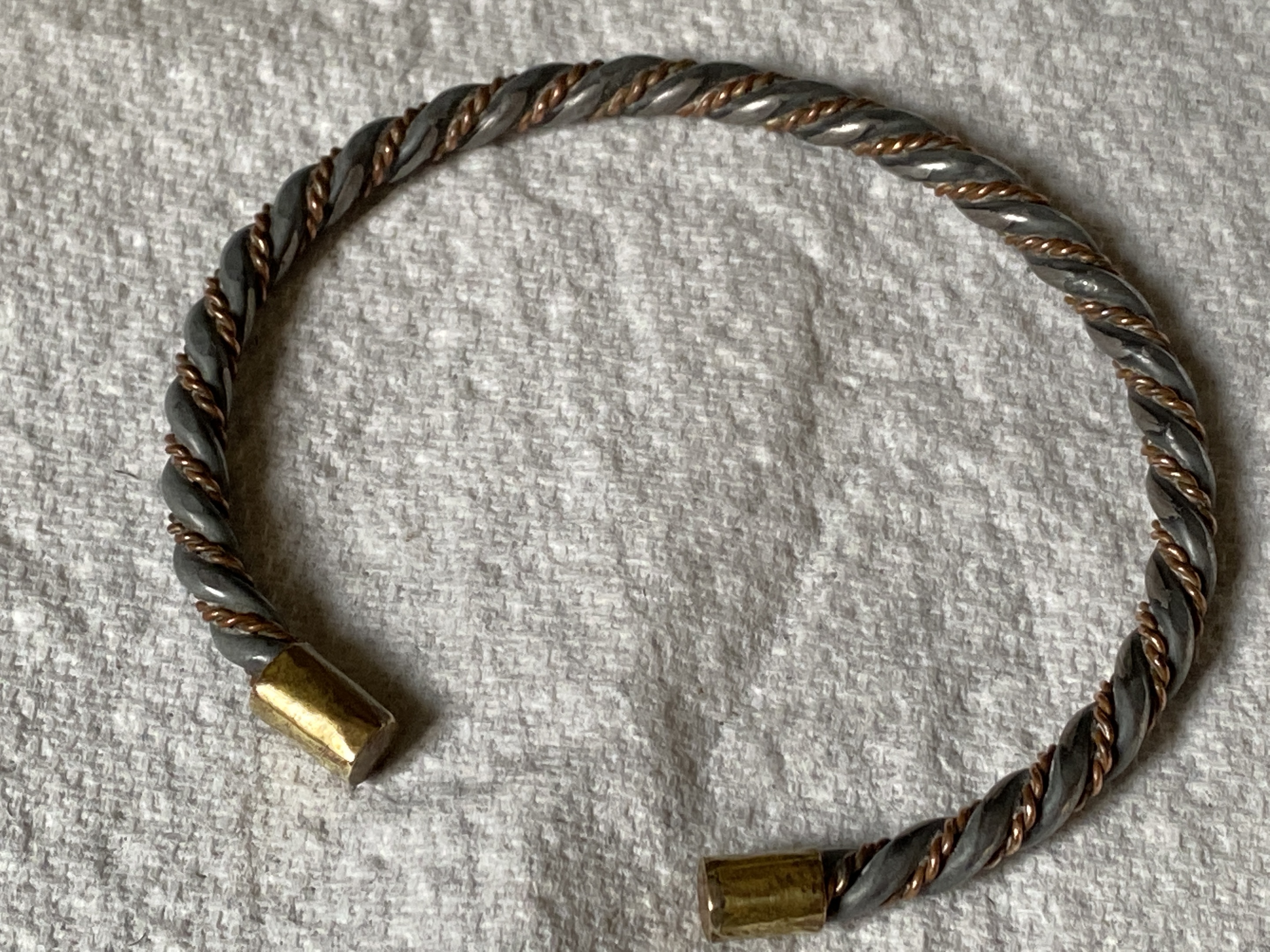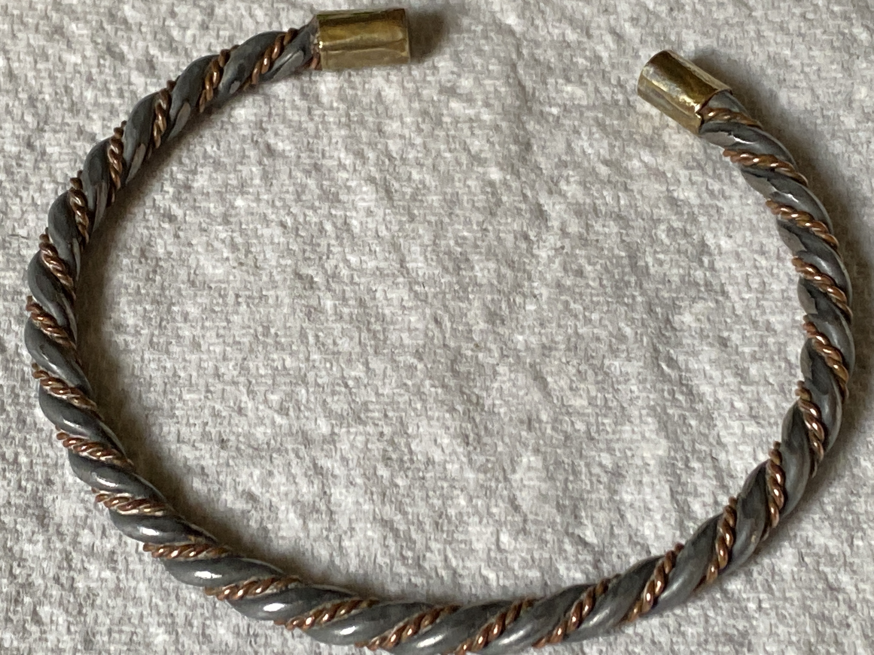 Hello I’ve just rediscovered this lovely Bangle, no idea how old it is or where it’s from.no idea of what the metals are , looks interesting and is heavy and solid, I’m wondering if it’s a man’s