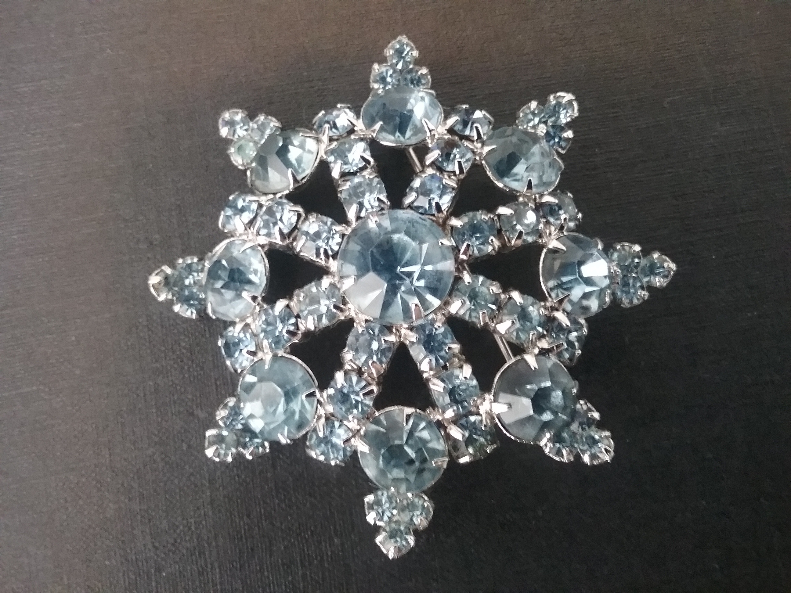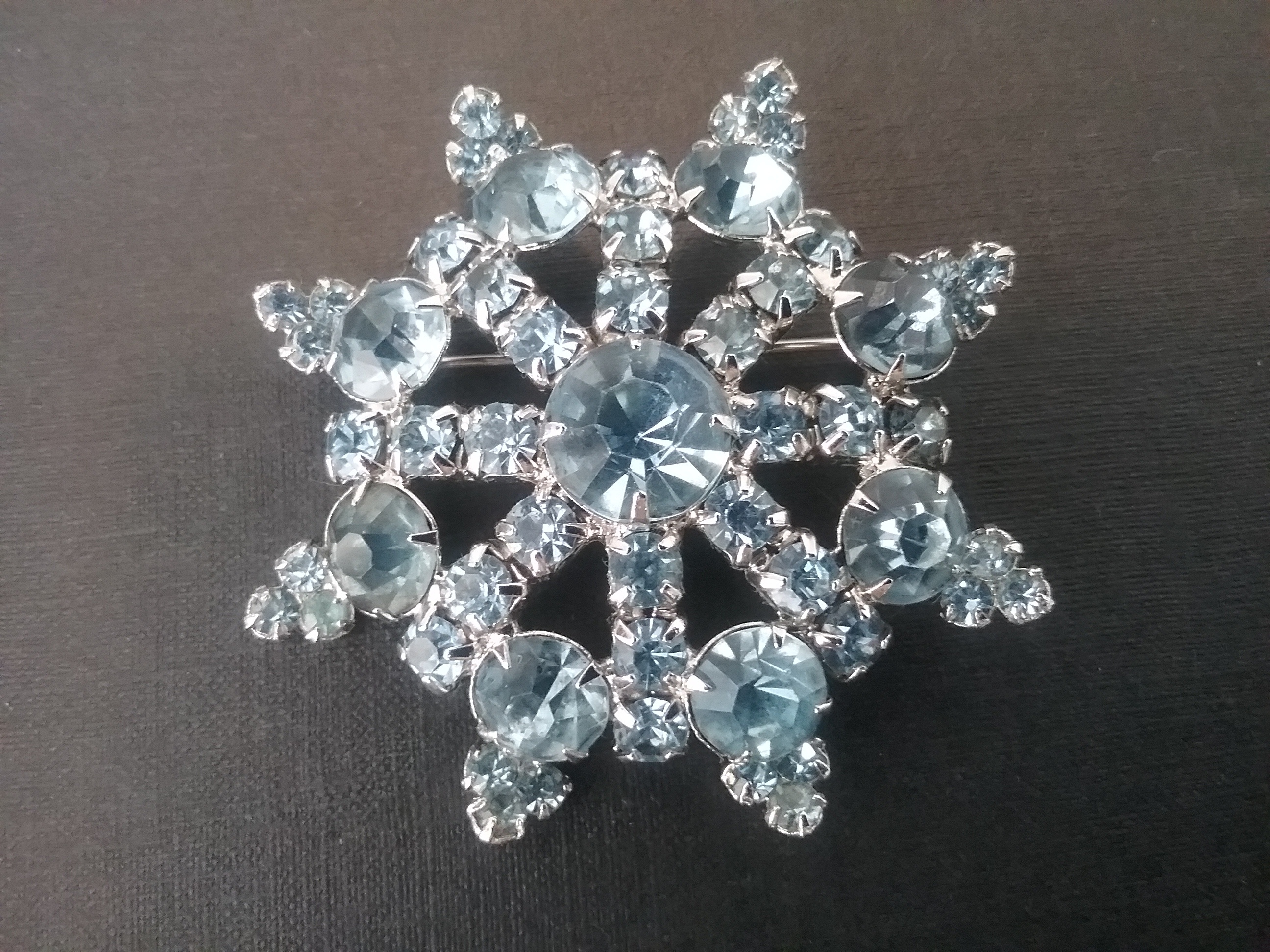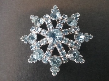 This 2" silvertone brooch has various size round light blue rhinestones and is shaped like a ship's wheel. By Continental of Canada ca 1950s, marked on back