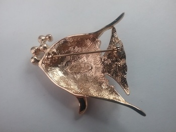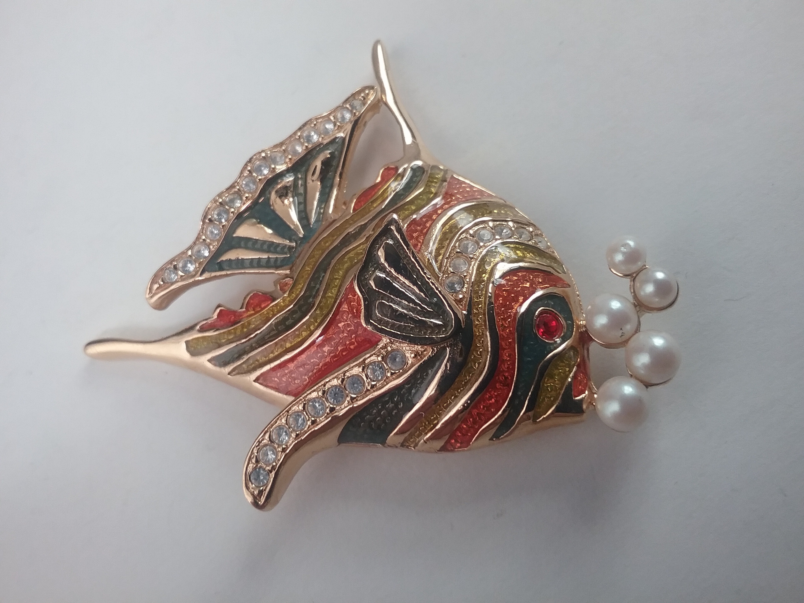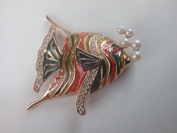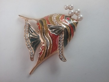This 2" goldtone angelfish brooch has shiny green, orange & gold enamel stripes, small white rhinestone accents & one red eye, with faux pearl 'bubbles' coming up from its mouth. Signed Bob Mackie in oval on back, from the 1990s